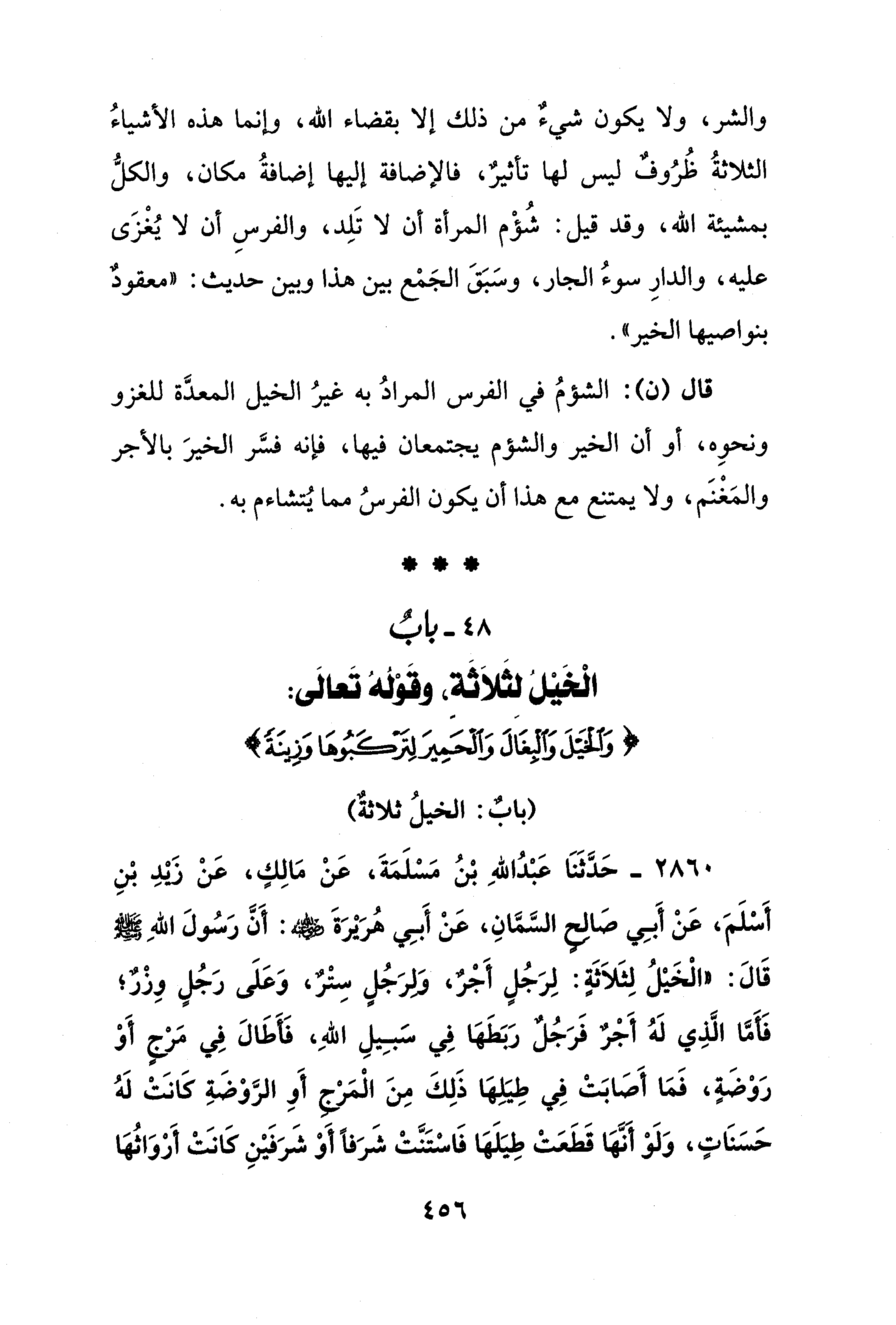 قال (ن): الشؤمُ في الفرس المرادُ به غيرُ الخيل المعدَّة للغزو ونحوِه، أو أن الخير والشؤم يجتمعان فيها، فإنه فسَّر الخيرَ بالأجر والمَغْنَم، ولا يمتنع مع هذا أن يكون الفرسُ مما يُتشاءم به.