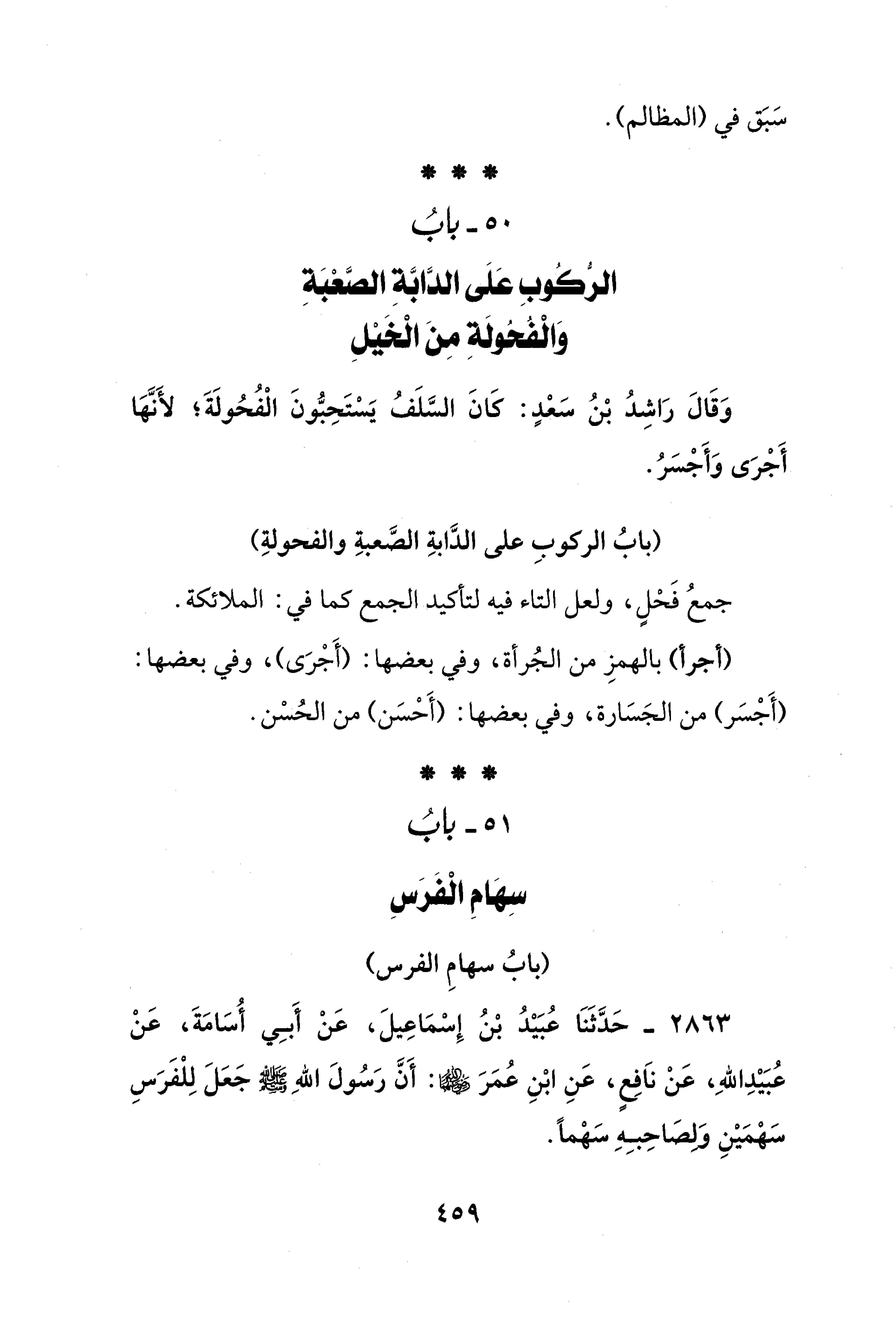 2863 - حَدَّثَنَا عُبَيْدُ بْنُ إِسْمَاعِيلَ، عَنْ أَبِي أُسَامَةَ، عَنْ عُبَيْدِ اللهِ، عَنْ نَافِعٍ، عَنِ ابْنِ عُمَرَ - رضي الله عنهما -: أَنَّ رَسُولَ اللهِ - صلى الله عليه وسلم - جَعَلَ لِلْفَرَسِ سَهْمَيْنِ وَلِصَاحِبِهِ سَهْمًا.