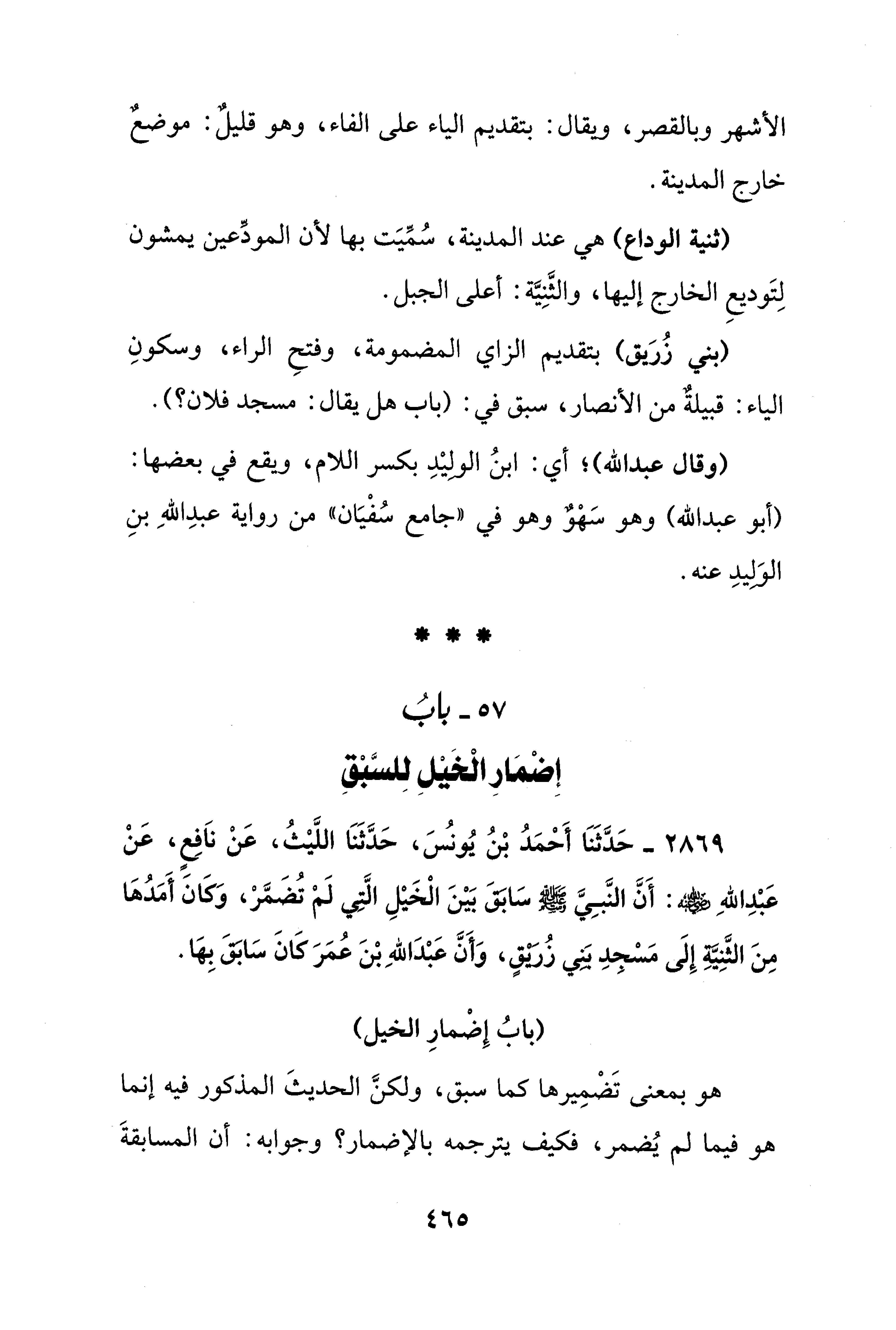 2869 - حَدَّثَنَا أَحْمَدُ بْنُ يُونُسَ، حَدَّثَنَا اللَّيْثُ، عَنْ نَافِعٍ، عَنْ عَبْدِ اللهِ - رضي الله عنه -: أَنَّ النَّبِيَّ - صلى الله عليه وسلم - سَابَقَ بَيْنَ الْخَيْلِ الَّتِي لَمْ تُضَمَّرْ، وَكَانَ أَمَدُهَا مِنَ الثَّنِيَّةِ إِلَى مَسْجدِ بَنِي زُرَيقٍ، وَأَنَّ عَبْدَ اللهِ بْنَ عُمَرَ كَانَ سَابَقَ بِهَا.