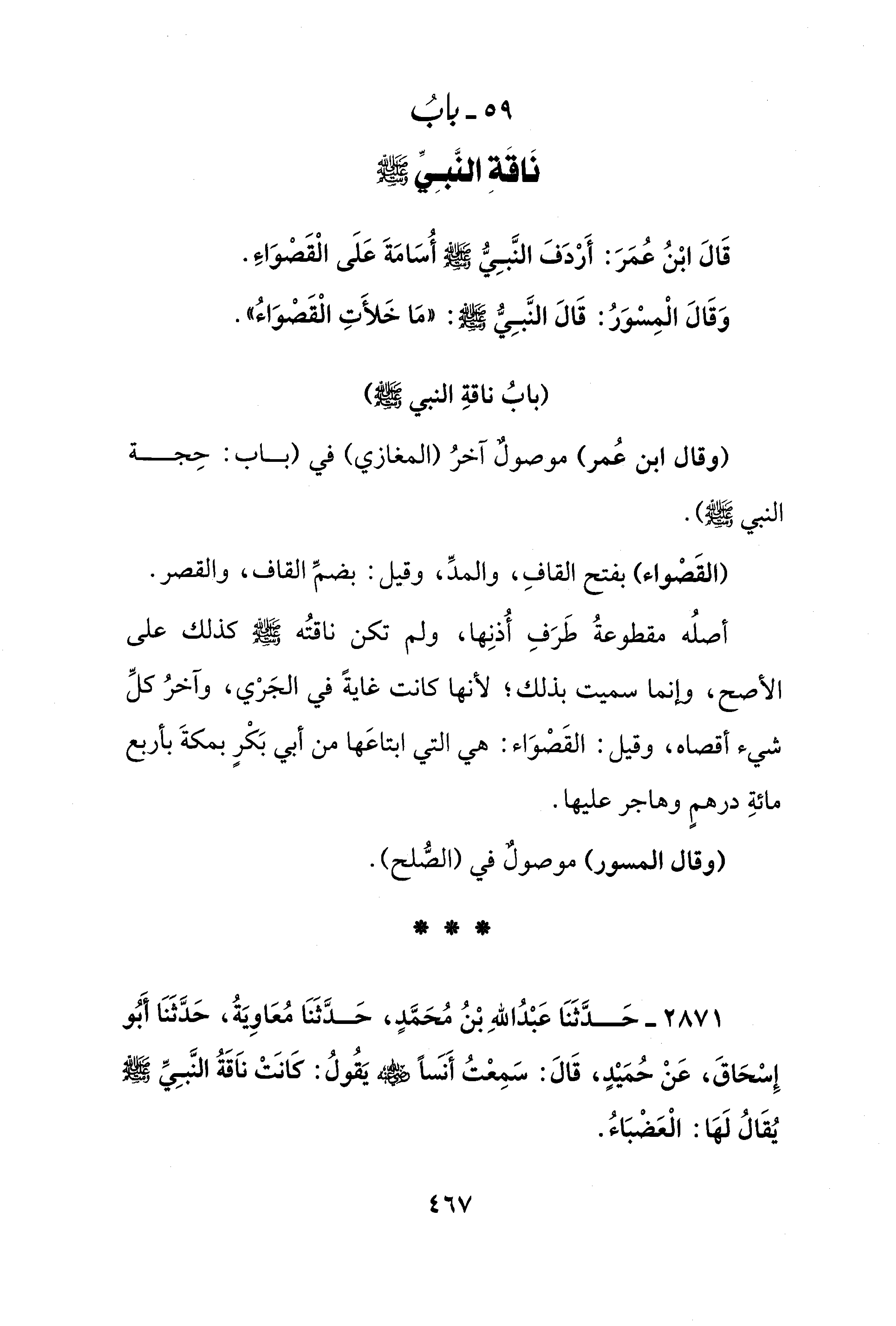 2871 - حَدَّثَنَا عَبْدُ اللهِ بْنُ مُحَمَّدٍ، حَدَّثَنَا مُعَاوِيَةُ، حَدَّثَنَا أَبُو إِسْحَاقَ، عَنْ حُمَيْدٍ، قَالَ: سَمِعْتُ أَنَسًا - رضي الله عنه - يَقُولُ: كَانَتْ ناَقَةُ النَّبِيِّ - صلى الله عليه وسلم - يُقَالُ لَهَا: الْعَضْبَاءُ.