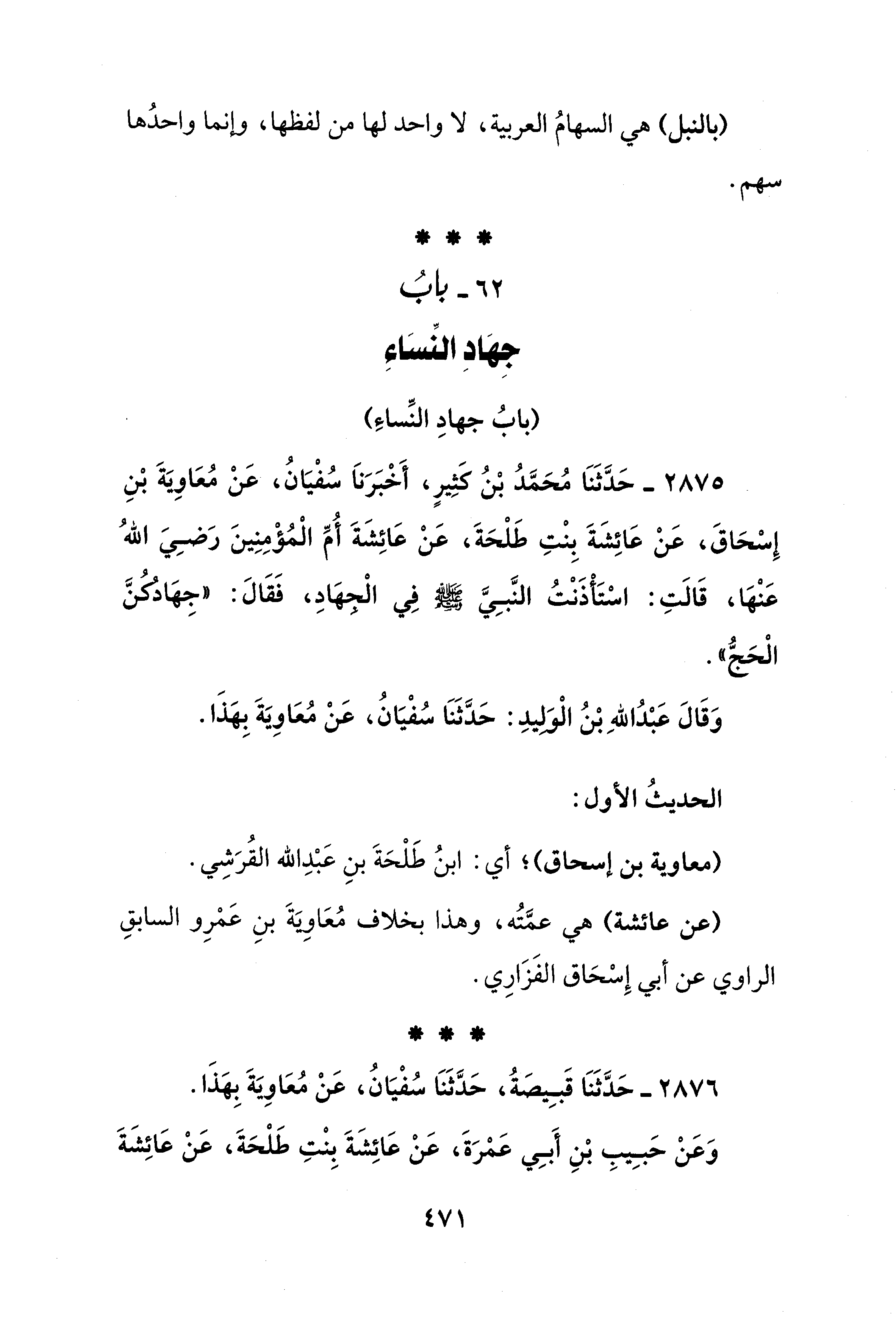 2875 - حَدَّثَنَا مُحَمَّدُ بْنُ كَثِيرٍ، أَخْبَرَنَا سُفْيَانُ، عَنْ مُعَاوِيَةَ بْنِ إِسْحَاقَ، عَنْ عَائِشَةَ بِنْتِ طَلْحَةَ، عَنْ عَائِشَةَ أُمِّ الْمُؤْمِنِينَ رَضِيَ اللهُ عَنْهَا، قَالَتِ: اسْتَأذَنْتُ النَّبِيَّ - صلى الله عليه وسلم - فِي الْجهَادِ، فَقَالَ: "جِهَادُكُنَّ الْحَجُّ".