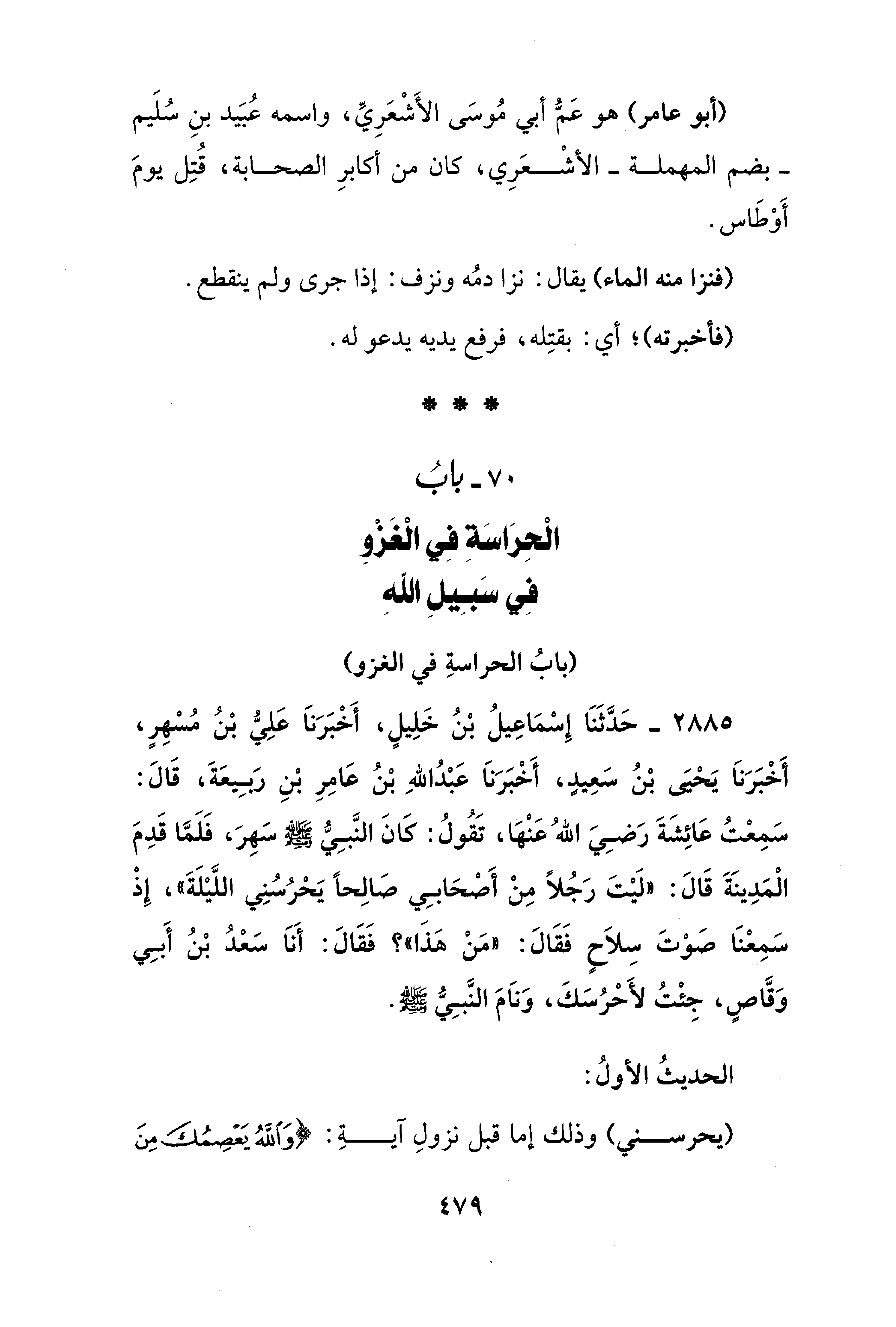 2885 - حَدَّثَنَا إِسْمَاعِيلُ بْنُ خَلِيلٍ، أَخْبَرَنَا عَلِي بْنُ مُسْهِرٍ، أَخْبَرَنَا يَحْيَى بْنُ سَعِيدٍ، أَخْبَرَنَا عَبْدُ اللهِ بْنُ عَامِرِ بْنِ رَبِيعَةَ، قَالَ: سَمِعْتُ عَائِشَةَ رَضِيَ اللهُ عَنْهَا، تَقُولُ: كَانَ النَّبِيُّ - صلى الله عليه وسلم - سَهِرَ، فَلَمَّا قَدِمَ الْمَدِينَةَ قَالَ: "لَيْتَ رَجُلًا مِنْ أَصْحَابِي صَالِحًا يَحْرُسُنِي الليْلَةَ"، إِذْ سَمِعْنَا صَوْتَ سِلاَحٍ فَقَالَ: "مَنْ هَذَا"؟ فَقَالَ: أَناَ سَعْدُ بْنُ أَبِي وَقَّاصٍ، جِئْتُ لأَحْرُسَكَ، وَناَمَ النَّبِي - صلى الله عليه وسلم -.