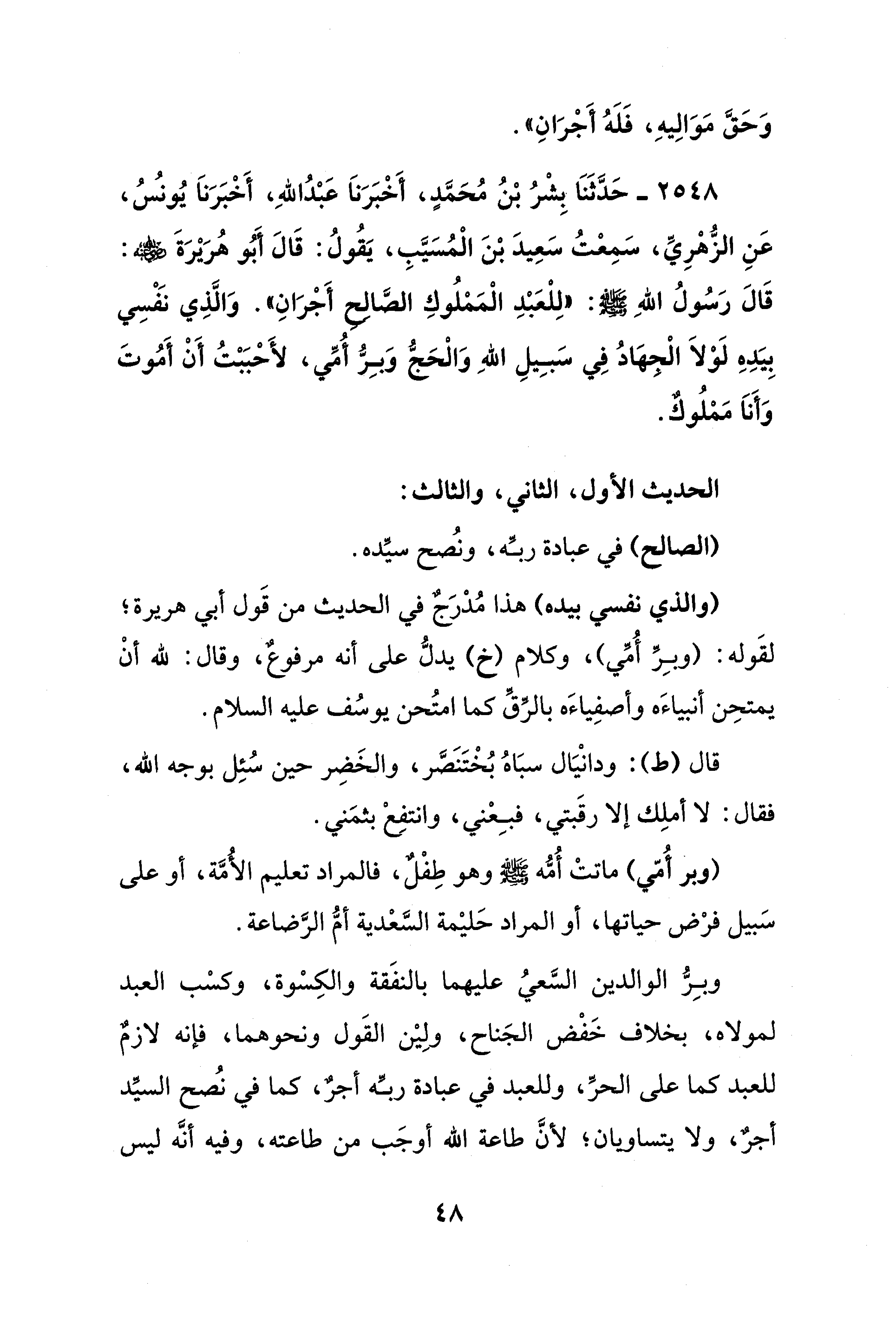 2548 - حَدَّثَنَا بِشْرُ بْنُ مُحَمَّدٍ، أَخْبَرَنَا عَبْدُ الله، أَخْبَرَنَا يُونس، عَنِ الزُّهْرِيِّ، سَمِعْتُ سَعِيدَ بْنَ الْمُسَيَّبِ، يَقُولُ: قَالَ أَبُو هُرَيْرَةَ - رضي الله عنه -: قَالَ رَسُولُ الله - صلى الله عليه وسلم -: "لِلْعَبْدِ الْمَمْلُوكِ الصَّالح أَجْرَانِ". وَالَّذِي نَفْسِي بِيَدِهِ لَوْلاَ الْجهَادُ فِي سَبِيلِ الله وَالْحَجُّ وَبِرُّ أُمِّي، لأَحْبَبْتُ أَنْ أَمُوتَ وَأَناَ مَمْلُوك.