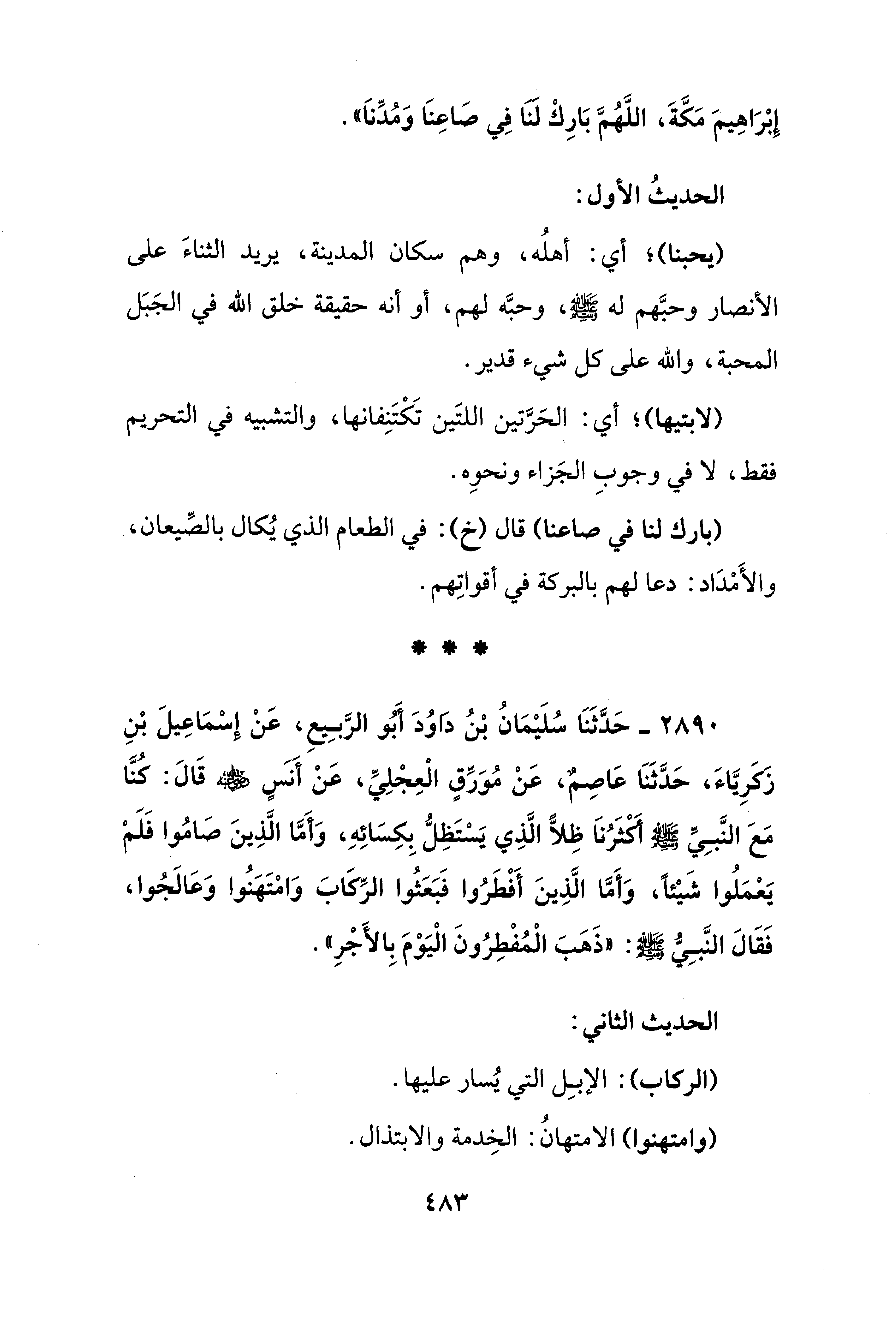 2890 - حَدَّثَنَا سُلَيْمَانُ بْنُ دَاوُدَ أَبُو الرَّبِيعِ، عَنْ إِسْمَاعِيلَ بْنِ زَكَريَّاءَ، حَدَّثَنَا عَاصِمٌ، عَنْ مُوَرِّقٍ الْعِجْلِيِّ، عَنْ أَنس - رضي الله عنه - قَالَ: كُنَّا مَعَ النَّبِيِّ - صلى الله عليه وسلم - أكثَرُناَ ظِلًّا الَّذِي يَسْتَظِلُّ بِكِسَائِهِ، وَأَمَّا الَّذِينَ صَامُوا فَلَمْ يَعْمَلُوا شَيْئًا، وَأَمَّا الَّذِينَ أَفْطَرُوا فَبَعَثُوا الرِّكَابَ وَامْتَهَنُوا وَعَالَجُوا، فَقَالَ النَّبِيُّ - صلى الله عليه وسلم -: "ذَهَبَ الْمُفْطِرُونَ الْيَوْمَ بِالأَجْرِ".