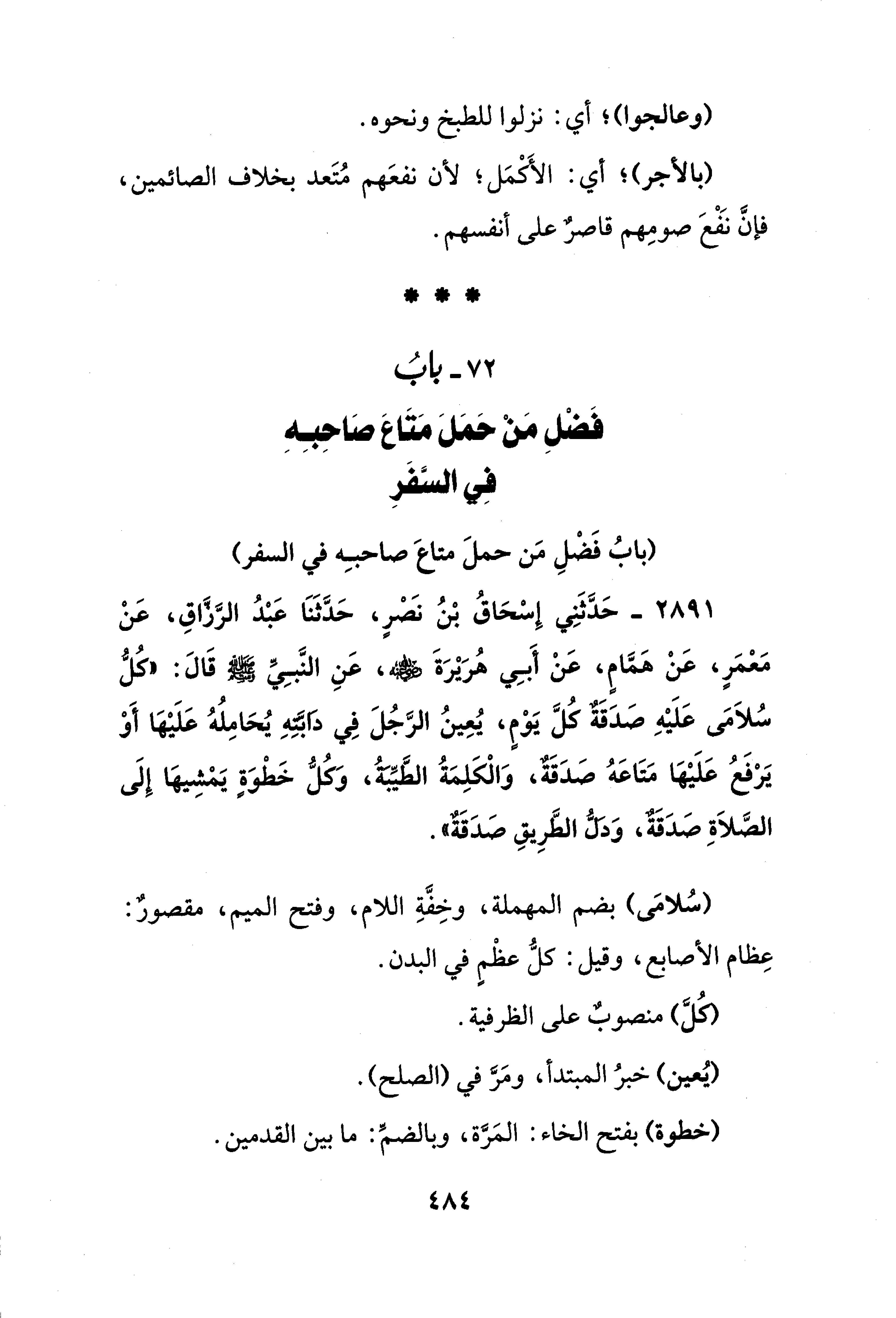 2891 - حَدَّثَنِي إِسْحَاقُ بْنُ نصرٍ، حَدَّثَنَا عَبْدُ الرَّزَاقِ، عَنْ مَعْمَرٍ، عَنْ هَمَّامٍ، عَنْ أَبِي هُرَيْرَةَ - رضي الله عنه -، عَنِ النَّبِيِّ - صلى الله عليه وسلم - قَالَ: "كُلُّ سُلاَمَى عَلَيْهِ صَدَقَةٌ كُلَّ يَوْمٍ، يُعِينُ الرَّجُلَ فِي دَابَّتِهِ يُحَامِلُهُ عَلَيْهَا أَوْ يَرْفَعُ عَلَيْهَا مَتَاعَهُ صَدَقَةٌ، وَالْكَلِمَةُ الطَّيِّبَةُ، وَكُلُّ خَطْوَةٍ يَمْشِيهَا إِلَى الصَّلاَةِ صَدَقَةٌ، وَدَلُّ الطَّرِيقِ صَدَقَةٌ".