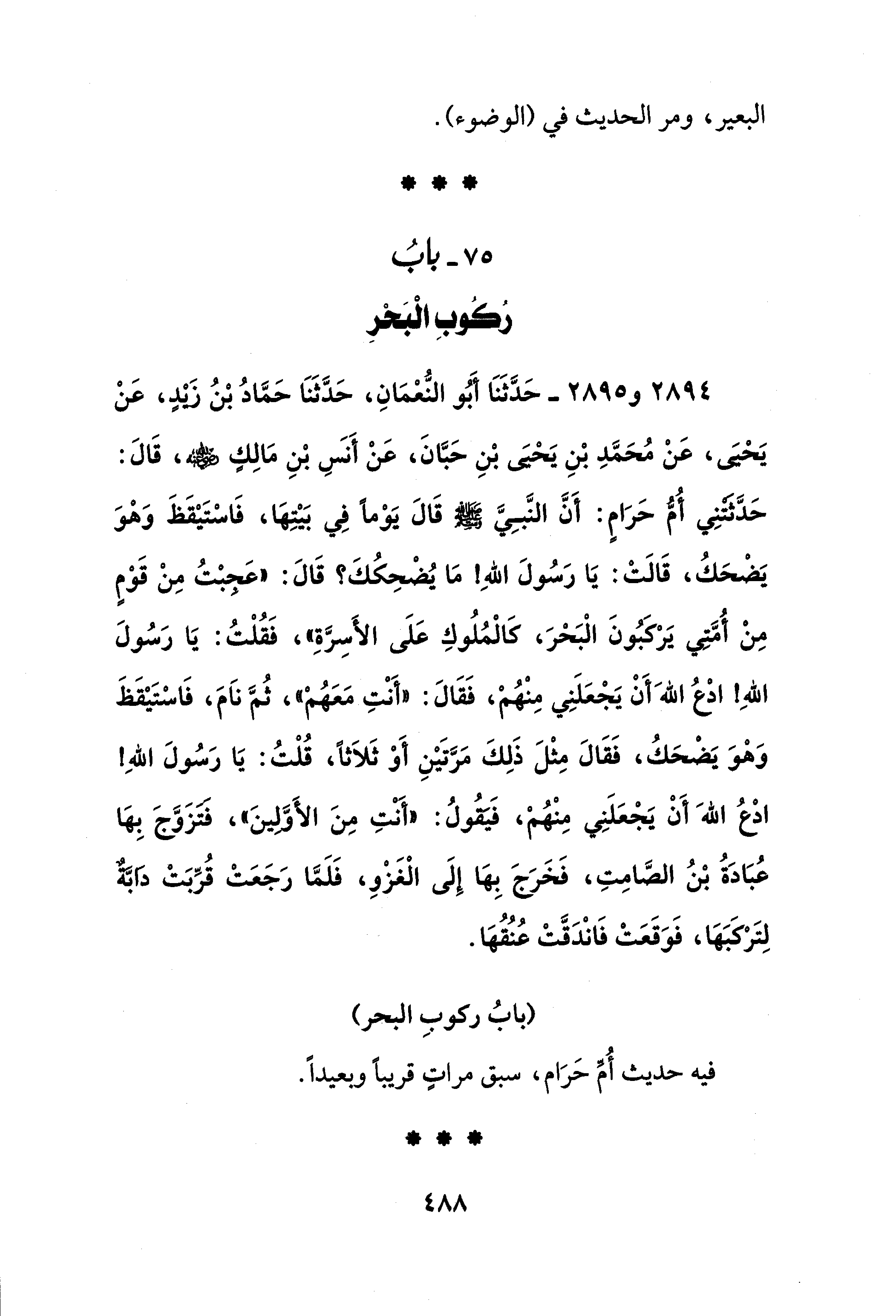 2894 - و 2895 - حَدَّثَنَا أَبُو النُّعْمَانِ، حَدَّثَنَا حَمَّادُ بْنُ زيدٍ، عَنْ يَحْيَى، عَنْ مُحَمَّدِ بْنِ يَحْيَى بْنِ حَبَّانَ، عَنْ أَنسِ بْنِ مَالِكٍ - رضي الله عنه -، قَالَ: حَدَّثَتْنِي أُمُّ حَرَامٍ: أَنَّ النَّبِيَّ - صلى الله عليه وسلم - قَالَ يَوْمًا فِي بَيْتِهَا، فَاسْتَيْقَظَ وَهْوَ يَضْحَكُ، قَالَتْ: يَا رَسُولَ اللهِ! مَا يُضْحِكُكَ؟ قَالَ: "عَجبْتُ مِنْ قَوْمٍ مِنْ أُمَّتِي يَرْكبُونَ الْبَحْرَ، كَالْمُلُوكِ عَلَى الأَسِرَّةِ"، فَقُلْتُ: يَا رَسُولَ اللهِ! ادْعُ اللهَ أَنْ يَجْعَلَنِي مِنْهُمْ، فَقَالَ: "أَنْتِ مَعَهُمْ"، ثُمَّ ناَمَ، فَاسْتَيْقَظَ وَهْوَ يَضْحَكُ، فَقَالَ مِثْلَ ذَلِكَ مَرَّتَيْنِ أَوْ ثَلاَثًا، قُلْتُ: يَا رَسُولَ اللهِ! ادْعُ اللهَ أَنْ يَجْعَلَنِي مِنْهُمْ، فَيَقُولُ: "أَنْتِ مِنَ الأَوَّلِينَ"، فتزَوَّجَ بِهَا عُبَادَةُ بْنُ الصَّامِتِ، فَخَرَجَ بِهَا إِلَى الْغَزْوِ، فَلَمَّا رَجَعَتْ قُرِّبَتْ دَابَّةٌ لِتَرْكَبَهَا، فَوَقَعَتْ فَانْدَقَّتْ عُنُقُهَا.