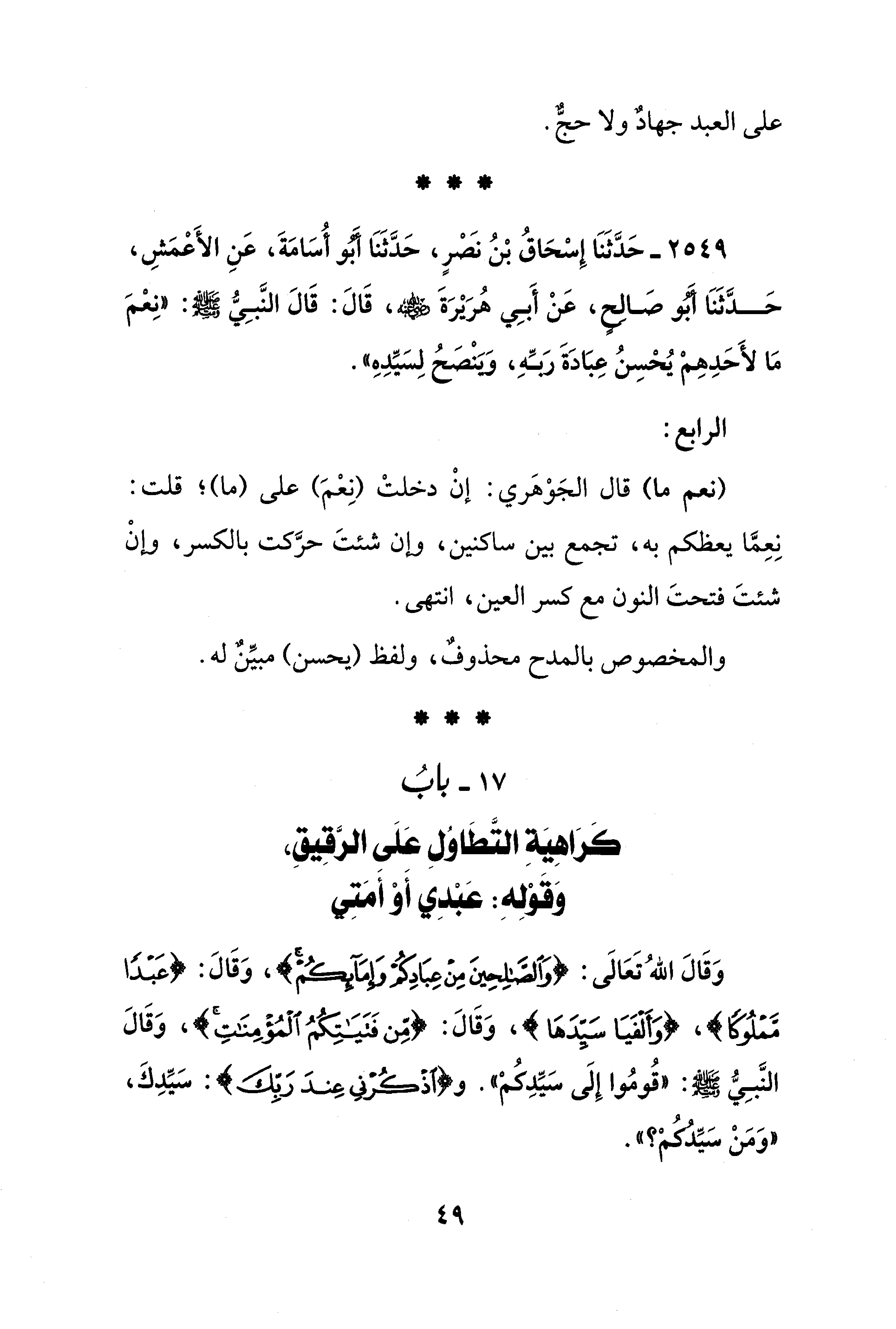2549 - حَدَّثَنَا إِسْحَاقُ بْنُ نصرٍ، حَدَّثَنَا أبو أُسَامَةَ، عَنِ الأَعْمَشِ، حَدَّثَنَا أبو صَالحٍ، عَنْ أَبِي هُرَيْرَةَ - رضي الله عنه -، قَالَ: قَالَ النَّبِيُّ - صلى الله عليه وسلم -: "نِعْمَ مَا لأَحَدِهِمْ يُحْسِنُ عِبَادَةَ رَبِّهِ، وَيَنْصَحُ لِسَيِّده".