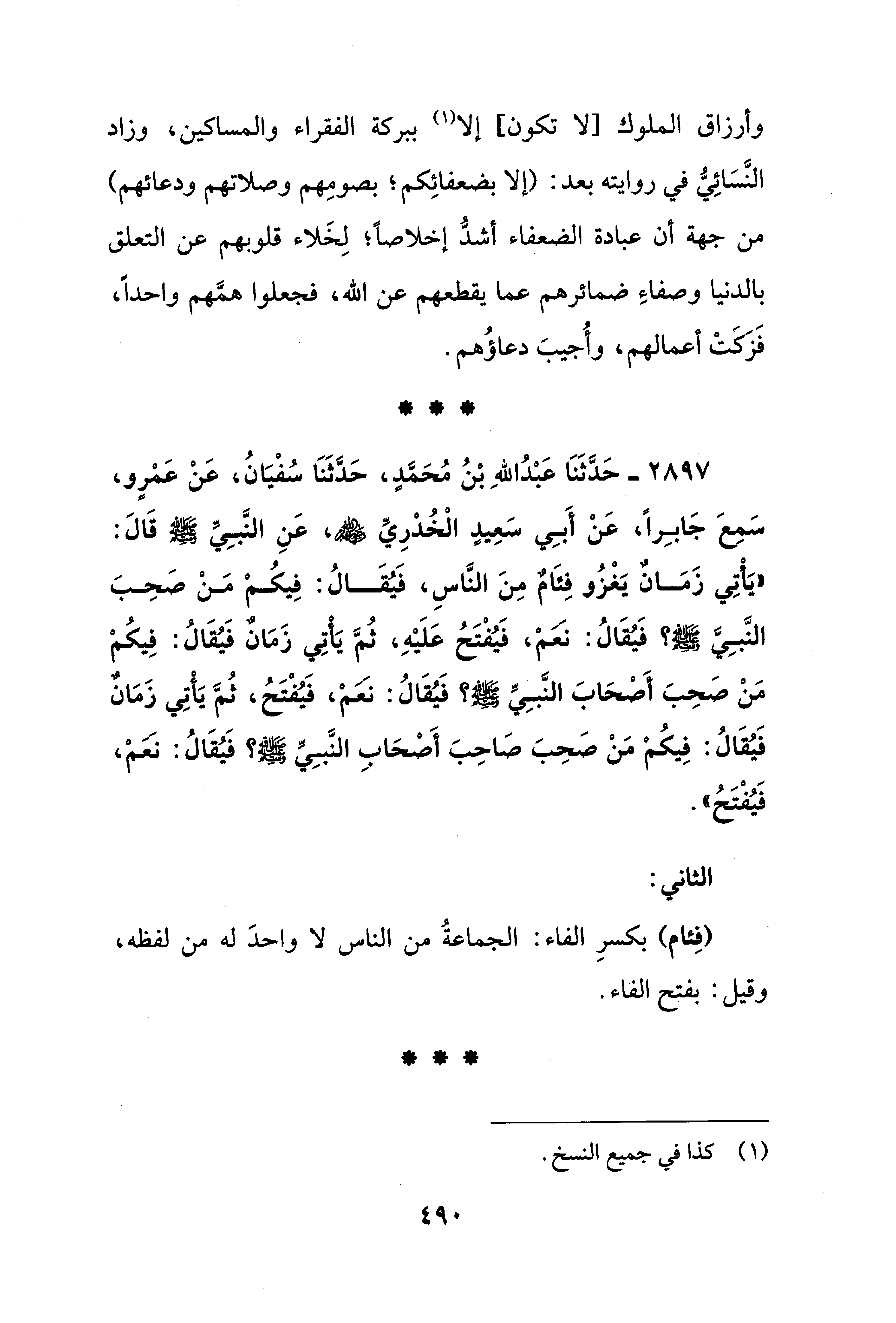 2897 - حَدَّثَنَا عَبْدُ اللهِ بْنُ مُحَمَّدٍ، حَدَّثَنَا سُفْيَانُ، عَنْ عَمْرٍو، سَمِعَ جَابِرًا، عَنْ أَبِي سَعِيدٍ الْخُدْرِيِّ - رضي الله عنه -، عَنِ النَّبِيِّ - صلى الله عليه وسلم - قَالَ: "يَأتِي زَمَانٌ يَغْزُو فِئَامٌ مِنَ النَّاسِ، فَيُقَالُ: فِيكُمْ مَنْ صَحِبَ النَّبِيَّ - صلى الله عليه وسلم -؟ فَيُقَالُ: نعمْ، فَيُفْتَحُ عَلَيْهِ، ثُمَّ يَأتِي زَمَانٌ فَيُقَالُ: فِيكُمْ مَنْ صَحِبَ أَصْحَابَ النَّبِيِّ - صلى الله عليه وسلم -؟ فَيُقَالُ: نعمْ، فَيُفْتَحُ، ثُمَّ يَأتِي زَمَانٌ فَيُقَالُ: فِيكُمْ مَنْ صَحِبَ صَاحِبَ أَصْحَابِ النَّبِيِّ - صلى الله عليه وسلم -؟ فَيُقَالُ: نعمْ، فَيُفْتَحُ".