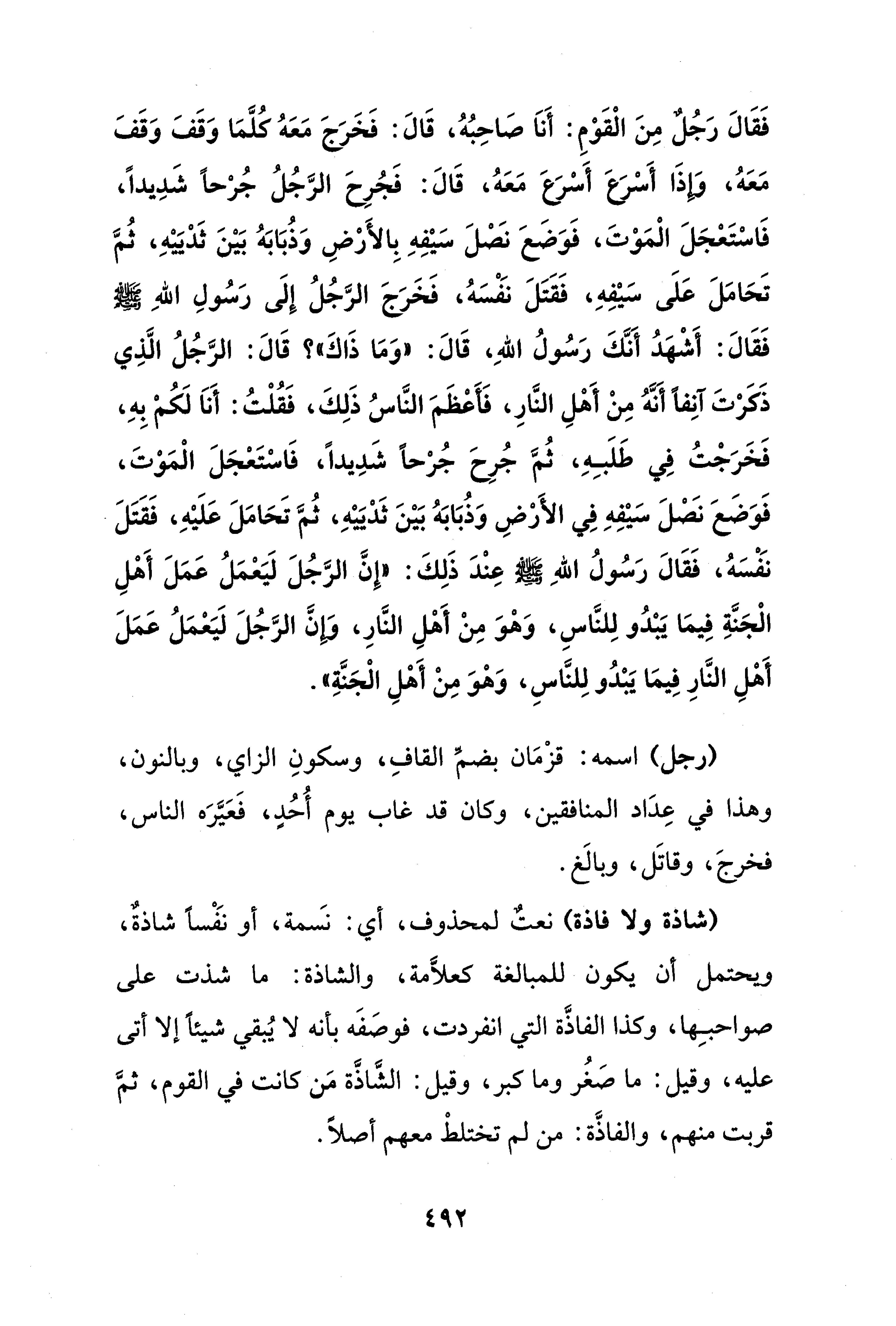 فَقَالَ رَجُلٌ مِنَ الْقَوْمِ: أَناَ صاحِبُهُ، قَالَ: فَخَرَجَ مَعَهُ كلَّمَا وَقَفَ وَقَفَ مَعَهُ، وَإِذَا أَسْرَعَ أَسْرَعَ مَعَهُ، قَالَ: فَجُرِحَ الرَّجُلُ جُرْحًا شَدِيدًا، فَاسْتَعْجَلَ الْمَوْتَ، فَوَضَعَ نَصْلَ سَيْفِهِ بِالأَرْضِ وَذُبَابَهُ بَيْنَ ثَدْيَيْهِ، ثُمَّ تَحَامَلَ عَلَى سَيْفِهِ، فَقَتَلَ نَفْسَهُ، فَخَرَجَ الرَّجُلُ إِلَى رَسُولِ اللهِ - صلى الله عليه وسلم - فَقَالَ: أَشْهَدُ أَنَّكَ رَسُولُ اللهِ، قَالَ: "وَمَا ذَاكَ"؟ قَالَ: الرَّجُلُ الَّذِي ذَكَرْتَ آنِفًا أَنَّهُ مِنْ أَهْلِ النَّارِ، فَأعْظَمَ النَّاسُ ذَلِكَ، فَقُلْتُ: أَناَ لَكُمْ بِهِ، فَخَرَجْتُ فِي طَلَبِهِ، ثُمَّ جُرِحَ جُرْحًا شَدِيدًا، فَاسْتَعْجَلَ الْمَوْتَ، فَوَضَعَ نَصْلَ سَيْفِهِ فِي الأَرْضِ وَذُبَابَهُ بَيْنَ ثَدْيَيْهِ، ثُمَّ تَحَامَلَ عَلَيْهِ، فَقَتَلَ نَفْسَهُ، فَقَالَ رَسُولُ اللهِ - صلى الله عليه وسلم - عِنْدَ ذَلِكَ: "إِنَّ الرجُلَ لَيَعْمَلُ عَمَلَ أَهْلِ الْجَنَّةِ فِيمَا يَبْدُو لِلنَّاسِ، وَهْوَ مِنْ أَهْلِ النَّارِ، وإنَّ الرَّجُلَ لَيَعْمَلُ عَمَلَ أَهْلِ النَّارِ فِيمَا يَبْدُو لِلنَّاسِ، وَهْوَ مِنْ أَهْلِ الْجَنَّةِ".