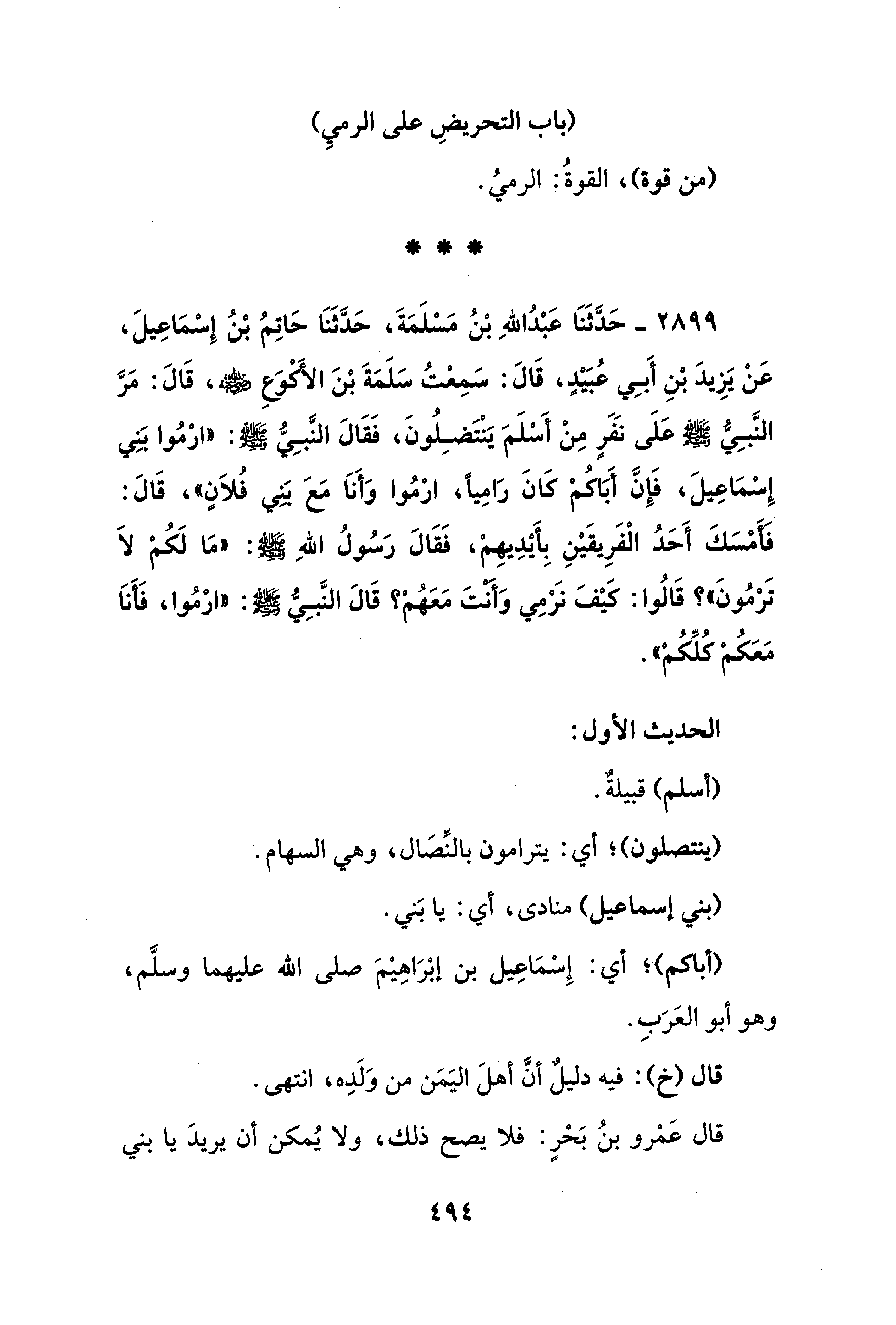 2899 - حَدَّثَنَا عَبْدُ اللهِ بْنُ مَسْلَمَةَ، حَدَّثَنَا حَاتِمُ بْنُ إِسْمَاعِيلَ، عَنْ يَزِيدَ بْنِ أَبِي عُبَيْدٍ، قَالَ: سَمِعْتُ سَلَمَةَ بْنَ الأكوَعِ - رضي الله عنه -، قَالَ: مَرَّ النَّبِيُّ - صلى الله عليه وسلم - عَلَى نَفَرٍ مِنْ أَسْلَمَ يَنْتَضِلُونَ، فَقَالَ النَّبِيُّ - صلى الله عليه وسلم -: "ارْمُوا بَنِي إِسْمَاعِيلَ، فَإِنَّ أَبَاكمْ كانَ رَامِيًا، ارْمُوا وَأَناَ مَعَ بَنِي فُلاَنٍ"، قَالَ: فَأمْسَكَ أَحَدُ الْفَرِيقَيْنِ بِأيْدِيهِمْ، فَقَالَ رَسُولُ اللهِ - صلى الله عليه وسلم -: "مَا لَكُمْ لاَ تَرْمُونَ"؟ قَالُوا: كَيْفَ نَرْمِي وَأَنْتَ مَعَهُمْ؟ قَالَ النَّبِيُّ - صلى الله عليه وسلم -: "ارْمُوا، فَأناَ مَعَكُمْ كلِّكُمْ".