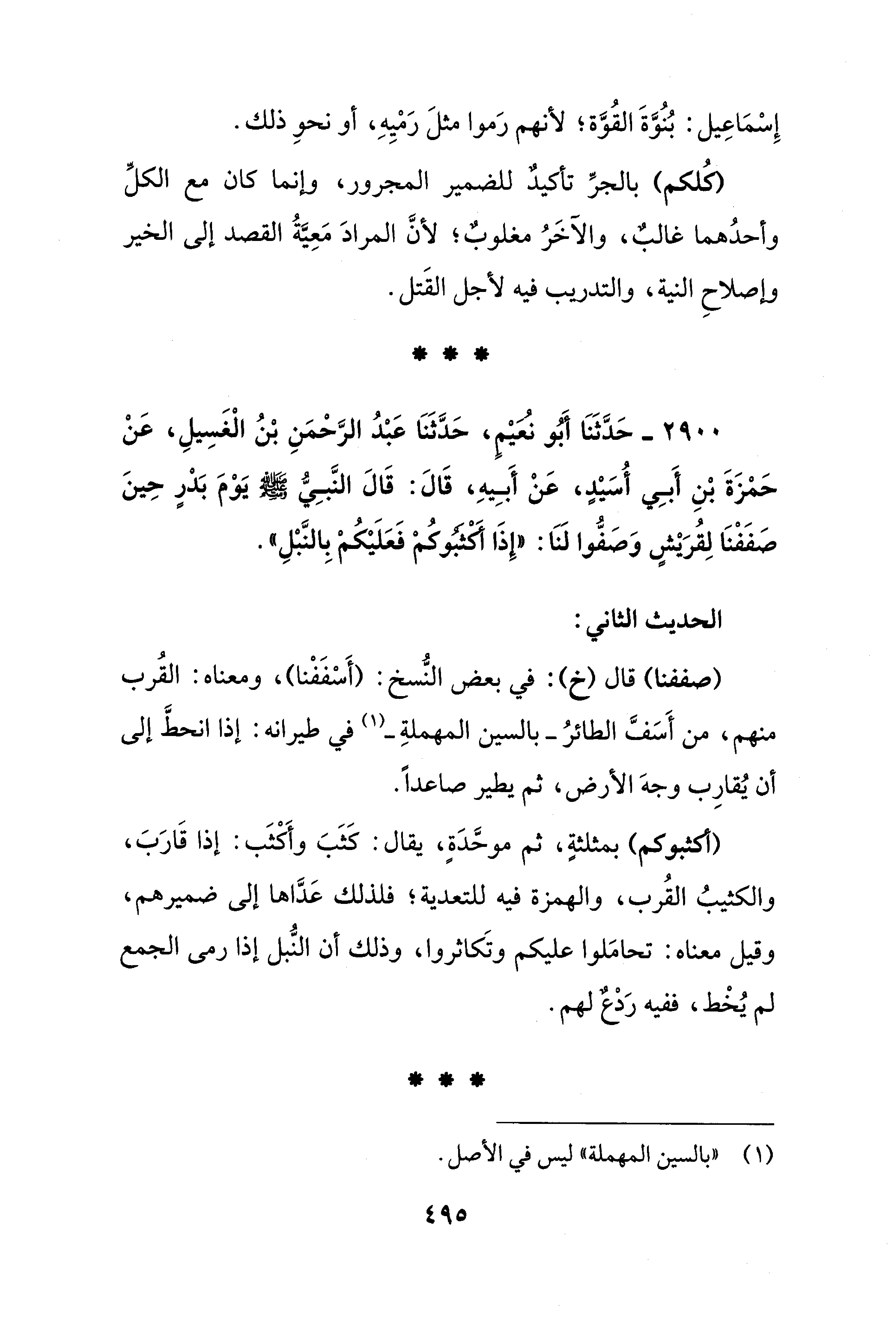 2900 - حَدَّثَنَا أَبُو نُعَيْم، حَدَّثَنَا عَبْدُ الرَّحْمَنِ بْنُ الْغَسِيلِ، عَنْ حَمْزَةَ بْنِ أَبِي أسُيْدٍ، عَنْ أَبِيهِ، قَالَ: قَالَ النَّبِيُّ - صلى الله عليه وسلم - يَوْمَ بَدْرٍ حِينَ صَفَفْنَا لِقُرَيْشٍ وَصَفُّوا لنا: "إِذَا أكثبوكم فَعَلَيْكُمْ بِالنَّبْلِ".