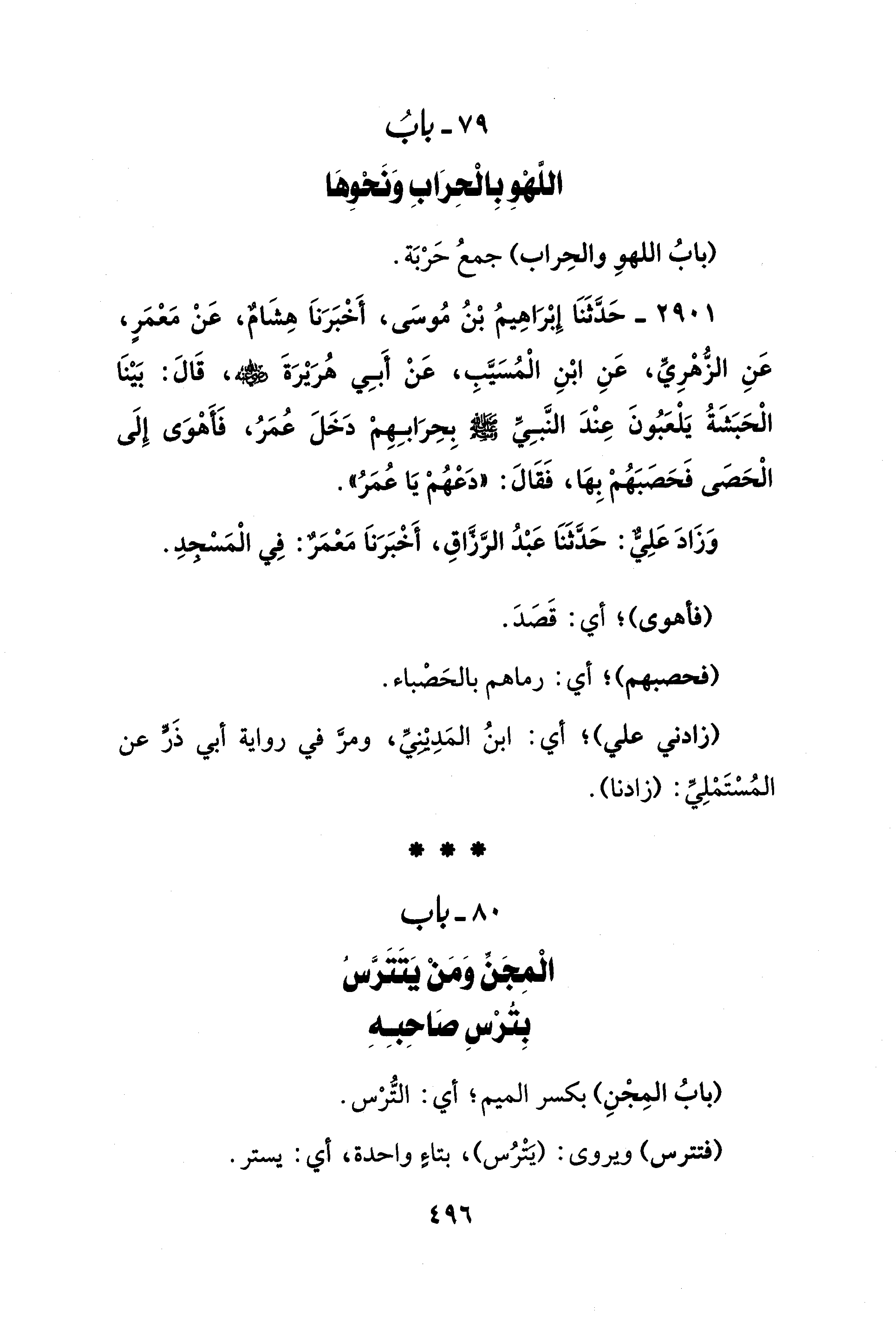 2901 - حَدَّثَنَا إِبْرَاهِيمُ بْنُ مُوسَى، أَخْبَرَنَا هِشَامٌ، عَنْ مَعْمَرٍ، عَنِ الزُّهْرِيِّ، عَنِ ابْنِ الْمُسَيَّبِ، عَنْ أَبِي هُرَيْرَةَ - رضي الله عنه -، قَالَ: بَيْنَا الْحَبَشَةُ يَلْعَبُونَ عِنْدَ النَّبِيِّ - صلى الله عليه وسلم - بِحِرَابِهِمْ دَخَلَ عُمَرُ، فَأهْوَى إِلَى الْحَصَى فَحَصَبَهُمْ بِهَا، فَقَالَ: "دَعْهُمْ يَا عُمَرُ".