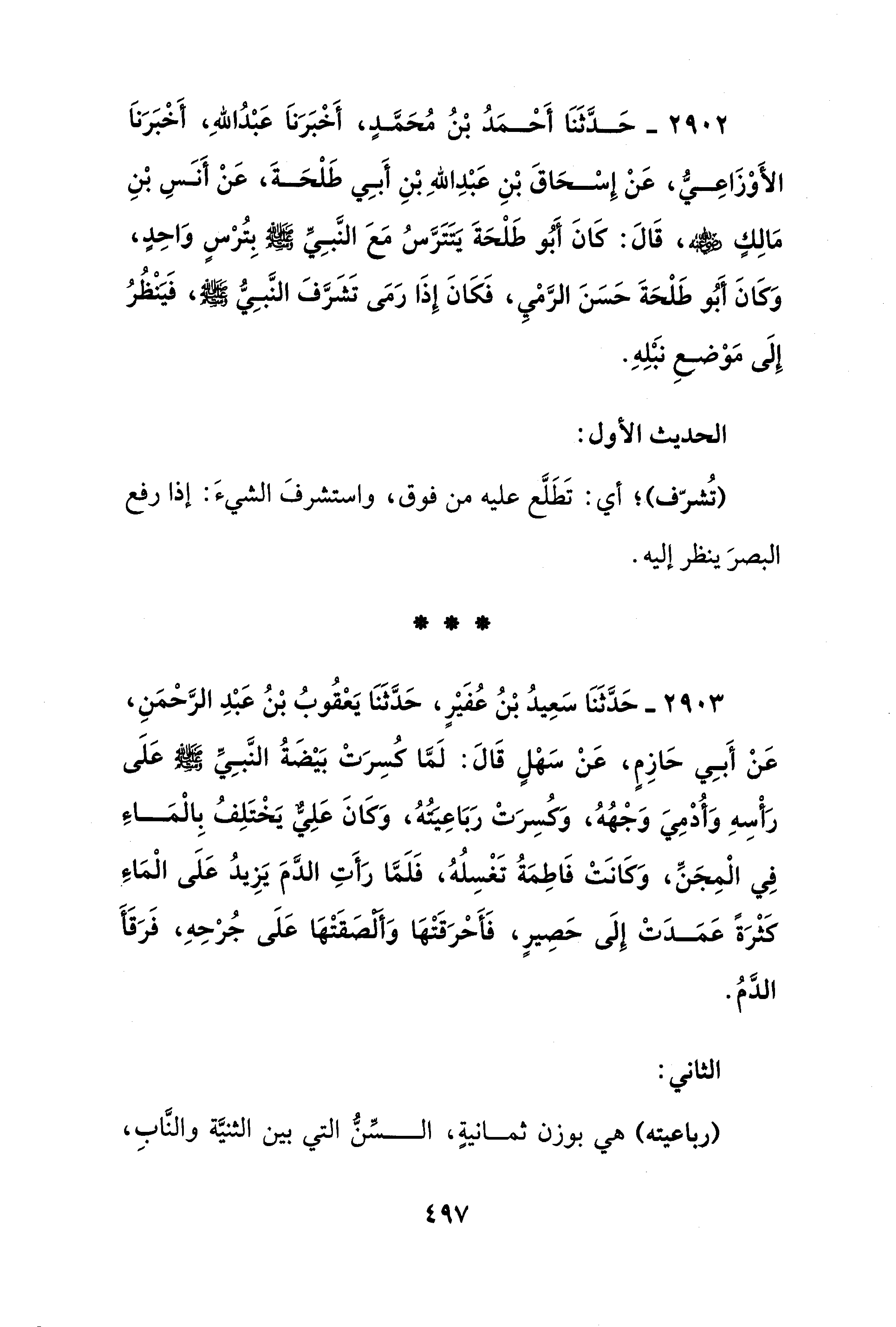 2902 - حَدَّثَنَا أَحْمَدُ بْنُ مُحَمَّدٍ، أَخْبَرَنَا عَبْدُ اللهِ، أَخْبَرَنَا الأَوْزَاعِيُّ، عَنْ إِسْحَاقَ بْنِ عَبْدِ اللهِ بْنِ أَبِي طَلْحَةَ، عَنْ أَنَسِ بْنِ مَالِكٍ - رضي الله عنه -، قَالَ: كَانَ أَبُو طَلْحَةَ يتترَّسُ مَعَ النَّبِيِّ - صلى الله عليه وسلم - بِتُرْسٍ وَاحِدٍ، وَكَانَ أَبُو طَلْحَةَ حَسَنَ الرَّمْيِ، فَكَانَ إِذَا رَمَى تَشَرَّفَ النَّبِيُّ - صلى الله عليه وسلم -، فَيَنْظُرُ إِلَى مَوْضعِ نبلِهِ.
