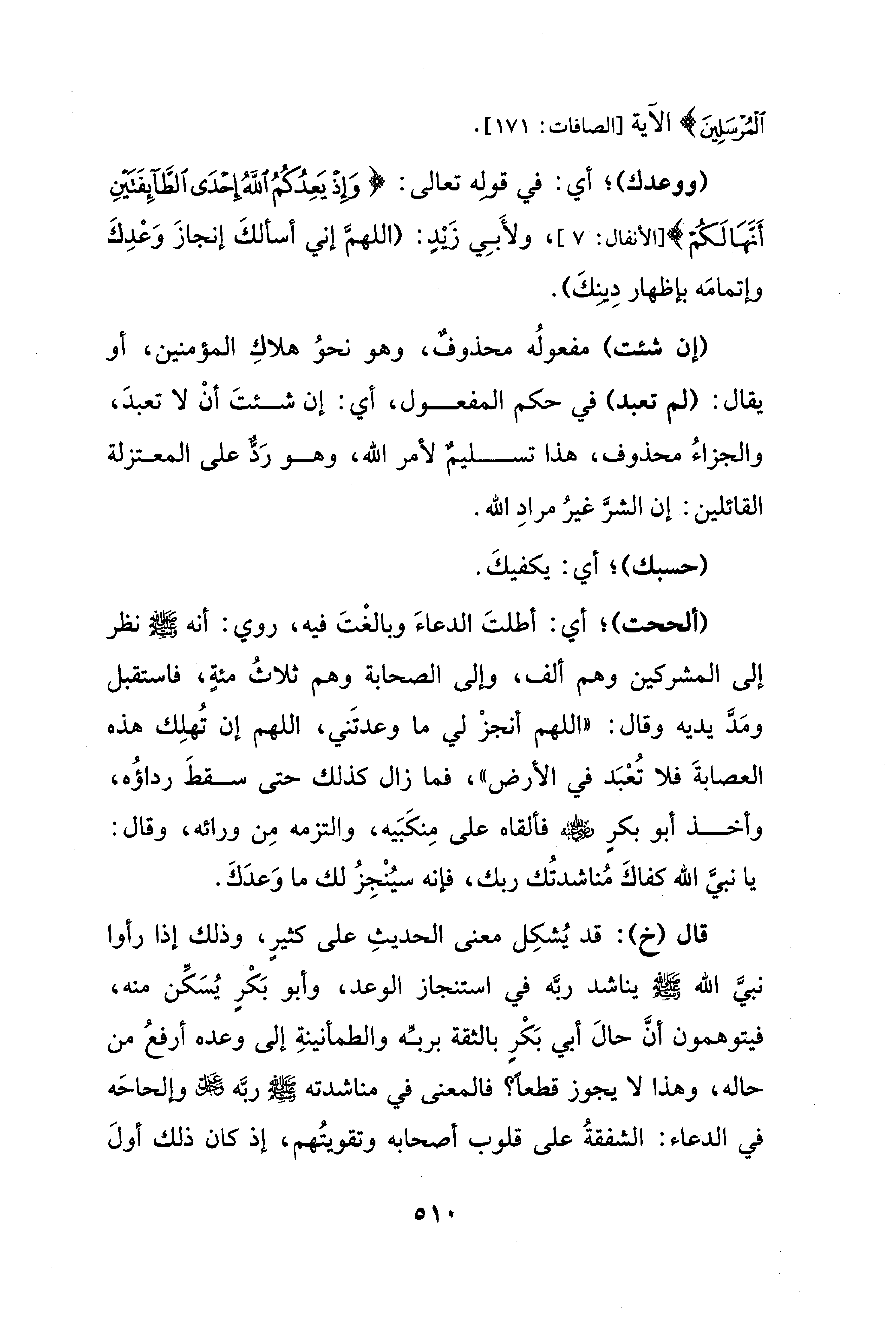 (ووعدك)؛ أي: في قولِه تعالى: {وَإِذْ يَعِدُكُمُ اللَّهُ إِحْدَى الطَّائِفَتَيْنِ أَنَّهَا لَكُمْ} [الأنفال: 7]، ولأَبِي زَيْدٍ: (اللهمَّ إني أسألكَ إنجازَ وَعْدِكَ وإتمامَه بإظهار دِينِكَ).