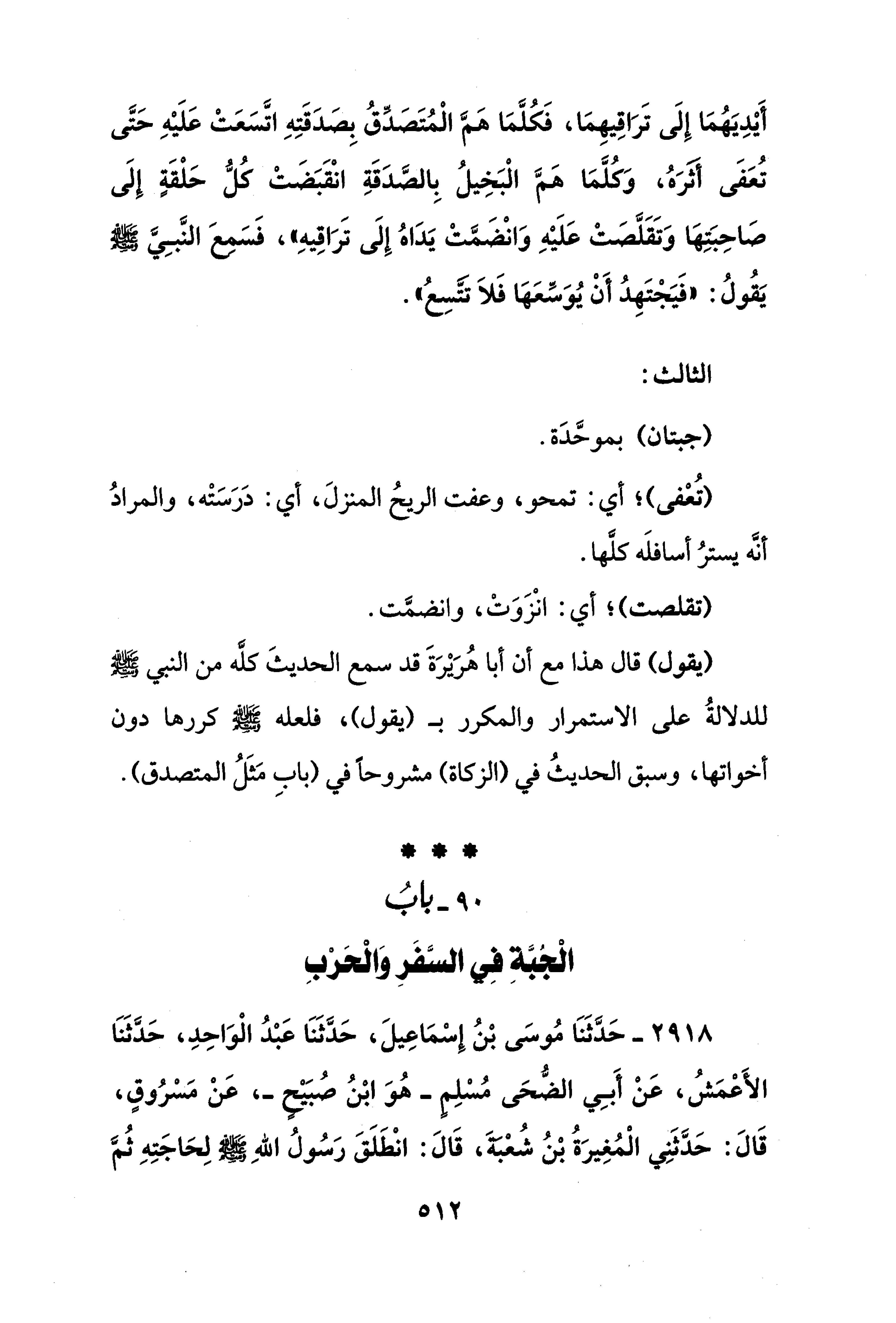 أَيْدِيَهُمَا إِلَى تَرَاقِيهِمَا، فَكُلَّمَا هَمَّ الْمُتَصَدِّقُ بِصَدَقَتِهِ اتَّسَعَتْ عَلَيْهِ حَتَّى تُعَفَى أثَرَهُ، وَكلَّمَا هَمَّ الْبَخِيلُ بِالصَّدَقَةِ انْقَبَضَتْ كُلُّ حَلْقَةٍ إِلَى صَاحِبَتِهَا وَتَقَلَّصَتْ عَلَيْهِ وَانْضَمَّتْ يَدَاهُ إِلَى تَرَاقِيهِ"، فَسَمِعَ النَّبِيُّ - صلى الله عليه وسلم - يَقُولُ: "فَيَجْتَهِدُ أَنْ يُوَسِّعَهَا فَلاَ تَتَّسِعُ".