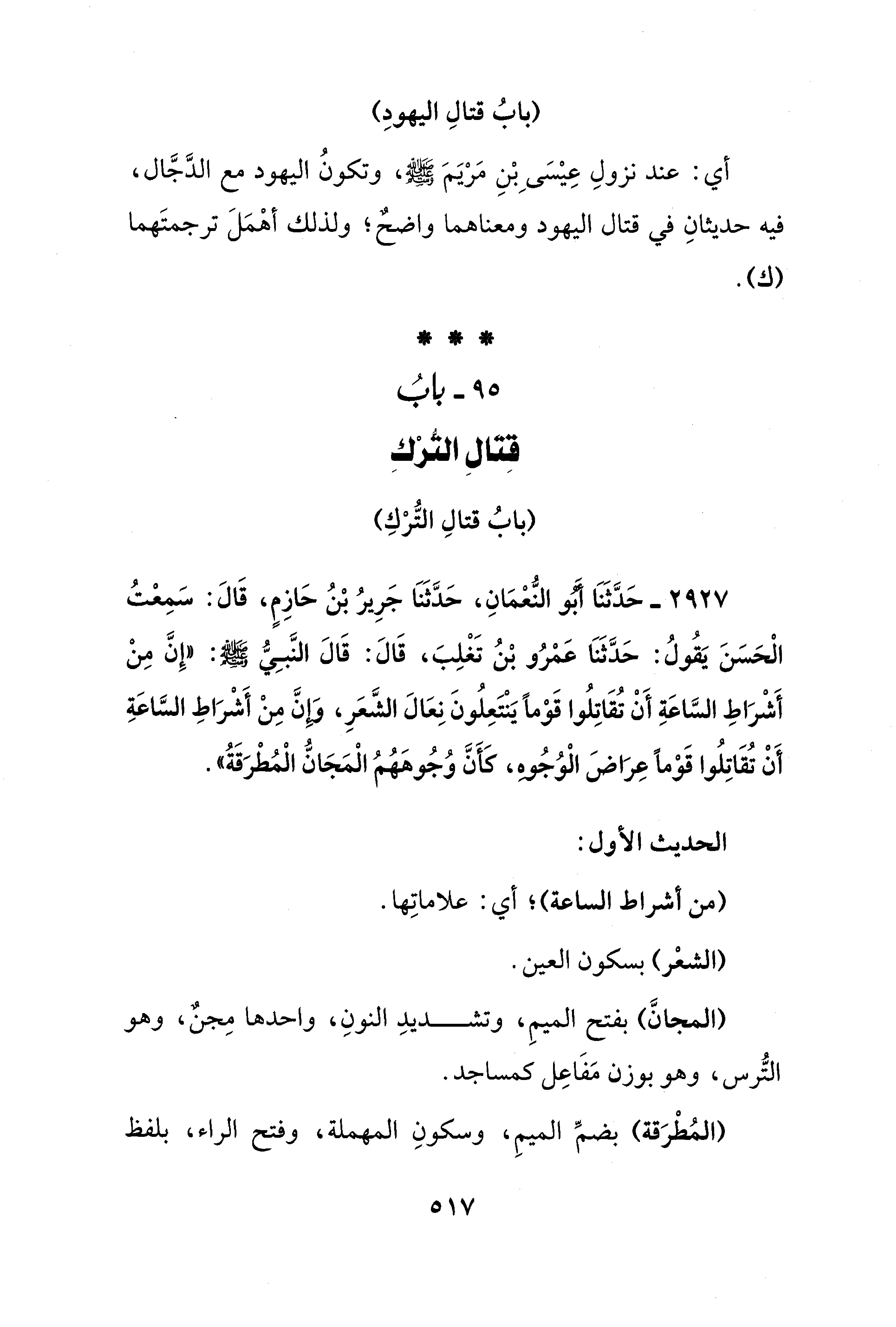 2927 - حَدَّثنَا أَبُو النُّعْمَانِ، حَدَّثنَا جَرِيرُ بْنُ حَازِمٍ، قَالَ: سَمِعْتُ الْحَسَنَ يَقُولُ: حَدَّثنَا عَمْرُو بْنُ تَغْلِبَ، قَالَ: قَالَ النَّبِيُّ - صلى الله عليه وسلم -: "إِنَّ مِنْ أَشْرَاطِ السَّاعَةِ أَنْ تُقَاتِلُوا قَوْمًا يَنتعِلُونَ نِعَالَ الشَّعَرِ، وَإِنَّ مِنْ أَشْراطِ السَّاعَةِ أَنْ تُقَاتِلُوا قَوْمًا عِراضَ الْوُجُوهِ، كَأَنَّ وُجُوهَهُمُ الْمَجَانُّ الْمُطْرَقَةُ".