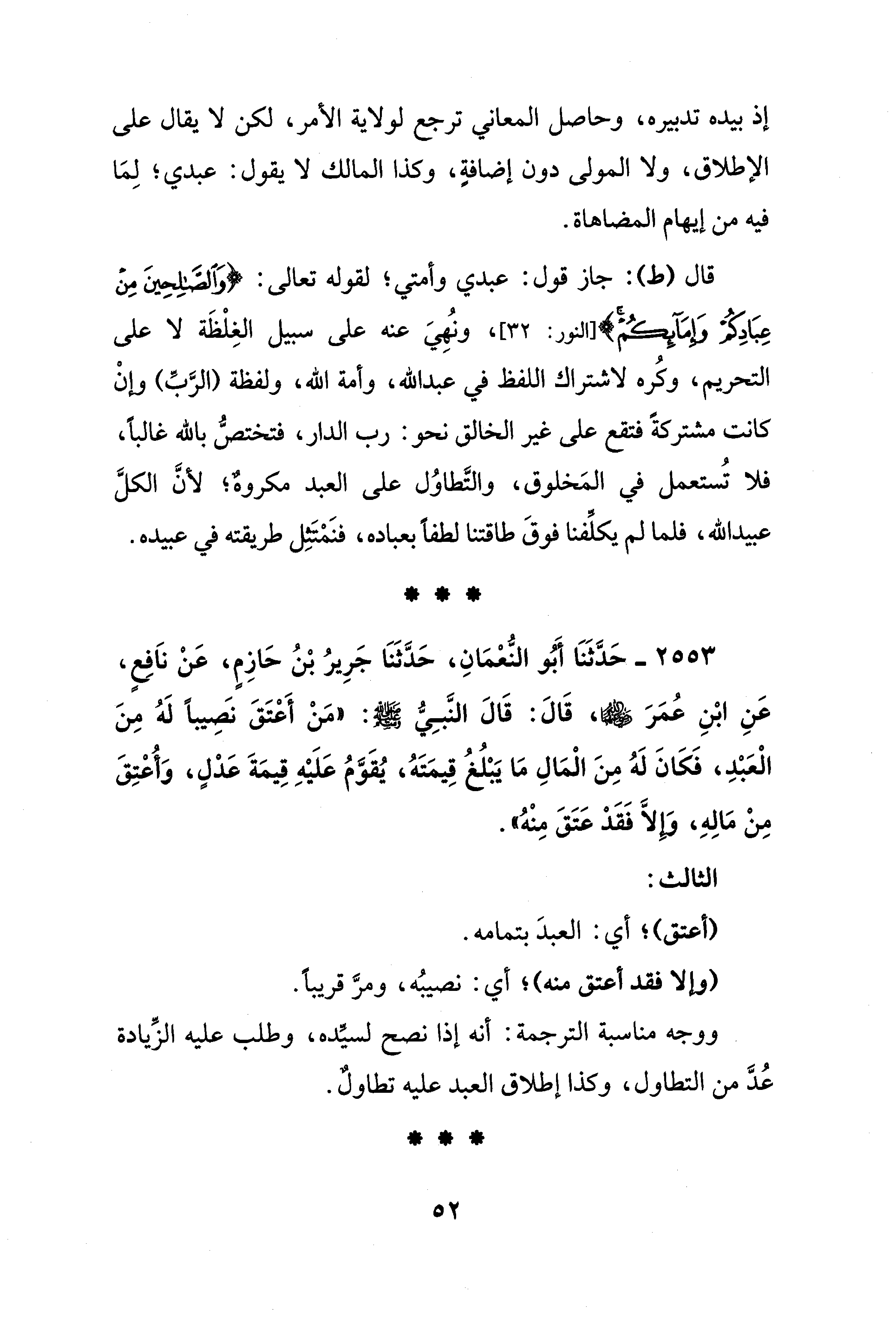 2553 - حَدَّثَنَا أَبُو النُّعْمَانِ، حَدَّثَنَا جَرِيرُ بْنُ حَازِمٍ، عَنْ ناَفِعٍ، عَنِ ابْنِ عُمَرَ - رضي الله عنهما -، قَالَ: قَالَ النَّبِيُّ - صلى الله عليه وسلم -: "مَنْ أَعْتَقَ نصَيبًا لَهُ مِنَ الْعَبْدِ، فَكَانَ لَهُ مِنَ الْمَالِ مَا يَبْلُغُ قِيمَتَهُ، يُقَوَّمُ عَلَيْهِ قِيمَةَ عَدْلٍ، وَأُعْتِقَ مِنْ مَالِهِ، وَإِلَّا فَقَدْ عَتَقَ مِنْهُ".