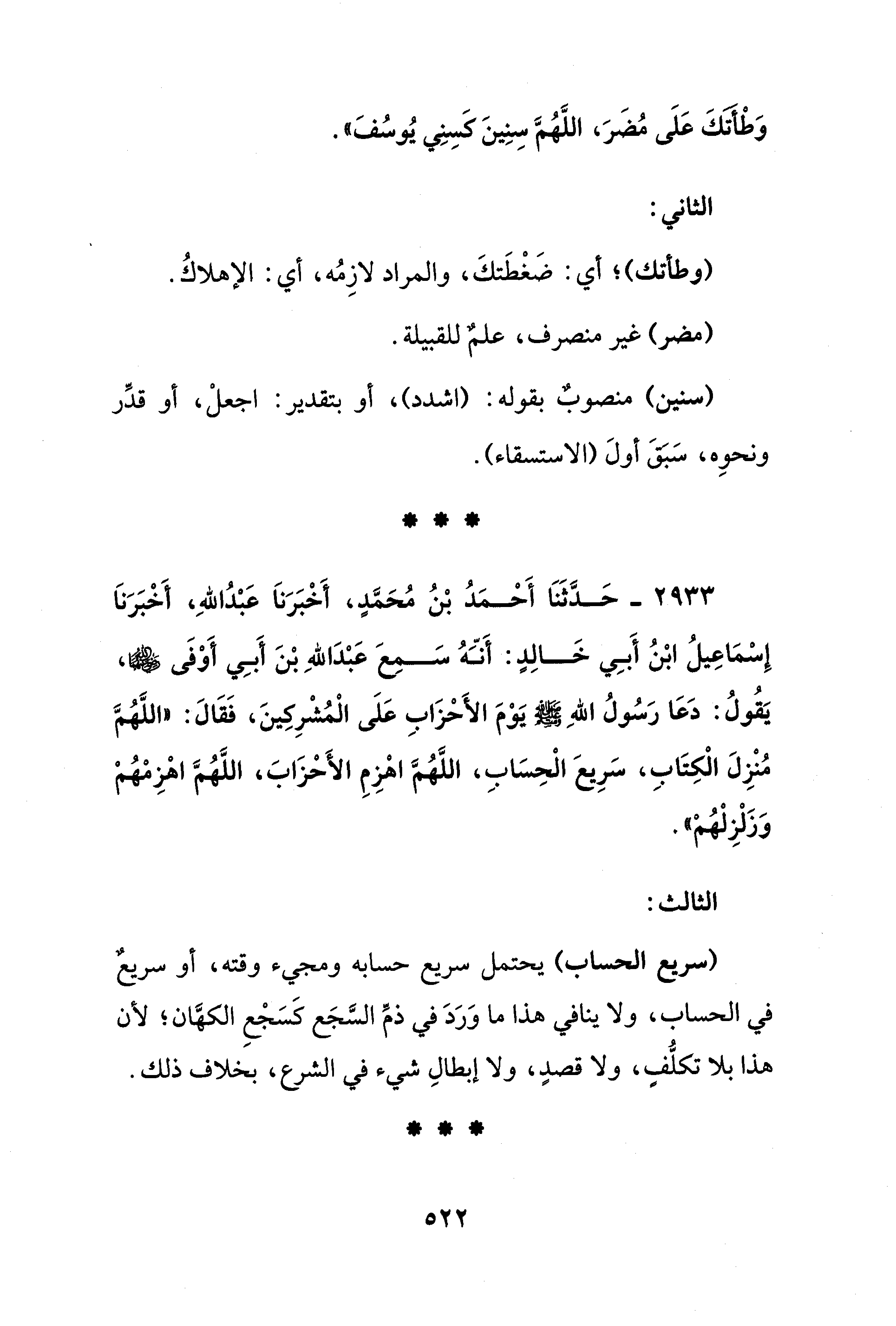 2933 - حَدَّثَنَا أَحْمَدُ بْنُ مُحَمَّدٍ، أَخْبَرَنَا عَبْدُ اللهِ، أَخْبَرَنَا إِسْمَاعِيلُ ابْنُ أَبِي خَالِدٍ: أَنَّهُ سَمِعَ عَبْدَ اللهِ بْنَ أَبِي أَوْفَى - رضي الله عنهما -، يَقُولُ: دَعَا رَسُولُ اللهِ - صلى الله عليه وسلم - يَوْمَ الأَحْزَابِ عَلَى الْمُشْرِكِينَ، فَقَالَ: "اللَّهُمَّ مُنْزِلَ الْكِتَابِ، سَرِيعَ الْحِسَابِ، اللَّهُمَّ اهْزِمِ الأَحْزَابَ، اللَّهُمَّ اهْزِمْهُمْ وَزَلْزِلْهُمْ".