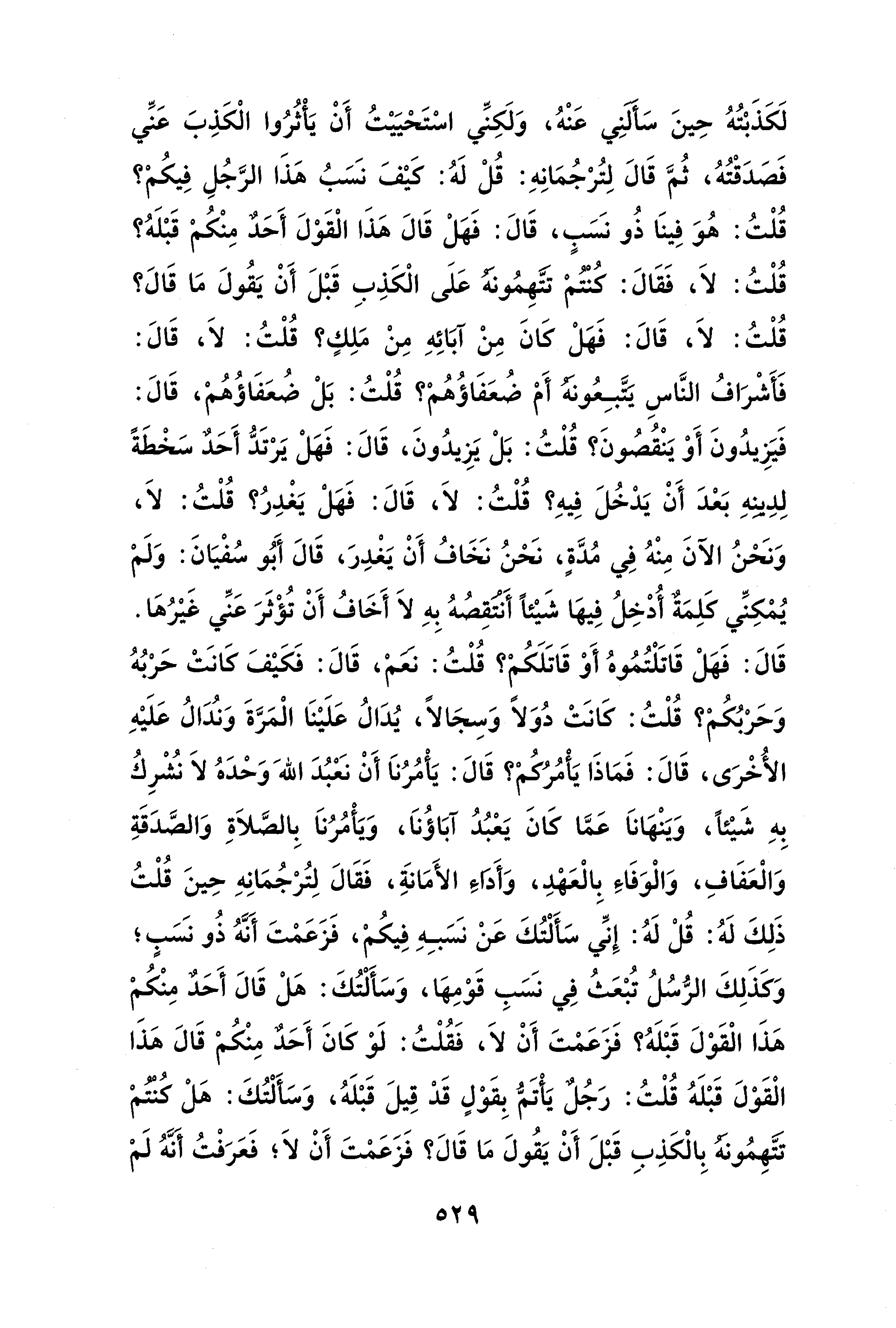 لَكَذَبْتُهُ حِينَ سَأَلَنِي عَنْهُ، وَلَكِنِّي اسْتَحْيَيْتُ أَنْ يَأثُرُوا الْكَذِبَ عَنِّي فَصَدَقْتُهُ، ثُمَّ قَالَ لِتُرْجُمَانِهِ: قُلْ لَهُ: كَيْفَ نَسَبُ هَذَا الرَّجُلِ فِيكُمْ؟ قُلْتُ: هُوَ فِينَا ذُو نَسَبٍ، قَالَ: فَهَلْ قَالَ هَذَا الْقَوْلَ أَحَدٌ مِنْكُمْ قَبْلَهُ؟ قُلْتُ: لاَ، فَقَالَ: كُنتمْ تتَّهِمُونَهُ عَلَى الْكَذِبِ قَبْلَ أَنْ يَقُولَ مَا قَالَ؟ قُلْتُ: لاَ، قَالَ: فَهَلْ كَانَ مِنْ آبَائِهِ مِنْ مَلِكٍ؟ قُلْتُ: لاَ، قَالَ: فَأَشْرَافُ النَّاسِ يَتَّبِعُونَهُ أَمْ ضُعَفَاؤُهُمْ؟ قُلْتُ: بَلْ ضُعَفَاؤُهُمْ، قَالَ: فَيَزِيدُونَ أَوْ يَنْقُصُونَ؟ قُلْتُ: بَلْ يَزِيدُونَ، قَالَ: فَهَلْ يَرْتَدُّ أَحَدٌ سَخْطَةً لِدِينِهِ بَعْدَ أَنْ يَدْخُلَ فِيهِ؟ قُلْتُ: لاَ، قَالَ: فَهَلْ يَغْدِرُ؟ قُلْتُ: لاَ، وَنَحْنُ الآنَ مِنْهُ فِي مُدَّةٍ، نَحْنُ نَخَافُ أَنْ يَغْدِرَ، قَالَ أَبُو سُفْيَانَ: وَلَمْ يُمْكِنِّي كَلِمَةٌ أُدْخِلُ فِيهَا شَيْئًا أَنتقِصُهُ بِهِ لاَ أَخَافُ أَنْ تُؤْثَرَ عَنِّي غَيْرُهَا. قَالَ: فَهَلْ قَاتَلْتُمُوهُ أَوْ قَاتَلَكُمْ؟ قُلْتُ: نعمْ، قَالَ: فَكَيْفَ كَانَتْ حَرْبُهُ وَحَرْبُكُمْ؟ قُلْتُ؟ كَانَتْ دُوَلًا وَسِجَالًا، يُدَالُ عَلَيْنَا الْمَرَّةَ وَنُدَالُ عَلَيْهِ الأُخْرَى، قَالَ: فَمَاذَا يَأمُرُكُمْ؟ قَالَ: يَأْمُرُناَ أَنْ نَعْبُدَ اللهَ وَحْدَهُ لاَ نُشْرِكُ بِهِ شَيْئًا، وَيَنْهَاناَ عَمَّا كَانَ يَعْبُدُ آبَاؤُناَ، وَيَأمُرُناَ بِالصَّلاَةِ وَالصَّدَقَةِ وَالْعَفَافِ، وَالْوَفَاءِ بِالْعَهْدِ، وَأَدَاءِ الأَمَانَةِ، فَقَالَ لِتُرْجُمَانِهِ حِينَ قُلْتُ ذَلِكَ لَهُ: قُلْ لَهُ: إِنِّي سَأَلْتُكَ عَنْ نَسَبِهِ فِيكُمْ، فَزَعَمْتَ أَنَّهُ ذُو نَسَبٍ؛ وَكَذَلِكَ الرُّسُلُ تُبْعَثُ فِي نَسَبِ قَوْمِهَا، وَسَأَلْتُكَ: هَلْ قَالَ أَحَدٌ مِنْكُمْ هَذَا الْقَوْلَ قَبْلَهُ؟ فَزَعَمْتَ أَنْ لاَ، فَقُلْتُ: لَوْ كَانَ أَحَدٌ مِنْكُمْ قَالَ هَذَا الْقَوْلَ قَبْلَهُ قُلْتُ: رَجُلٌ يَأتَمُّ بِقَوْلٍ قَدْ قِيلَ قَبْلَهُ، وَسَأَلْتُكَ: هَلْ كُنتمْ تتَّهِمُونَهُ بِالْكَذِبِ قَبْلَ أَنْ يَقُولَ مَا قَالَ؟ فَزَعَمْتَ أَنْ لاَ؛ فَعَرَفْتُ أَنَّهُ لَمْ