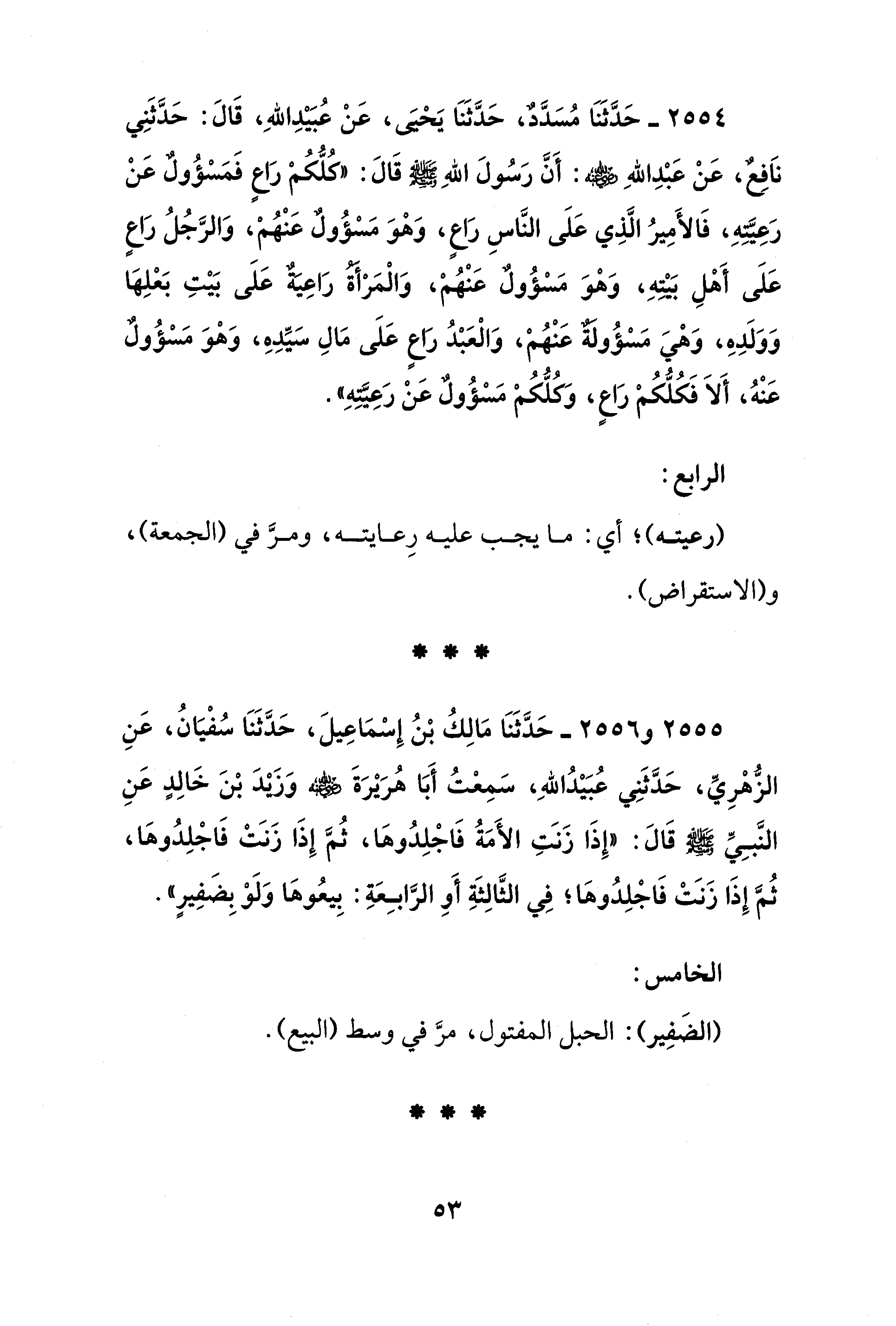 2554 - حَدَّثَنَا مُسَدَّدٌ، حَدَّثَنَا يَحْيَى، عَنْ عُبَيْدِ اللهِ، قَالَ: حَدَّثَنِي نَافِعٌ، عَنْ عَبْدِ اللهِ - رضي الله عنه -: أَنَّ رَسُولَ الله - صلى الله عليه وسلم - قَالَ: "كلُّكُمْ رَاعٍ فَمَسْؤُولٌ عَنْ رَعِيتهِ، فَاْلأَمِيرُ الَّذِي عَلَى النَّاسِ رَاعٍ، وَهْوَ مَسْؤُولٌ عَنْهُمْ، وَالرَّجُلُ رَاعٍ عَلَى أَهْلِ بَيتهِ، وَهْوَ مَسْؤُولٌ عَنْهُمْ، وَالْمَرْأة رَاعِيةٌ عَلَى بَيْتِ بَعْلِهَا وَوَلَدِهِ، وَهْيَ مَسْؤُولةٌ عَنْهُمْ، وَالْعَبْدُ رَاعٍ عَلَى مَالِ سَيِّدِهِ، وَهْوَ مَسْؤُول عَنْهُ، أَلاَ فَكُلُّكُمْ رَاعٍ، وَكُلُّكُمْ مَسْؤُول عَنْ رَعِيتهِ".