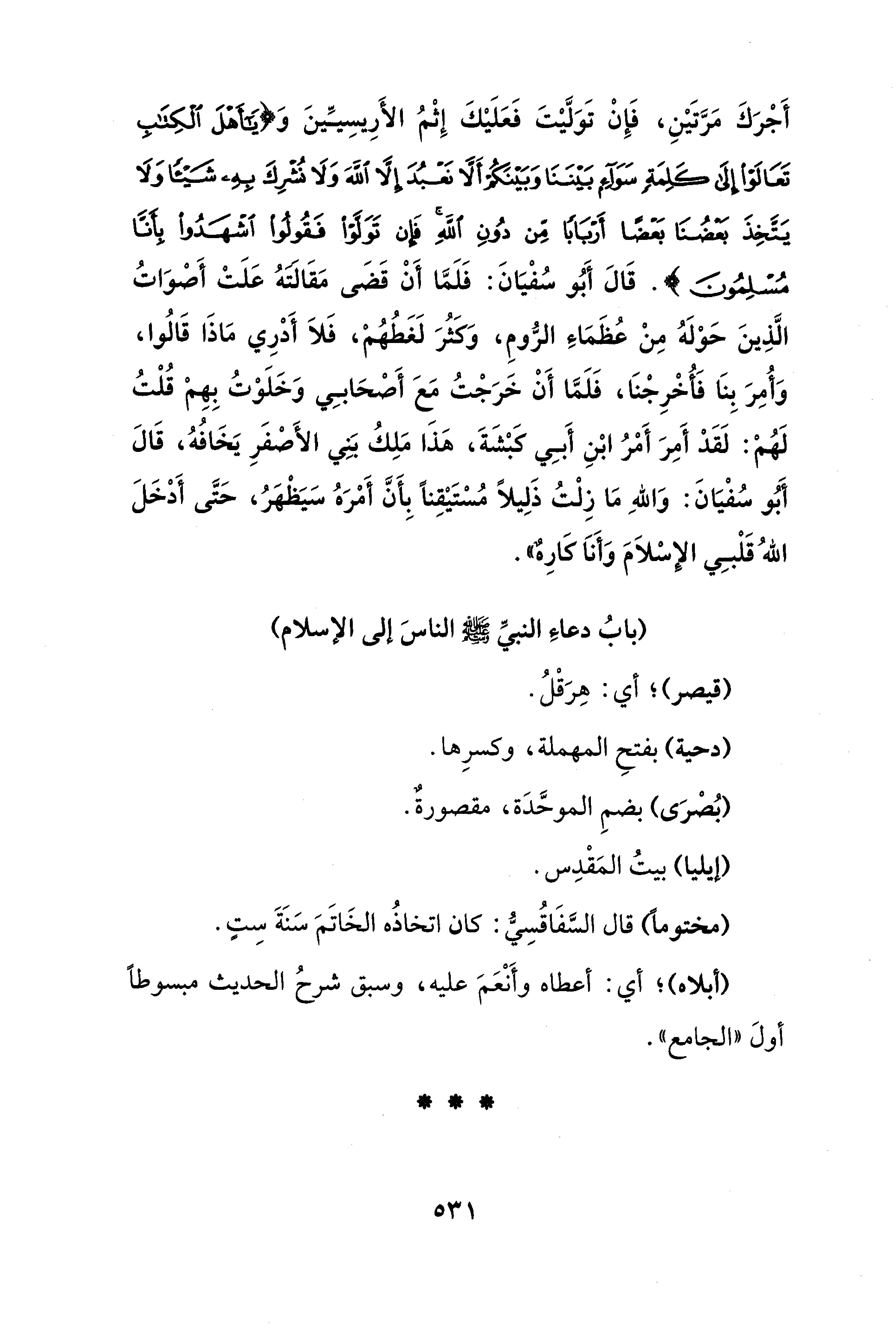 أَجْرَكَ مَرَّتَيْنِ، فَإِنْ تَوَلَّيْتَ فَعَلَيْكَ إِثْمُ الأَرِيسِيِّينَ وَ {يَاأَهْلَ الْكِتَابِ تَعَالَوْا إِلَى كَلِمَةٍ سَوَاءٍ بَيْنَنَا وَبَيْنَكُمْ أَلَّا نَعْبُدَ إلا اللَّهَ وَلَا نُشْرِكَ بِهِ شَيْئًا وَلَا يَتَّخِذَ بَعْضُنَا بَعْضًا أَرْبَابًا مِنْ دُونِ اللَّهِ فَإِنْ تَوَلَّوْا فَقُولُوا اشْهَدُوا بِأَنَّا مُسْلِمُونَ}. قَالَ أَبُو سُفْيَانَ: فَلَمَّا أَنْ قَضَى مَقَالَتَهُ عَلَتْ أَصْوَاتُ الَّذِينَ حَوْلَهُ مِنْ عُظَمَاءِ الرُّومِ، وَكَثُرَ لَغَطُهُمْ، فَلاَ أَدْرِي مَاذَا قَالُوا، وَأُمِرَ بِنَا فأُخْرِجْنَا، فَلَمَّا أَنْ خَرَجْتُ مَعَ أَصْحَابِي وَخَلَوْتُ بِهِمْ قُلْتُ لَهُمْ: لَقَدْ أَمِرَ أَمْرُ ابْنِ أَبِي كَبْشَةَ، هَذَا مَلِكُ بَنِي الأَصْفَرِ يَخَافُهُ، قَالَ أَبُو سُفْيَانَ: وَاللهِ مَا زِلْتُ ذَلِيلًا مُسْتَيْقِنًا بِأَنَّ أَمْرَهُ سَيَظْهَرُ، حَتَّى أَدْخَلَ اللهُ قَلْبِي الإِسْلاَمَ وَأَناَ كَارِهٌ".
