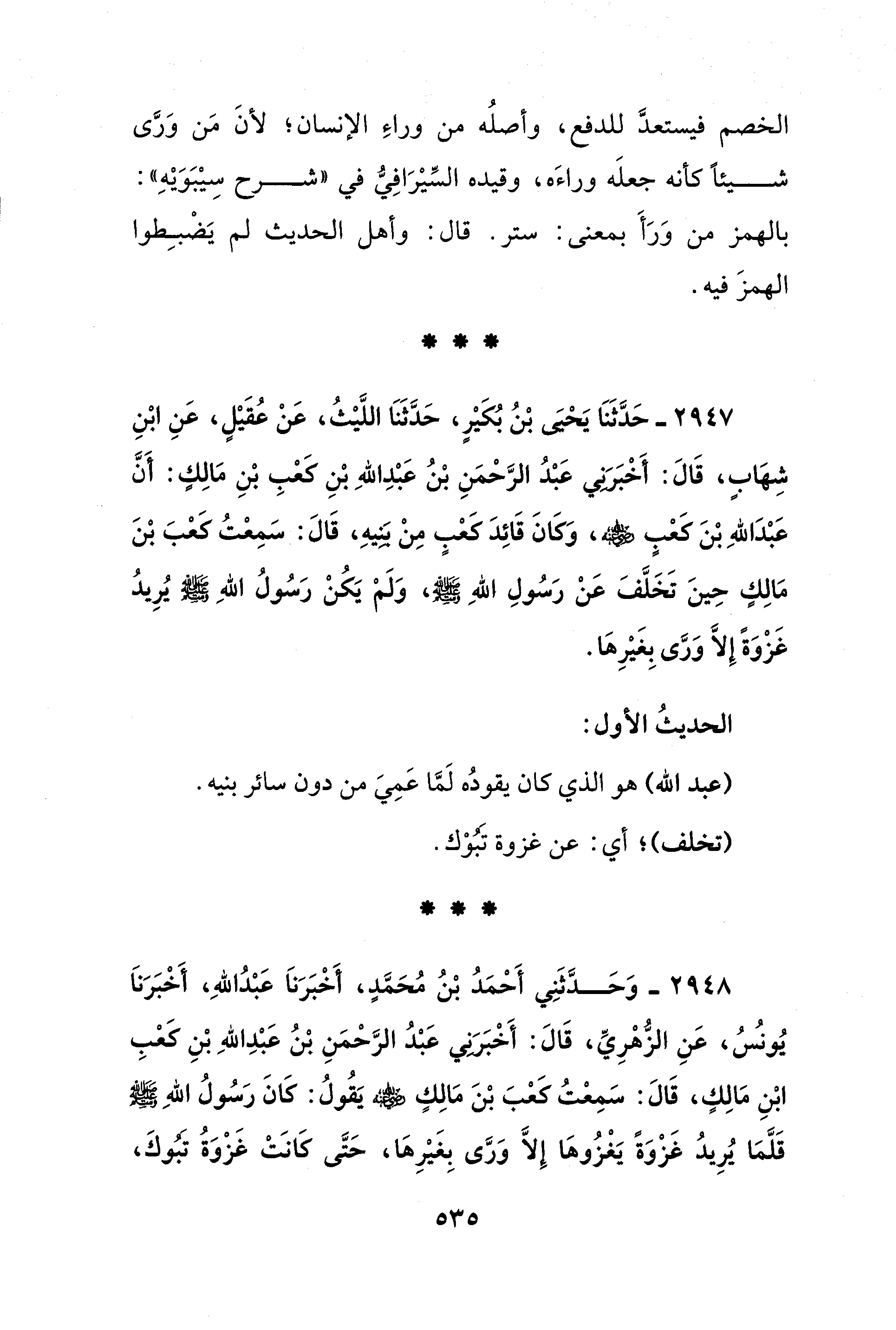 2947 - حَدَّثَنَا يَحْيَى بْنُ بُكَيْرٍ، حَدَّثَنَا اللَّيْثُ، عَنْ عُقَيْلٍ، عَنِ ابْنِ شِهَابٍ، قَالَ: أَخْبَرَنِي عَبْدُ الرَّحْمَنِ بْنُ عَبْدِ اللهِ بْنِ كعْبِ بْنِ مَالِكٍ: أَنَّ عَبْدَ اللهِ بْنَ كعْبٍ - رضي الله عنه -، وَكَانَ قَائِدَ كعْبٍ مِنْ بَنِيهِ، قَالَ: سَمِعْتُ كَعْبَ بْنَ مَالِكٍ حِينَ تَخَلَّفَ عَنْ رَسُولِ اللهِ - صلى الله عليه وسلم -، وَلَمْ يَكُنْ رَسُولُ اللهِ - صلى الله عليه وسلم - يُرِيدُ غَزْوَةً إِلَّا وَرَّى بِغَيْرِهَا.