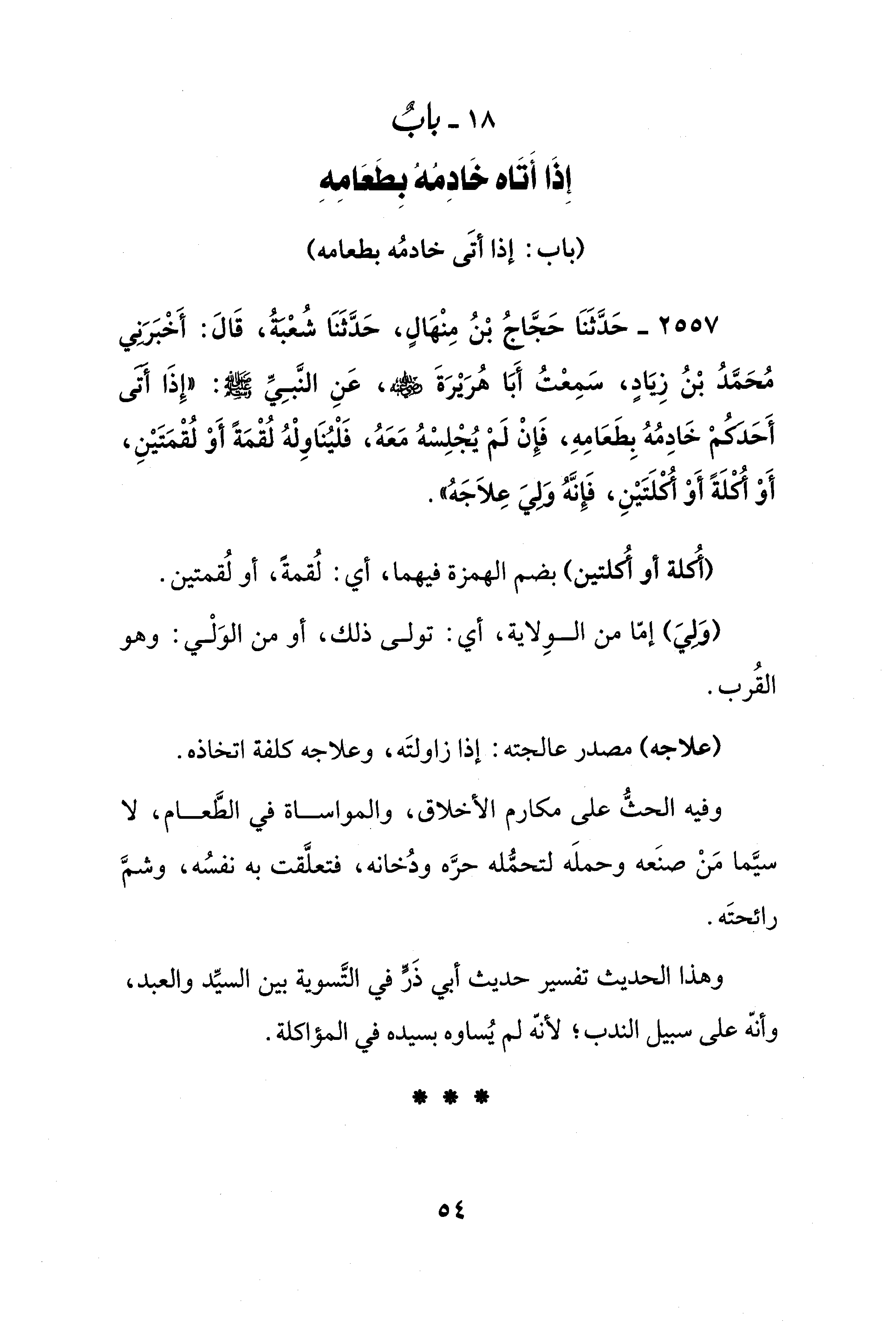 2557 - حَدَّثَنَا حَجَّاجُ بْنُ مِنْهَالٍ، حَدَّثَنَا شُعْبةُ، قَالَ: أَخْبَرني مُحَمَّدُ بْنُ زِيَادٍ، سَمِعْتُ أَبَا هُرَيْرَةَ - رضي الله عنه -، عَنِ النَّبِيِّ - صلى الله عليه وسلم -: "إِذَا أتى أَحَدكمْ خَادِمُهُ بِطَعَامِهِ، فَإِنْ لَمْ يُجْلِسْهُ مَعَهُ، فَلْيُنَاوِلْهُ لُقْمَةً أَوْ لُقْمَتَيْنِ، أَوْ أُكْلَةً أَوْ أُكلَتَيْنِ، فَإِنَّهُ وَلي عِلاَجَهُ".