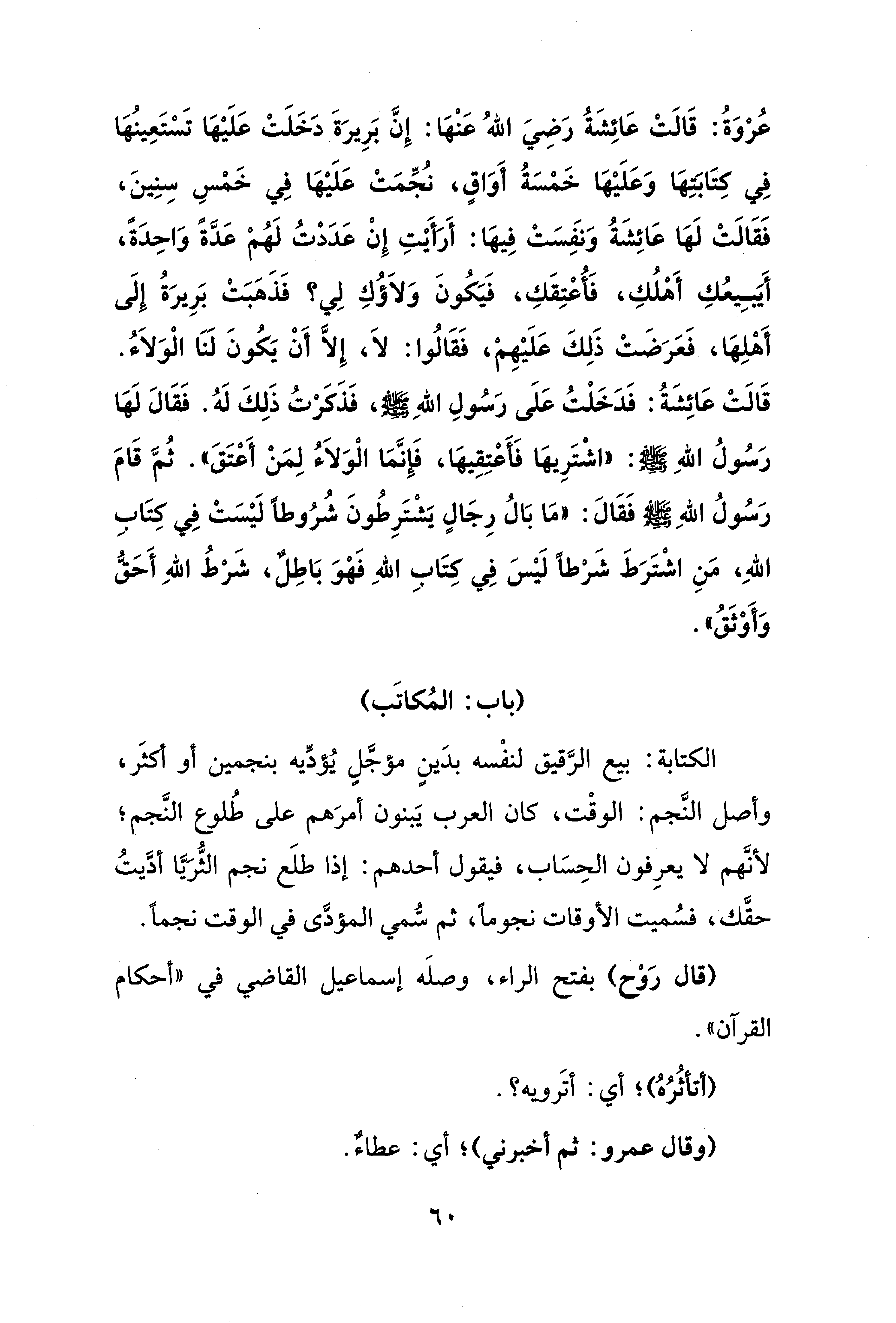 عُرْوَةُ: قَالَتْ عَائِشَةُ رَضِيَ اللهُ عَنْهَا: إِنَّ بَرِيرَةَ دَخَلَتْ عَلَيْهَا تَسْتَعِينُهَا فِي كتَابَتِهَا وَعَلَيْهَا خَمْسَةُ أَوَاقٍ، نُجِّمَتْ عَلَيْهَا فِي خَمْسِ سِنِينَ، فَقَالَتْ لَهَا عَائِشَةُ وَنَفِسَتْ فِيهَا: أَرَأَيْتِ إِنْ عَدَدْتُ لَهُمْ عَدَّةً وَاحِدَةً، أَيَبِيعُكِ أَهْلُكِ، فَأُعْتِقَكِ، فَيَكُونَ وَلاَؤُكِ لِي؟ فَذَهَبَتْ بَرِيرَةُ إِلَى أَهْلِهَا، فَعَرَضَتْ ذَلِكَ عَلَيْهِمْ، فَقَالُوا: لاَ، إِلَّا أَنْ يَكُونَ لَنَا الْوَلاَءُ. قَالَتْ عَائِشَةُ: فَدَخَلْتُ عَلَى رَسُولِ الله - صلى الله عليه وسلم -، فَذَكَرْتُ ذَلِكَ لَهُ. فَقَالَ لَهَا رَسُولُ الله - صلى الله عليه وسلم -: "اشْتَرِيهَا فَأعْتِقِيهَا، فَإِنَّمَا الْوَلاَءُ لِمَنْ أَعْتَقَ". ثُمَّ قَامَ رَسُولُ الله - صلى الله عليه وسلم - فَقَالَ: "مَا بَالُ رِجَالٍ يَشْتَرِطُونَ شُرُوطًا لَيْسَتْ فِي كتَابِ الله، مَنِ اشْتَرَطَ شَرْطًا لَيْسَ فِي كتَابِ الله فَهْوَ بَاطلٌ، شَرْطُ الله أَحَقُّ وَأَوْثَقُ".