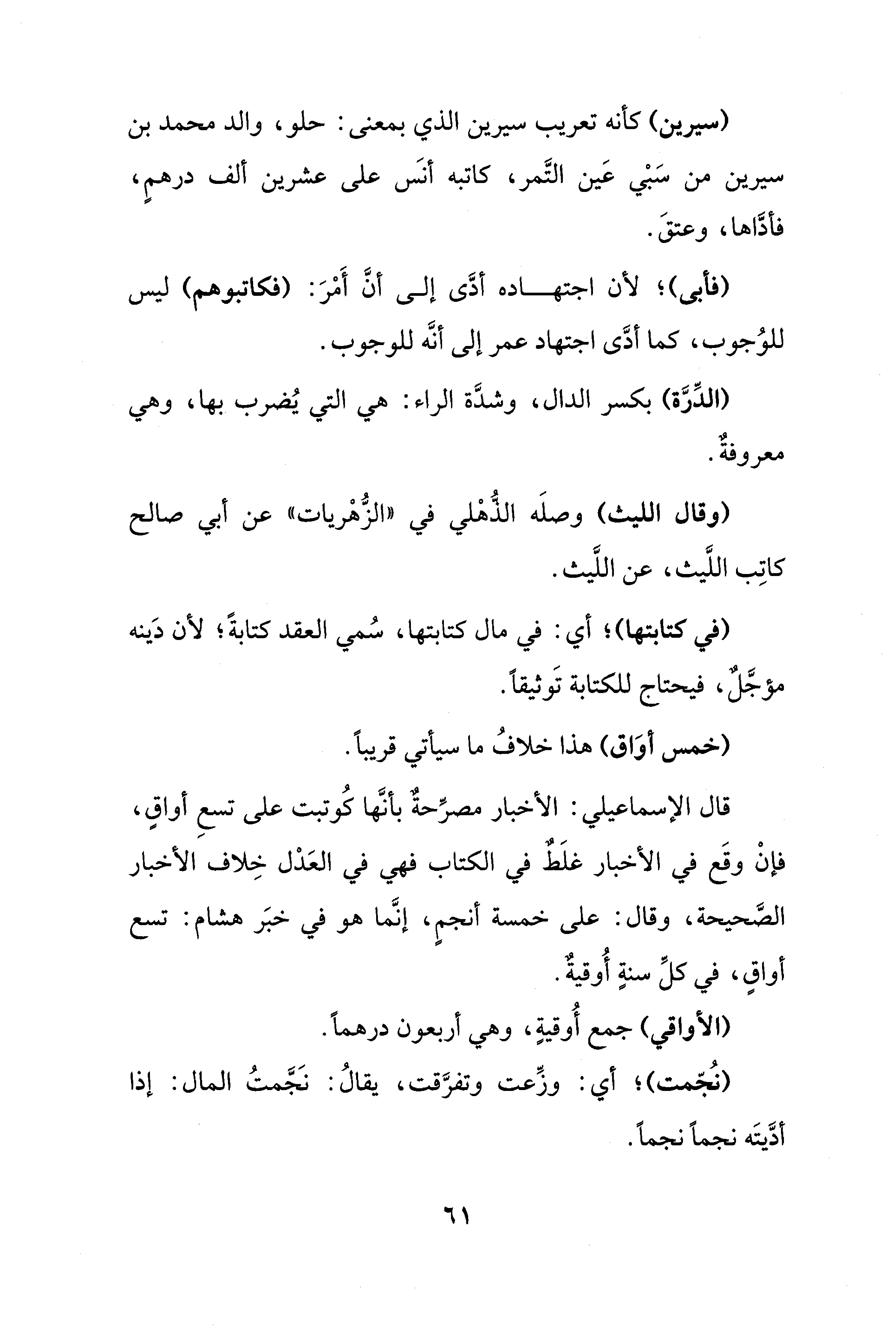 قال الإسماعيلي: الأخبار مصرحة بأنَّها كُوتبت على تسعِ أواقٍ، فإنْ وقَع في الأخبار غلَطٌ في الكتاب فهي في العَدْل خِلاف الأخبار الصَّحيحة، وقال: على خمسة أنجمٍ، إنَّما هو في خبَر هشام: تسع أواقٍ، في كلِّ سنةٍ أُوقيةٌ.