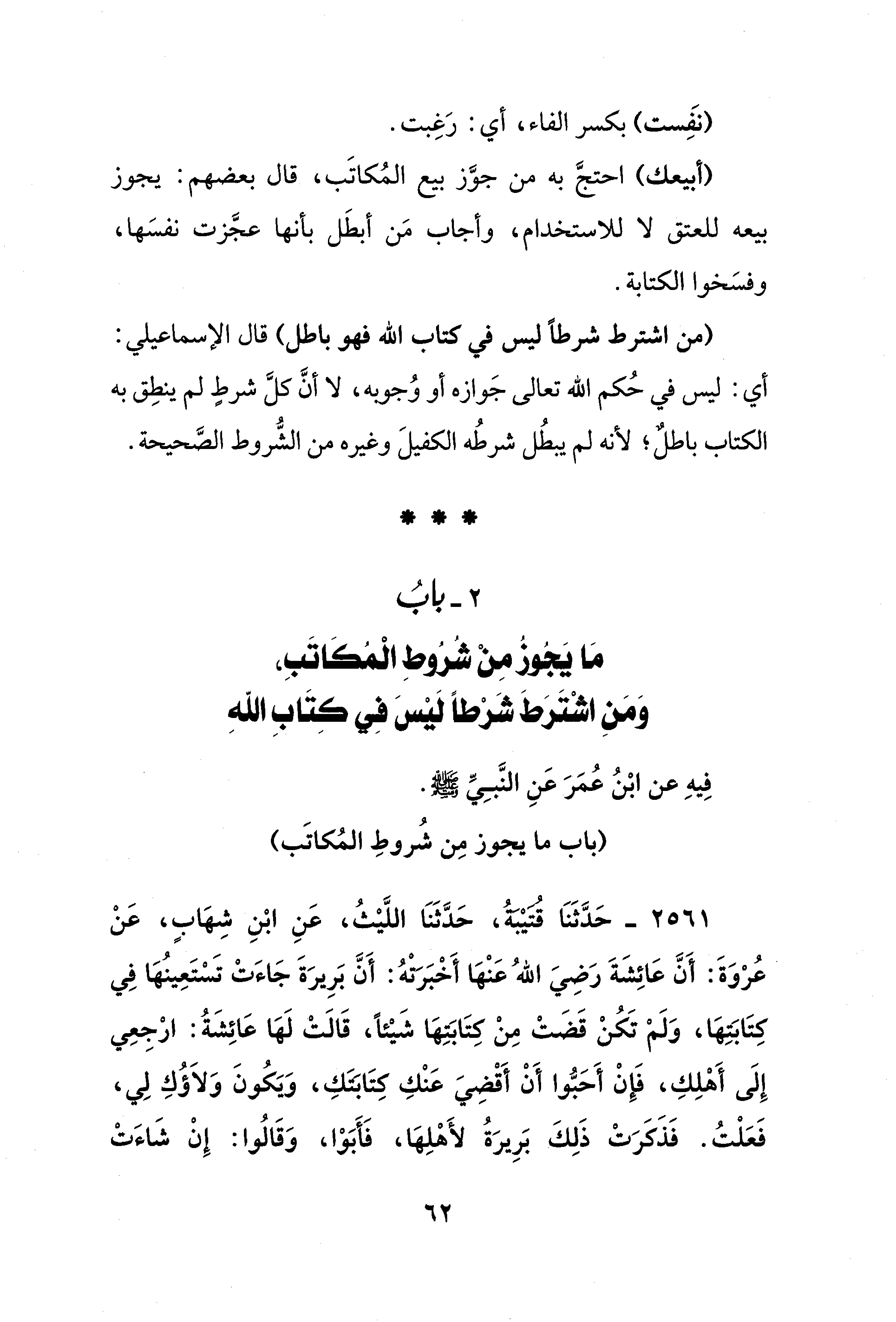 2 - بابُ مَا يَجُوزُ مِنْ شُرُوط الْمُكاتَبِ، وَمَنِ اشْتَرَاط شَرْطًا لَيْسَ فِي كتَابِ الله