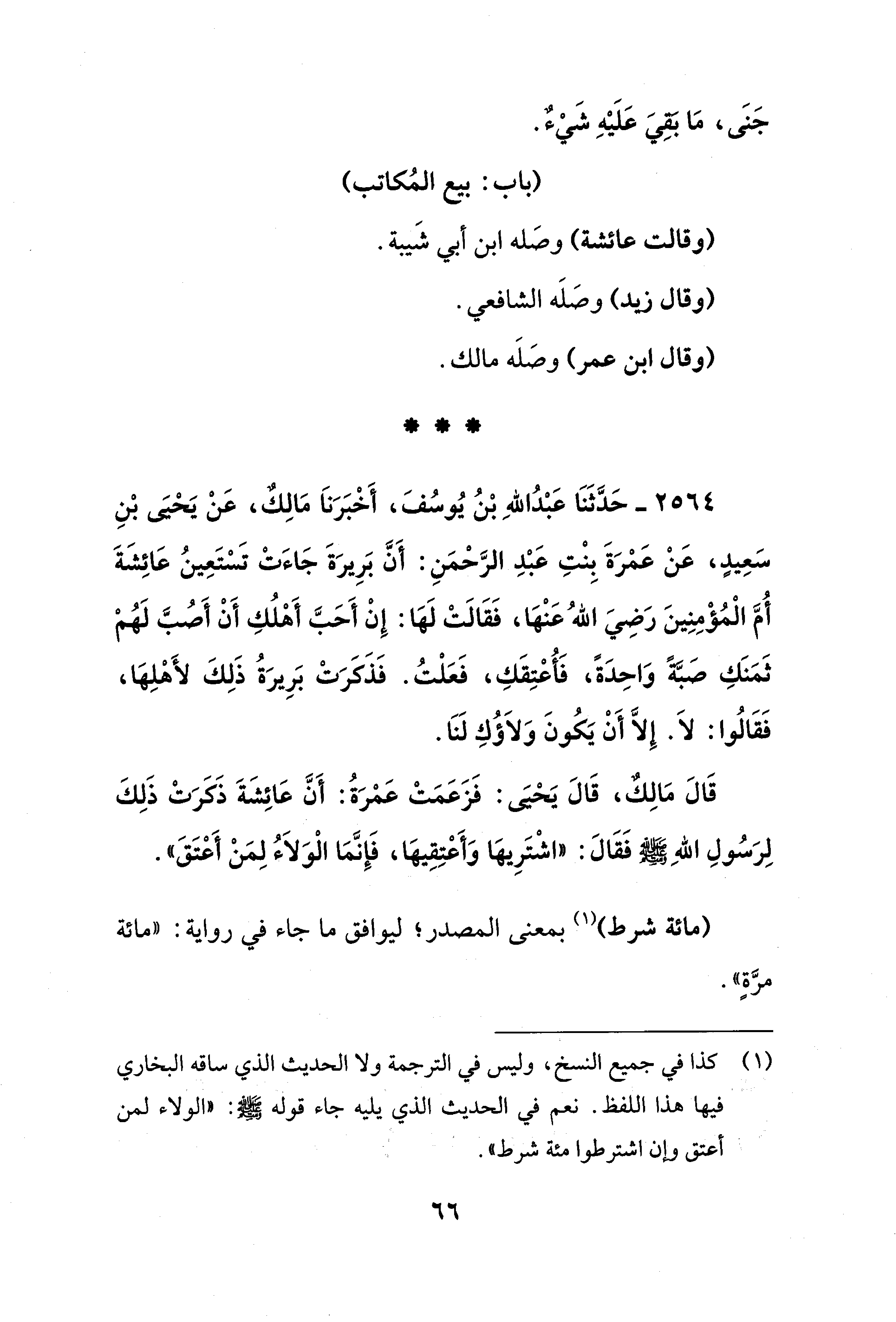 2564 - حَدَّثَنَا عَبْدُ اللهِ بْنُ يُوسُفَ، أَخْبَرَنَا مَالِكٌ، عَنْ يَحْيَى بْنِ سَعِيدٍ، عَنْ عَمْرَةَ بِنْتِ عَبْدِ الرَّحْمَنِ: أَنَّ بَرِيرَةَ جَاءَتْ تَسْتَعِينُ عَائِشَةَ أُمَّ الْمُؤْمِنِينَ رَضِيَ الله عَنْهَا، فَقَالَتْ لَهَا: إِنْ أَحَبَّ أَهْلُكِ أَنْ أَصُبَّ لَهُمْ ثَمَنَكِ صَبَّةً وَاحِدَةً، فَأُعْتِقَكِ، فَعَلْتُ. فَذَكَرَتْ بَرِيرَةُ ذَلِكَ لأَهْلِهَا، فَقَالُوا: لاَ. إِلَّا أَنْ يَكُونَ وَلاَؤُكِ لَنَا.