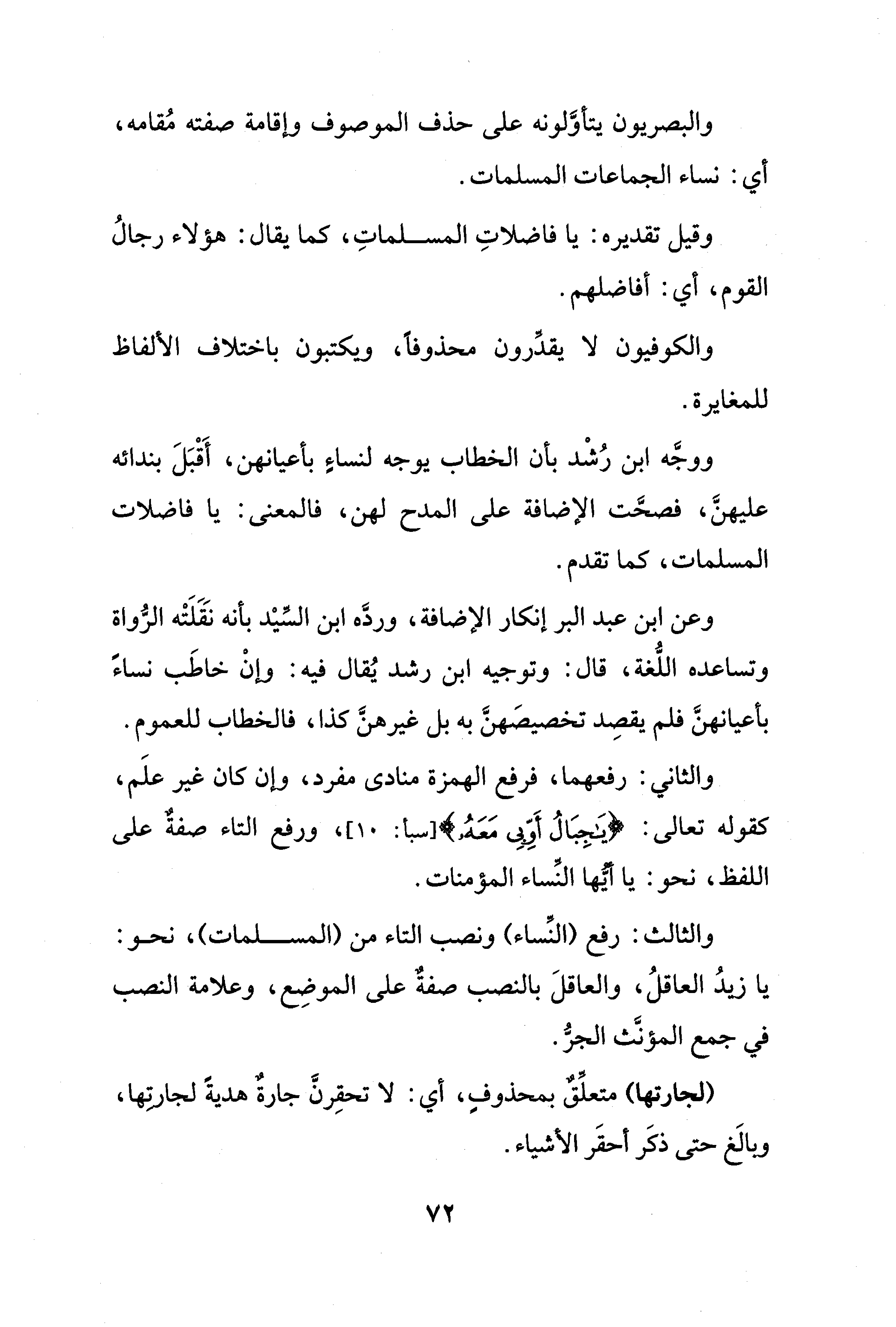 ووجَّه ابن رُشْد بأن الخطاب يوجه لنساءٍ بأعيانهن، أَقْبَلَ بندائه عليهنَّ، فصحَّت الإضافة على المدح لهن، فالمعنى: يا فاضلات المسلمات، كما تقدم.