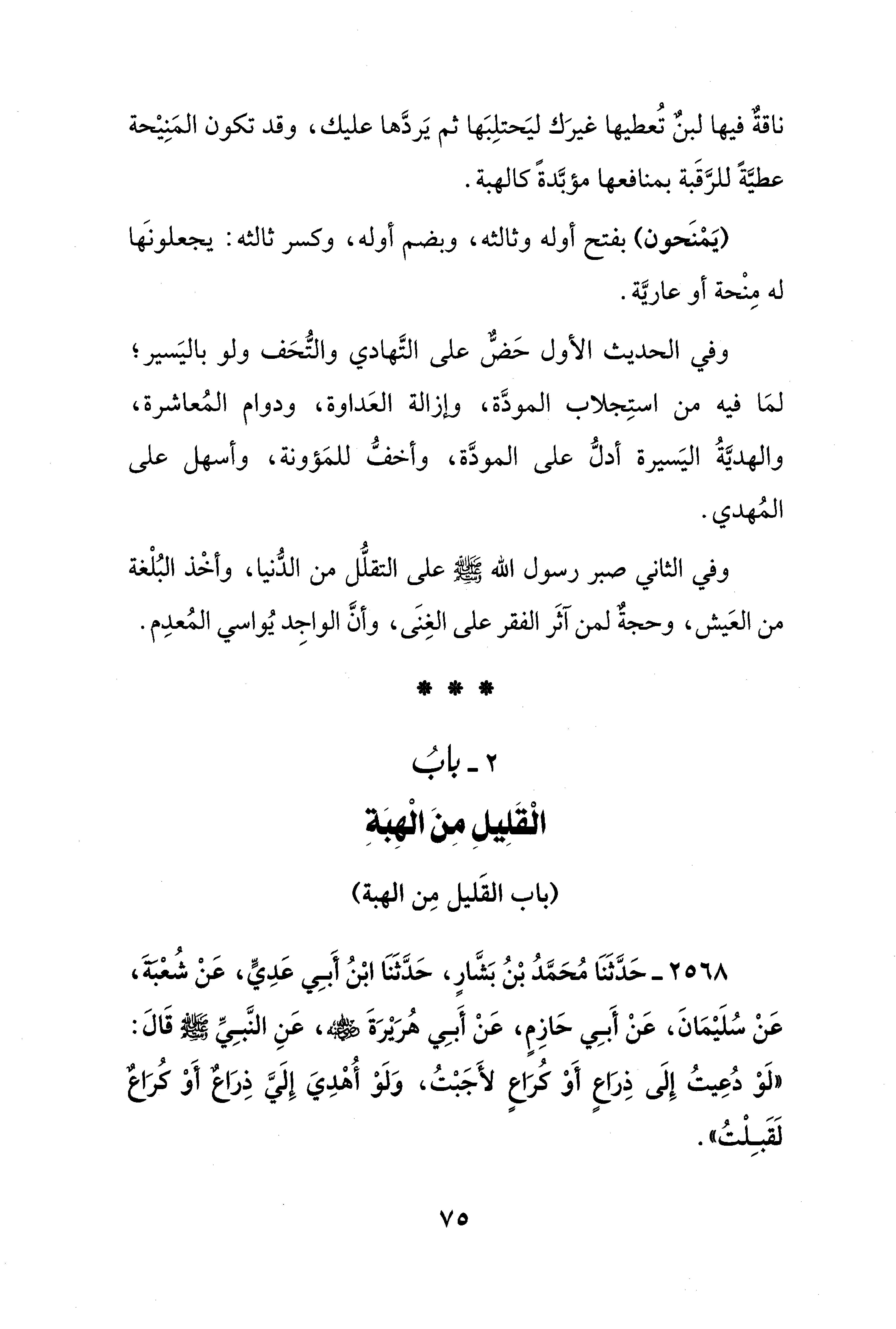 وفي الثاني صبر رسول الله - صلى الله عليه وسلم - على التقلُّل من الدُّنيا، وأخْذ البُلْغة من العَيش، وحجةٌ لمن آثَر الفقر على الغِنَى، وأنَّ الواجِد يُواسي المُعدِم.