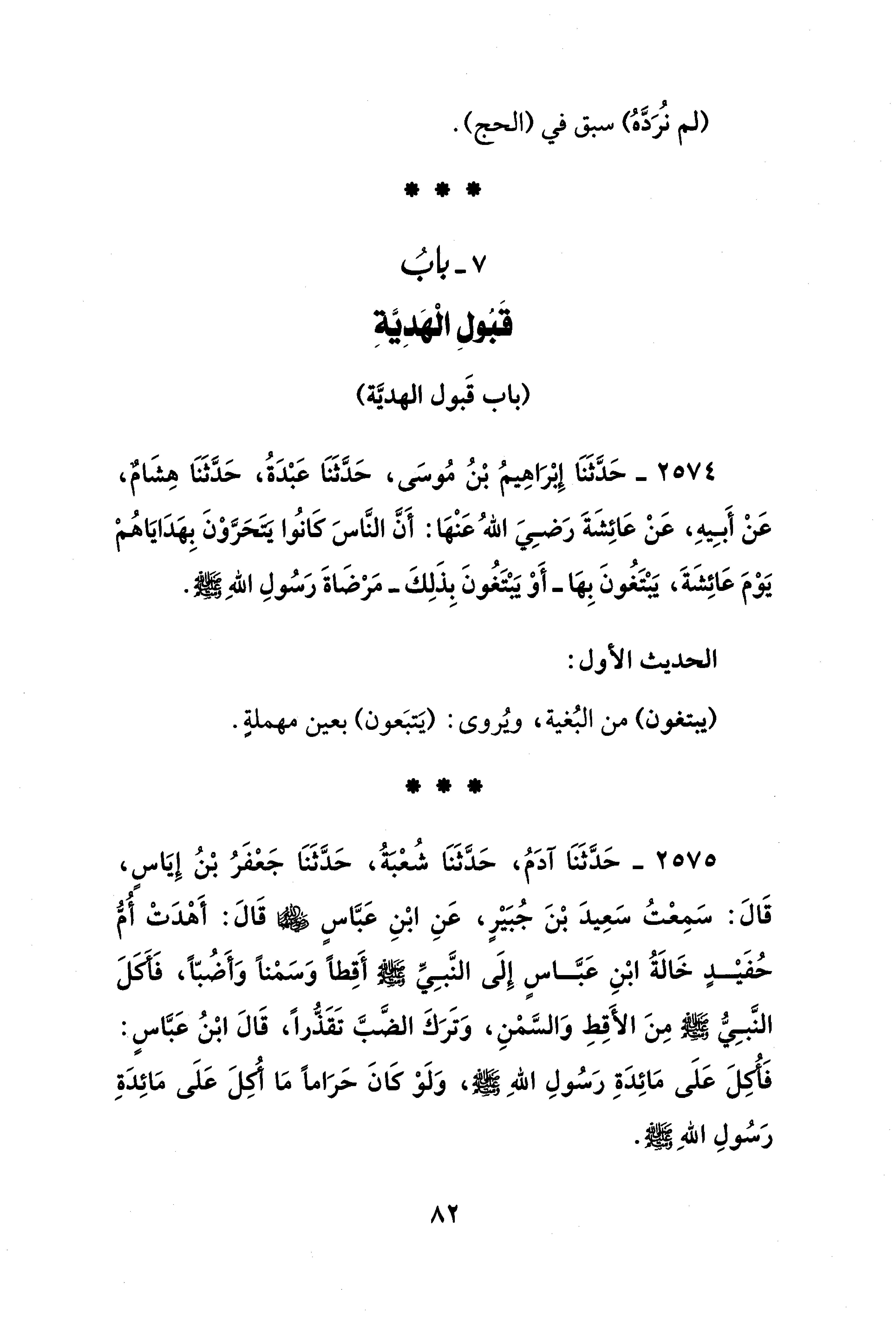 2575 - حَدَّثَنَا آدَمُ، حَدَّثَنَا شُعْبةُ، حَدَّثَنَا جَعْفَرُ بْنُ إِيَاسٍ، قَالَ: سَمِعْتُ سَعِيدَ بْنَ جُبَيْرٍ، عَنِ ابْنِ عَبَّاسٍ قَالَ: أَهْدَتْ أُمّ حُفَيْدٍ خَالَةُ ابْنِ عَبَّاسٍ إِلَى النَّبِيِّ - صلى الله عليه وسلم - أَقِطًا وَسَمْنًا وَأَضُبًّا، فَأكلَ النَّبِيُّ - صلى الله عليه وسلم - مِنَ الأَقِطِ وَالسَّمْنِ، وَتَرَكَ الضَّبَّ تَقَذُّرًا، قَالَ ابْنُ عَبَّاسٍ: فَأُكِلَ عَلَى مَائِدَةِ رَسُولِ اللهِ - صلى الله عليه وسلم -، وَلَو كَانَ حَرَامًا مَا أُكِلَ عَلَى مَائِدَةِ رَسُولِ اللهِ - صلى الله عليه وسلم -.