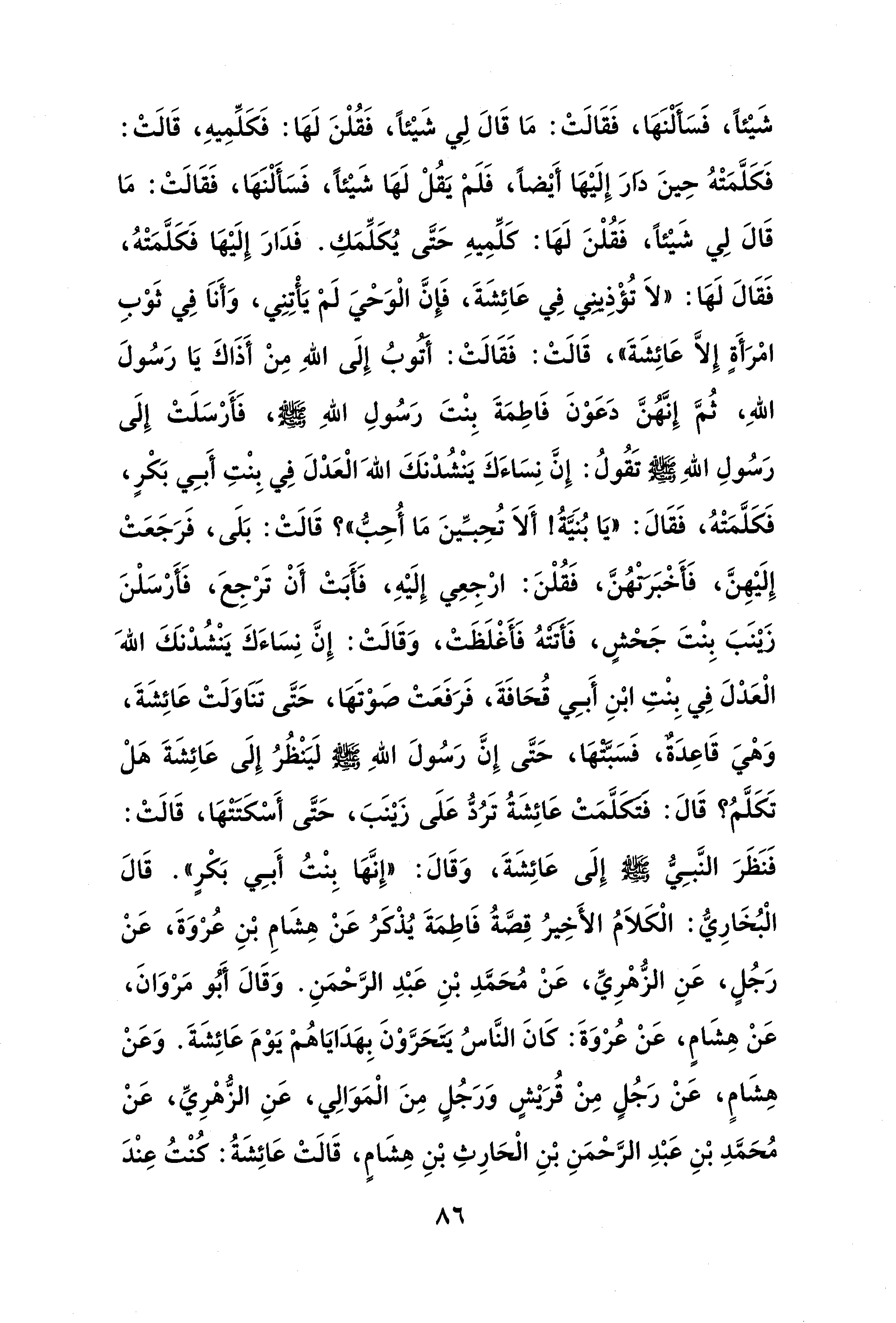 شَيْئًا، فَسَألْنَهَا، فَقَالَتْ: مَا قَالَ لِي شَيْئًا، فَقُلْنَ لَهَا: فَكَلِّمِيهِ، قَالَتْ: فَكَلَّمَتْهُ حِينَ دارَ إِلَيْهَا أَيْضًا، فَلَمْ يَقُلْ لَهَا شَيْئًا، فَسَألْنَهَا، فَقَالَتْ: مَا قَالَ لِي شَيْئًا، فَقُلْنَ لَهَا: كلِّمِيهِ حَتَّى يُكَلِّمَكِ. فَدَارَ إِلَيْهَا فَكَلَّمَتْهُ، فَقَالَ لَهَا: "لاَ تُؤْذِيني فِي عَائِشَةَ، فَإِنَّ الْوَحْيَ لَمْ يَأْتِنِي، وَأَناَ فِي ثَوْبِ امْرَأَةٍ إِلَّا عَائِشَةَ"، قَالَتْ: فَقَالَتْ: أتوبُ إِلَى اللهِ مِنْ أَذَاكَ يَا رَسُولَ اللهِ، ثُمَّ إِنَّهُنَّ دَعَوْنَ فَاطِمَةَ بِنْتَ رَسُولِ اللهِ - صلى الله عليه وسلم -، فَأَرْسَلَتْ إِلَى رَسُولِ اللهِ - صلى الله عليه وسلم - تَقُولُ: إِنَّ نِسَاءَكَ يَنْشُدْنَكَ اللهَ الْعَدْلَ فِي بِنْتِ أَبِي بَكْرٍ، فَكَلَّمَتْهُ، فَقَالَ: "يَا بُنَيَّةُ! أَلاَ تُحِبِّينَ مَا أُحِبُّ"؟ قَالَتْ: بَلَى، فَرَجَعَتْ إِلَيْهِنَّ، فَأَخْبَرتهُنَّ، فَقُلْنَ: ارْجِعِي إِلَيْهِ، فَأَبَتْ أَنْ تَرْجِعَ، فَأَرْسَلْنَ زينَبَ بِنْتَ جَحْشٍ، فَأتته فَأَغْلَظَتْ، وَقَالَتْ: إِنَّ نِسَاءَكَ يَنْشُدْنَكَ اللهَ الْعَدْلَ فِي بِنْتِ ابْنِ أَبِي قُحَافَةَ، فَرَفَعَتْ صَوْتَهَا، حَتَّى تَنَاوَلَتْ عَائِشَةَ، وَهْيَ قَاعِدَةٌ، فَسَبَّتهَا، حَتَّى إِنَّ رَسُولَ اللهِ - صلى الله عليه وسلم - لَيَنْظُرُ إِلَى عَائِشَةَ هَلْ تَكَلَّمُ؟ قَالَ: فتكَلَّمَتْ عَائِشَةُ تَرُدُّ عَلَى زَيْنَبَ، حَتَّى أَسْكَتتهَا، قَالَتْ: فَنَظَرَ النَّبِيُّ - صلى الله عليه وسلم - إِلَى عَائِشَةَ، وَقَالَ: "إِنَّهَا بِنْتُ أَبِي بَكْرٍ". قَالَ الْبُخَارِيُّ: الْكَلاَمُ الأَخِيرُ قِصَّةُ فَاطِمَةَ يُذْكرُ عَنْ هِشَامِ بْنِ عُرْوَةَ، عَنْ رَجُلٍ، عَنِ الزُّهْرِيِّ، عَنْ مُحَمَّدِ بْنِ عَبْدِ الرَّحْمَنِ. وَقَالَ أَبُو مَرْوَانَ، عَنْ هِشَامٍ، عَنْ عُرْوَةَ: كَانَ النَّاسُ يتحَرَّوْنَ بِهَدَايَاهُمْ يَوْمَ عَائِشَةَ. وَعَنْ هِشَامٍ، عَنْ رَجُلٍ مِنْ قُرَيْشٍ وَرَجُلٍ مِنَ الْمَوَالِي، عَنِ الزُّهْرِيِّ، عَنْ مُحَمَّدِ بْنِ عَبْدِ الرَّحْمَنِ بْنِ الْحَارِثِ بْنِ هِشَامٍ، قَالَتْ عَائِشَةُ: كُنْتُ عِنْدَ
