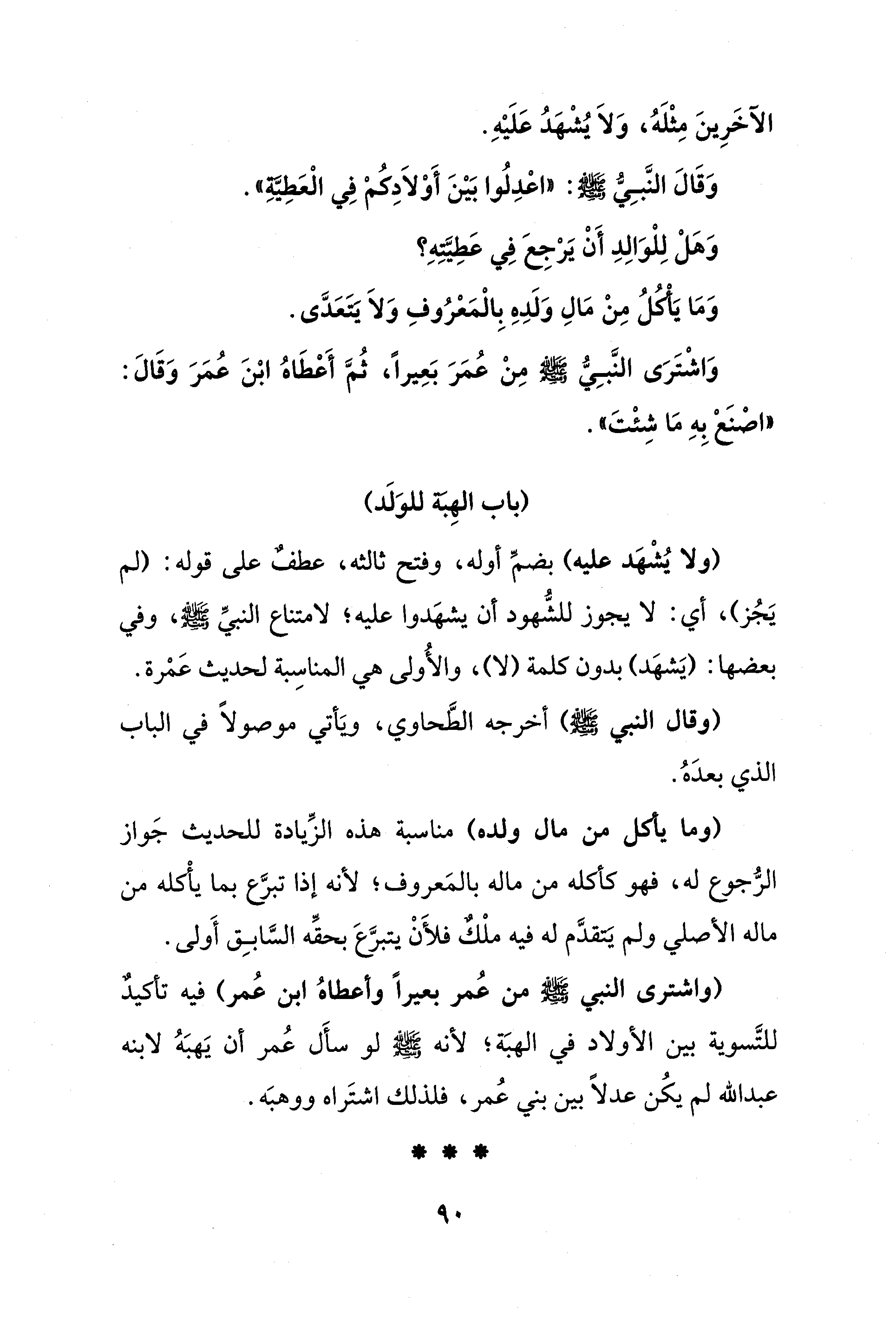 (واشترى النبي - صلى الله عليه وسلم - من عُمر بعيرًا وأعطاهُ ابن عُمر) فيه تأكيدٌ للتَّسوية بين الأولاد في الهبَة، لأنه - صلى الله عليه وسلم - لو سأَل عُمر أن يَهبَهُ لابنه عبد الله لم يكُن عدلًا بين بني عُمر، فلذلك اشتَراه ووهبَه.