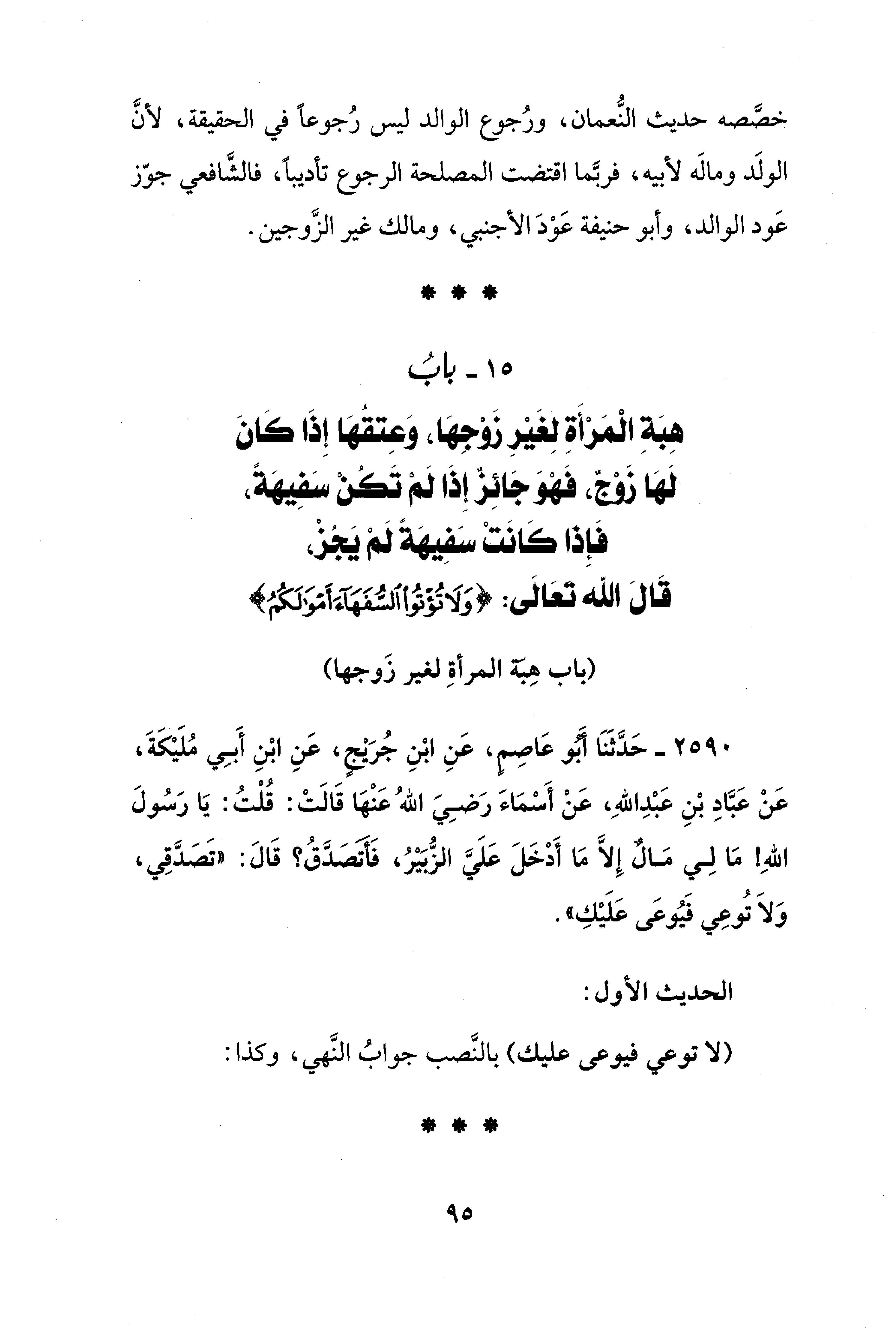 15 - بابُ هِبَةَ الْمرْأَةِ لِغَيرِ زوجِهَا، وَعِتقُهَا إِذَا كانَ لَهَا زوجٌ، فَهْوَ جَائِزٌ إِذَا لَمْ تَكنْ سَفِيهَةً، فَإِذا كانَ سَفِيهَةَ لَمْ يجُزْ، قالَ الله تعَالَى: {وَلَا تُؤْتُوا السُّفَهَاءَ أَمْوَالَكُمُ}