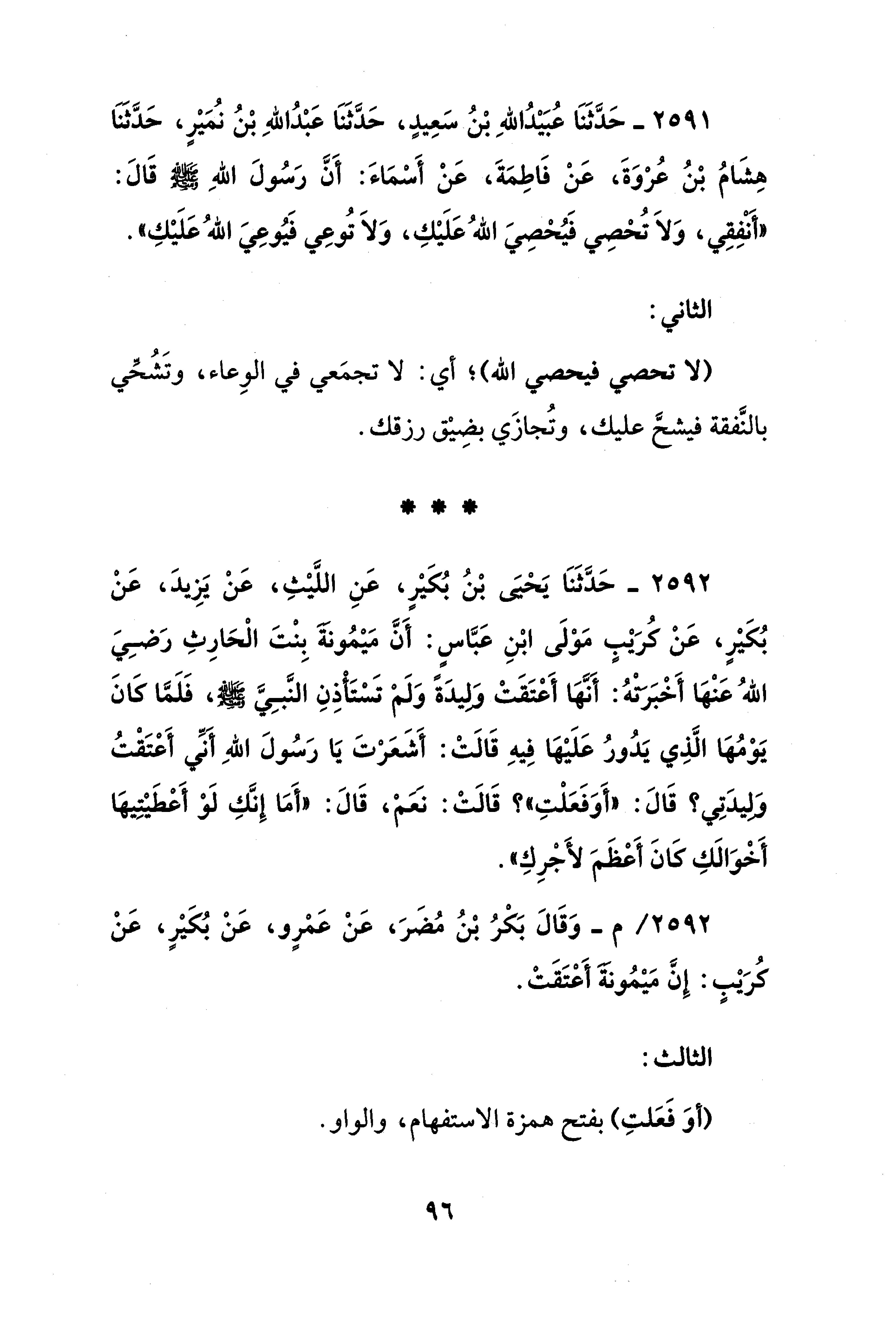 2591 - حَدَّثنا عُبيدُ اللهِ بْنُ سَعِيد، حَدَّثَنَا عَبْدُ اللهِ بْنُ نُمَيْرٍ، حَدَّثنا هِشَامُ بْنُ عُرْوَةَ، عَنْ فَاطِمَةَ، عَنْ أَسْمَاءَ: أَنَّ رَسُولَ اللهِ - صلى الله عليه وسلم - قَالَ: "أَنْفِقِي، وَلاَ تُحْصِي فَيُحْصِيَ اللهُ عَلَيْكِ، وَلاَ تُوعِي فَيُوعي اللهُ عَلَيْكِ".