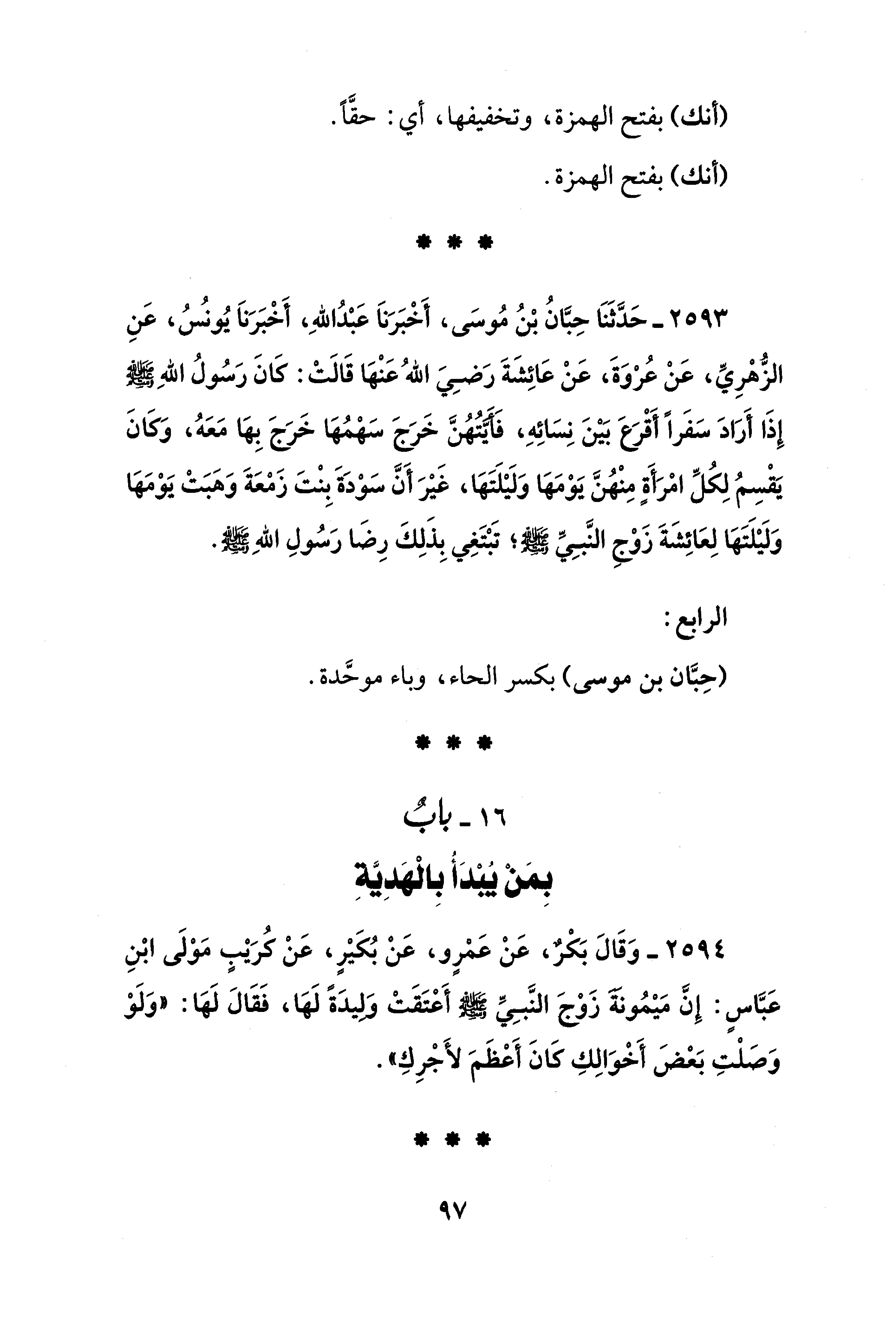 2593 - حَدَّثنا حِبَّانُ بْنُ مُوسَى، أَخْبَرَنَا عَبْدُ اللهِ، أَخْبَرَنَا يُونس، عَنِ الزُّهْرِيِّ، عَنْ عُرْوَةَ، عَنْ عَائِشَةَ رَضِيَ اللهُ عَنْهَا قَالَتْ: كَانَ رَسُولُ اللهِ - صلى الله عليه وسلم - إذَا أَرَادَ سَفَرًا أَقْرَعَ بَيْنَ نِسَائِهِ، فَأيَّتُهُنَّ خَرَجَ سَهْمُهَا خَرَجَ بِهَا مَعَهُ، وَكَانَ يَقْسِمُ لِكُلِّ امْرَأَةٍ مِنْهُنَّ يَوْمَهَا وَلَيْلَتَهَا، غَيْرَ أَنَّ سَوْدَةَ بِنْتَ زَمْعَةَ وَهَبَتْ يَوْمَهَا وَلَيْلَتَهَا لِعَائِشَةَ زَوْجِ النَّبِيِّ - صلى الله عليه وسلم -؛ تَبْتَغِي بِذَلِكَ رِضَا رَسُولِ اللهِ - صلى الله عليه وسلم -.