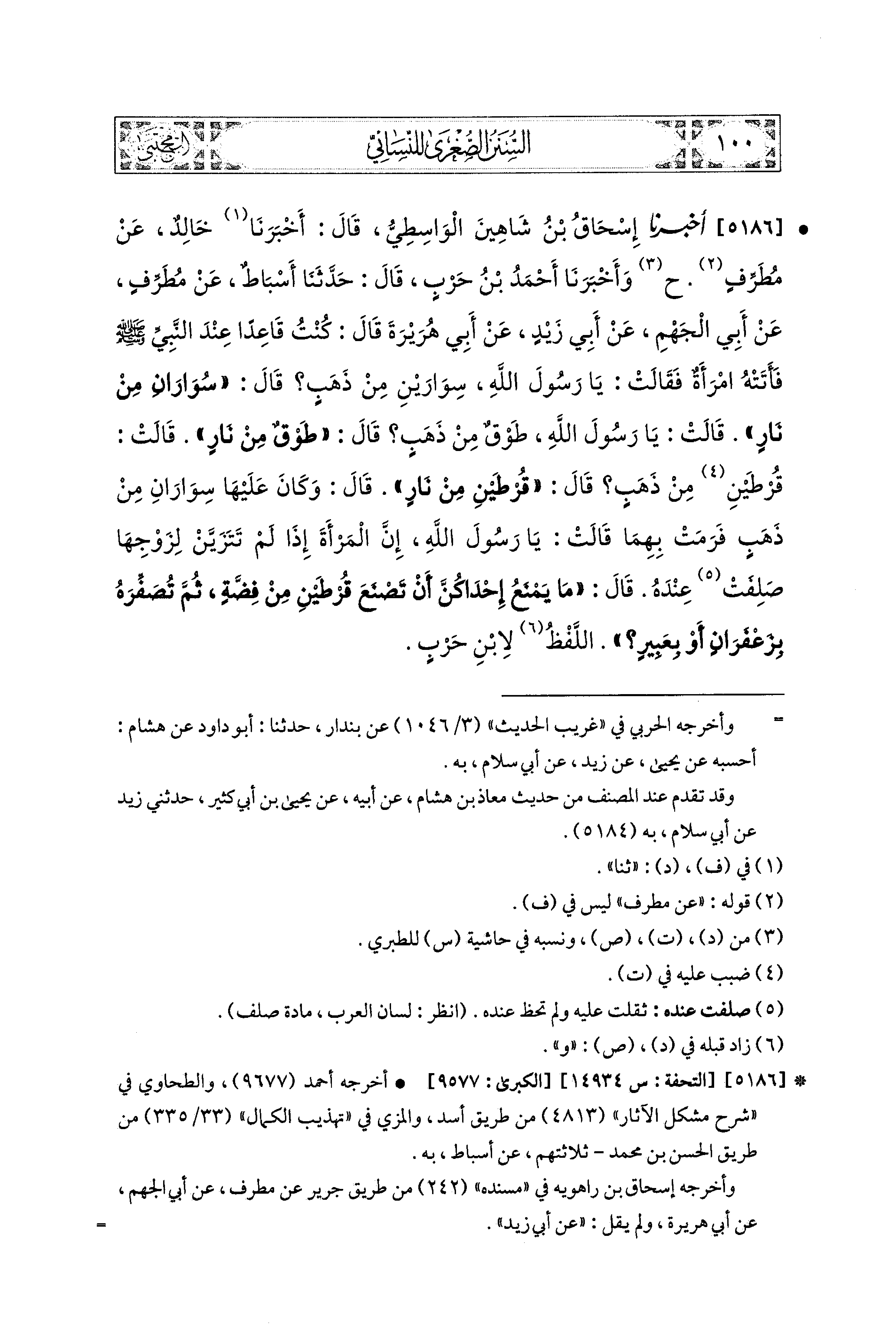 5186- أَخبَرَنا إِسحَاقُ بنُ شَاهِينَ الوَاسِطِيُّ، قَالَ: أَخبرنا خَالِدٌ، عَن مُطَرِّفٍ (ح) وَأَخبرنا أَحْمَدُ بنُ حَرْبٍ، قال: حَدَّثنا أَسْبَاطٌ، عَن مُطَرِّفٍ، عَن أَبي الجَهْمِ، عَن أَبي زَيْدٍ، عَن أَبي هُرَيْرَةَ قَالَ: كُنْتُ قَاعِدًا عِنْدَ النَّبيِّ صَلى الله عَليه وسَلم فَأَتَتْهُ امْرَأَةٌ، فَقَالَتْ: يَا رَسُولَ اللهِ، سِوَارَيْنِ مِنْ ذَهَبٍ، قَالَ: سِوَارَانِ مِنْ نَارٍ، قَالَتْ: يَا رَسُولَ اللهِ، طَوْقٌ مِنْ ذَهَبٍ، قَالَ: طَوْقٌ مِنْ نَارٍ، قَالَتْ: قُرْطَيْنِ مِنْ ذَهَبٍ، قَالَ: قُرْطَيْنِ مِنْ نَارٍ، قَالَ: وَكَانَ عَلَيهَا سِوَارَانِ مِنْ ذَهَبٍ، فَرَمَتْ بِهِمَا، قَالَتْ: يَا رَسُولَ اللهِ، إِنَّ المَرْأَةَ إِذَا لَمْ تَتَزَيَّنْ لِزَوْجِهَا صَلِفَتْ عِنْدَهُ، قَالَ: مَا يَمْنَعُ إِحْدَاكُنَّ أَنْ تَصْنَعَ قُرْطَيْنِ مِنْ فِضَّةٍ، ثُمَّ تُصَفِّرَهُ بِزَعْفَرَانٍ، أَوْ بِعَبِيرٍ.