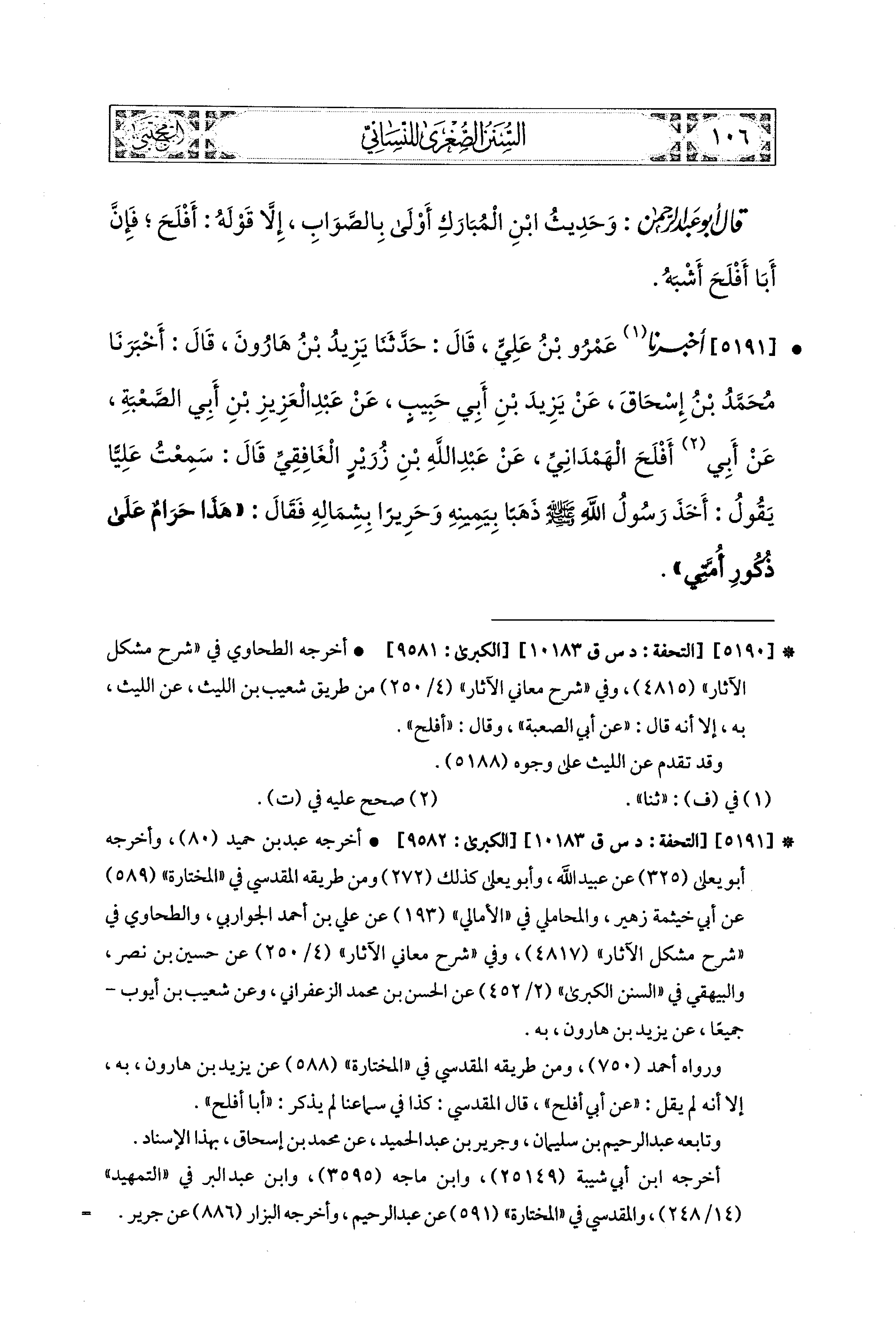 5191- أَخبَرَنا عَمْرُو بنُ عَلِيٍّ، قال: حَدَّثنا يَزِيدُ بنُ هَارُونَ، قَالَ: أَخبرنا مُحَمدُ بنُ إِسحَاقَ، عَن يَزِيدَ بْنِ أَبي حَبِيبٍ، عَن عَبدِ العَزِيزِ بْنِ أَبي الصَّعْبَةِ، عَن أَبي أَفْلَحَ الهَمْدَانِيِّ، عَن عَبد اللهِ بن زُرَيْرٍ الغَافِقِيِّ، قَالَ: سَمِعْتُ عَلِيًّا يَقُولُ: أَخَذَ رَسُولُ اللهِ صَلى الله عَليه وسَلم ذَهَبًا بِيَمِينِهِ، وَحَرِيرًا بِشِمَالِهِ، فَقَالَ: هَذَا حَرَامٌ عَلَى ذُكُورِ أُمَّتِي.