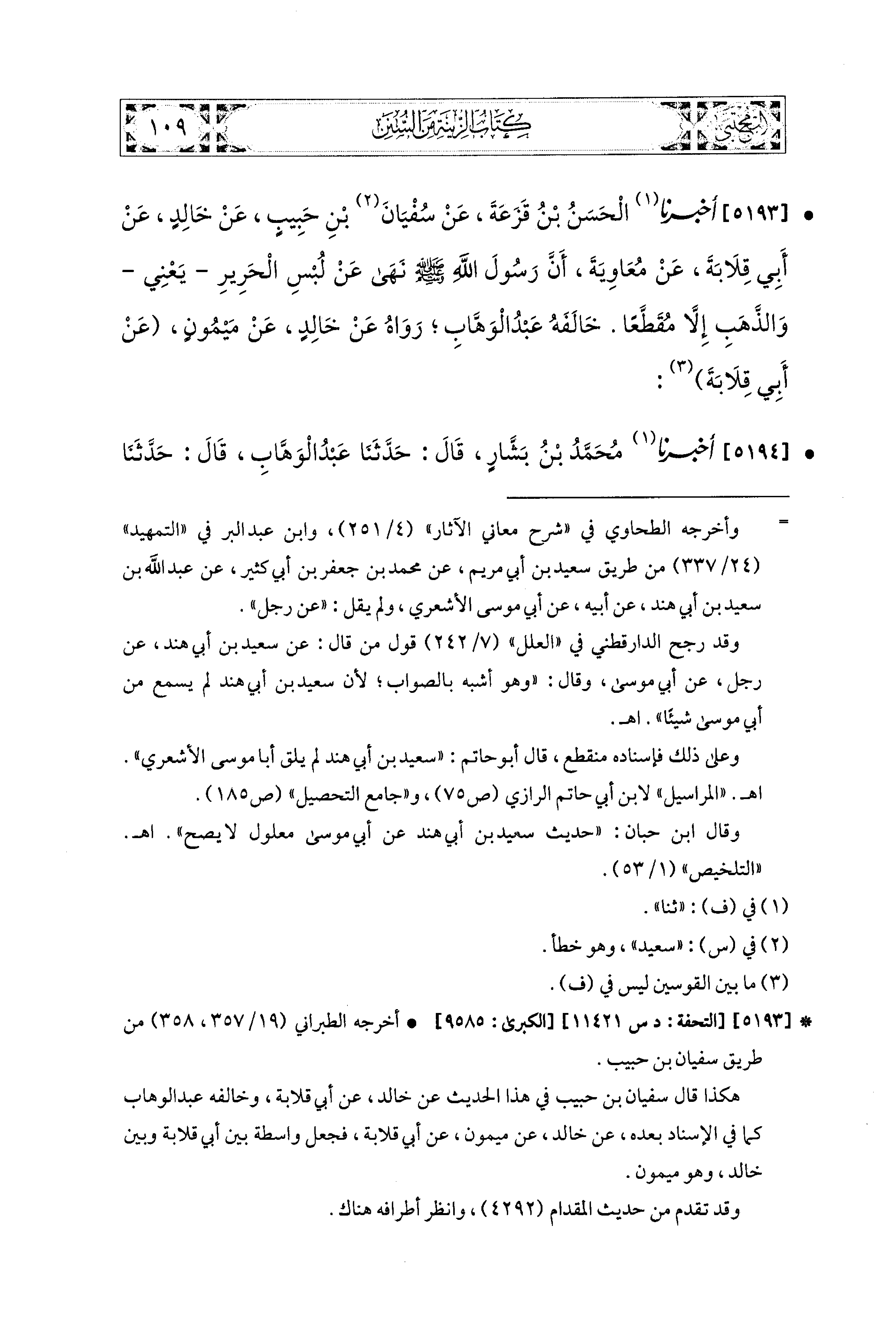 5193- أَخبَرَنا الحَسَنُ بنُ قَزَعَةَ، عَن سُفيَانَ بْنِ حَبِيبٍ، عَن خَالِدٍ، عَن أَبي قِلاَبَةَ، عَن مُعَاوِيَةَ، أَنَّ رَسُولَ اللهِ صَلى الله عَليه وسَلم نَهَى عَن لُبْسِ الحَرِيرِ, يعني وَالذَّهَبِ إِلاَّ مُقَطَّعًا.