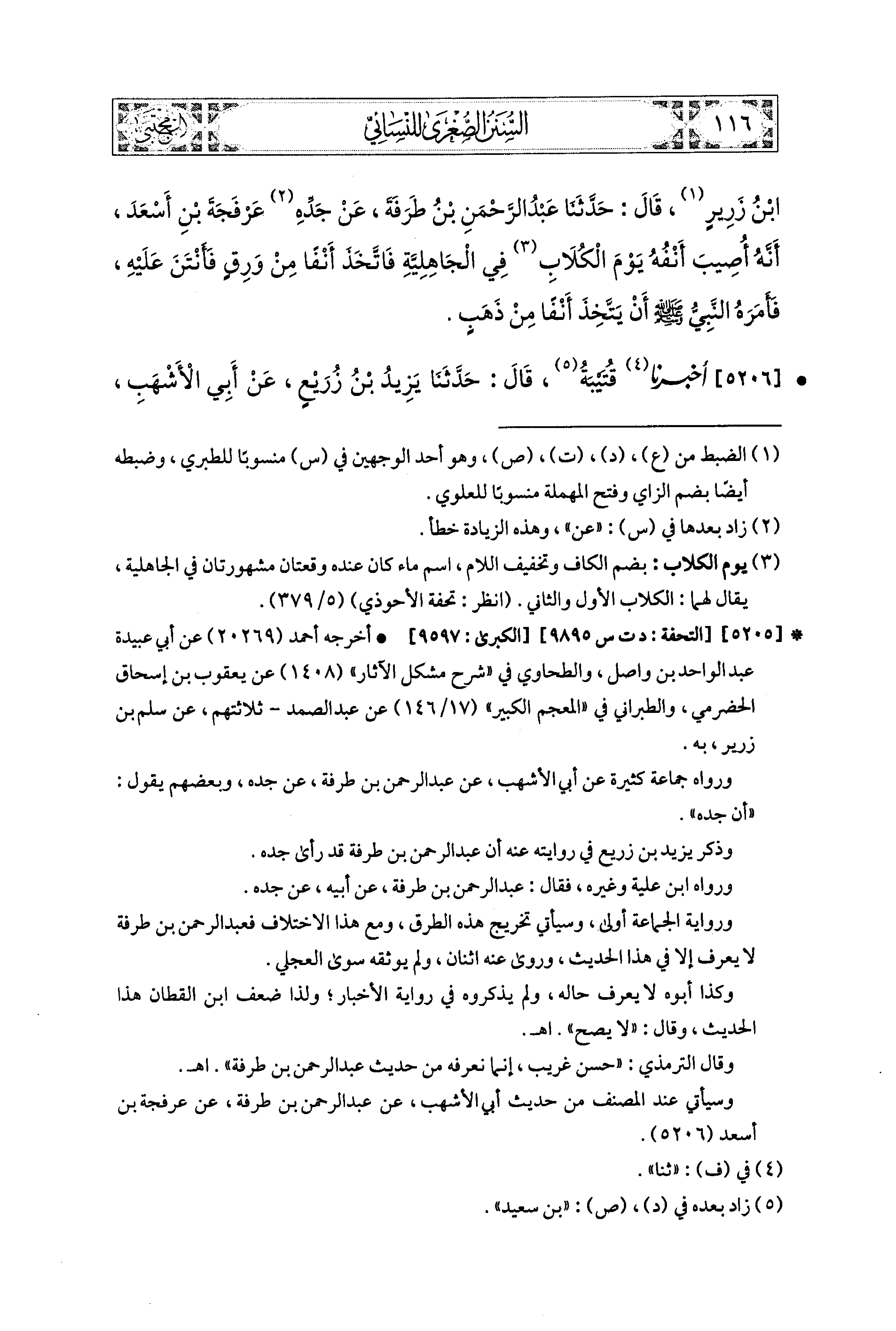 5206- أَخبَرَنا قُتَيبَةُ، قال: حَدَّثنا يَزِيدُ بنُ زُرَيْعٍ، عَن أَبي الأَشْهَبِ، قَالَ: حَدَّثني عَبدُ الرَّحْمَنِ بنُ طَرَفَةَ، عَن عَرْفَجَةَ بْنِ أَسْعَدَ بْنِ كَرِبٍ، قَالَ (1): وَكَانَ جَدُّهُ، قَالَ (1): حَدَّثني أَنَّهُ رَأَى جَدَّهُ قَالَ: أُصِيبَ أَنْفُهُ يَوْمَ الكُلاَبِ فِي الجَاهِلِيَّةِ، قَالَ: فَاتَّخَذَ أَنْفًا مِنْ فِضَّةٍ، فَأَنْتَنَ عَلَيهِ، فَأَمَرَهُ النَّبيُّ صَلى الله عَليه وسَلم أَنْ يَتَّخِذَهُ مِنْ ذَهَبٍ.