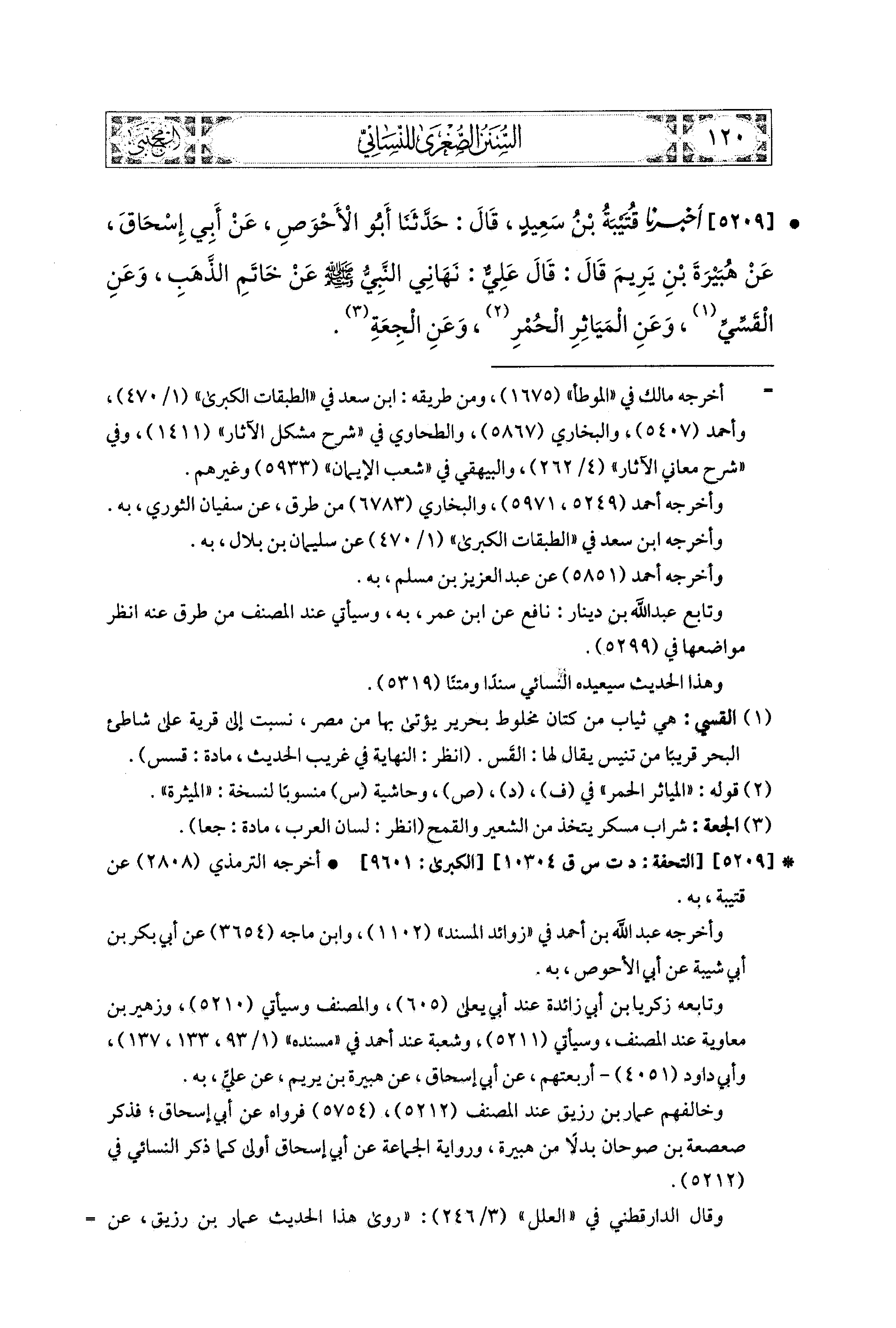 5209- أَخبَرَنا قُتَيبَةُ بنُ سَعِيدٍ، قال: حَدَّثنا أَبو الأَحْوَصِ، عَن أَبي إِسحَاقَ، عَن هُبَيْرَةَ بْنِ يَرِيمَ، قَالَ: قَالَ عَلِيٌّ: نَهَانِي النَّبيُّ صَلى الله عَليه وسَلم عَن خَاتَمِ الذَّهَبِ، وَعَنِ القَسِّيِّ، وَعَنِ المَيَاثِرِ الحُمْرِ، وَعَنِ الجِعَةِ.