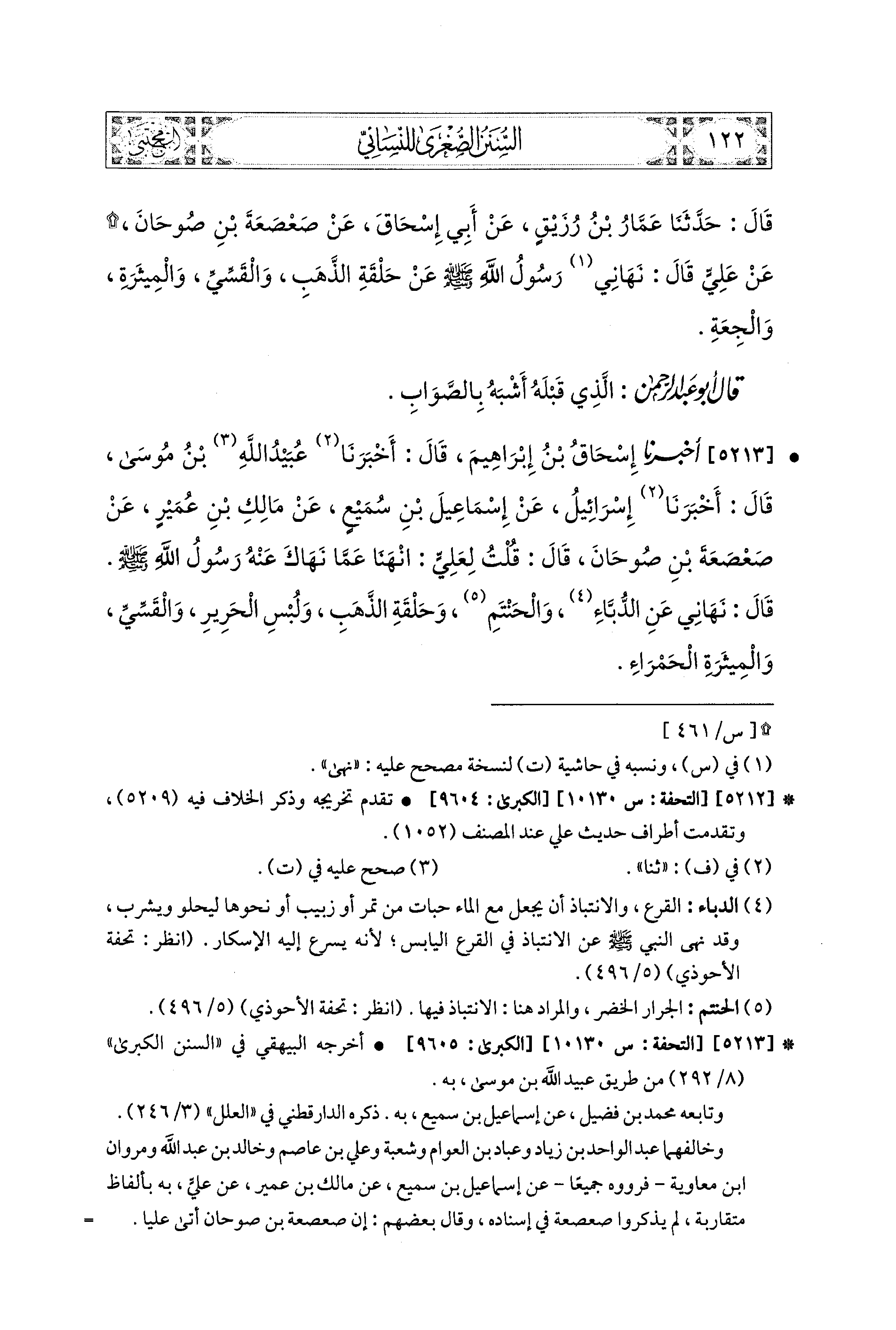 5213- أَخبَرَنا إِسحَاقُ بنُ إِبراهِيمَ، قَالَ: أَخبرنا عُبَيدُ اللهِ بنُ مُوسَى، قَالَ: أَخبرنا إِسْرَائِيلُ، عَن إِسماعِيلَ بْنِ سُمَيْعٍ، عَن مَالِكِ بْنِ عُمَيْرٍ، عَن صَعْصَعَةَ بْنِ صُوحَانَ، قَالَ: قُلْتُ لِعَلِيٍّ: انْهَنَا عَمَّا نَهَاكَ عَنهُ رَسُولُ اللهِ صَلى الله عَليه وسَلم قَالَ: نَهَانِي عَنِ الدُّبَّاءِ، وَالحَنْتَمِ، وَحَلْقَةِ الذَّهَبِ، وَلُبْسِ الحَرِيرِ، وَالقَسِّيِّ، وَالمِيثَرَةِ الحَمْرَاءِ.