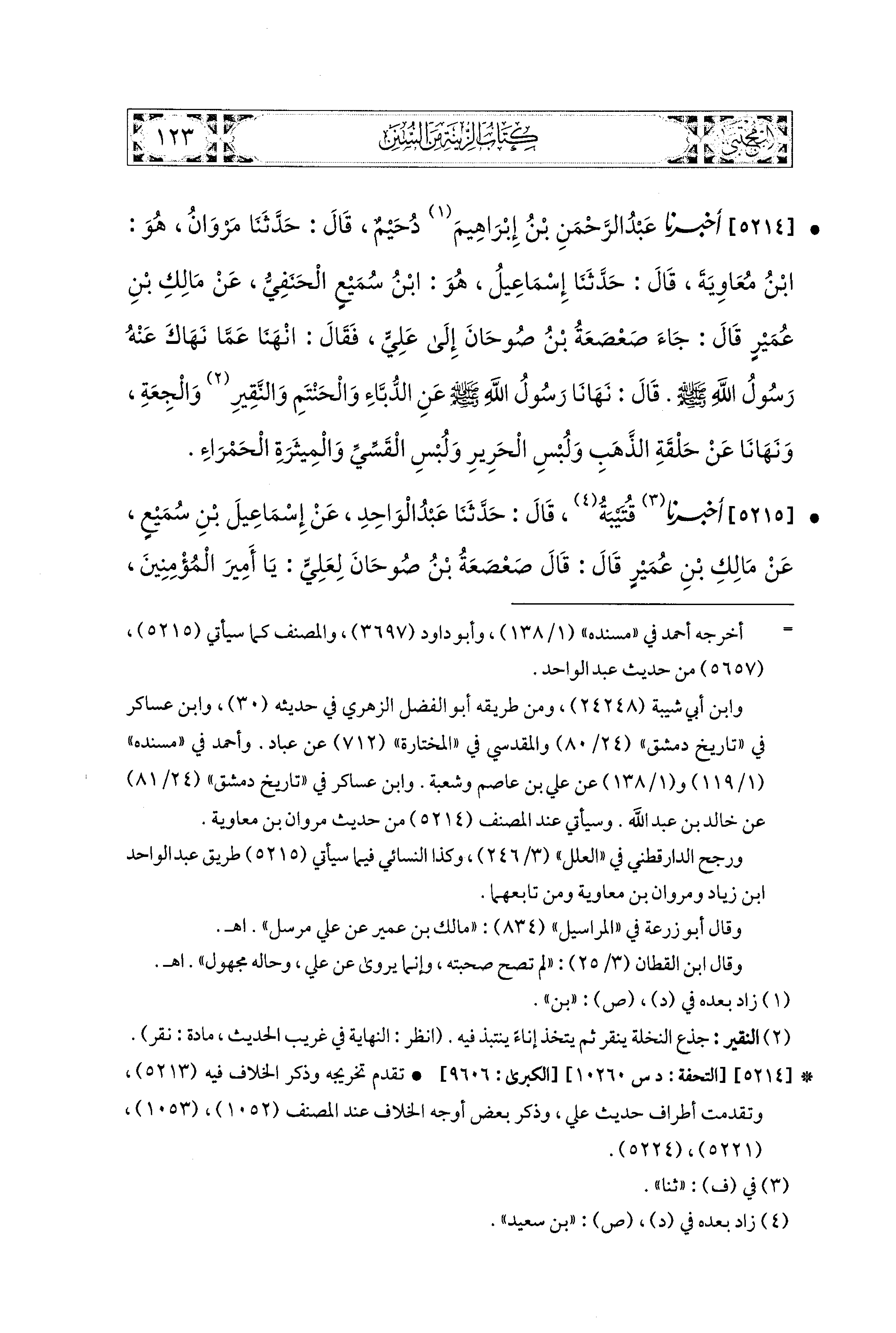 5214- أَخبَرَنا عَبدُ الرَّحْمَنِ بنُ إِبراهِيمَ دُحَيْمٌ، قال: حَدَّثنا مَرْوَانُ، هُوَ ابنُ مُعَاوِيَةَ، قال: حَدَّثنا إِسماعِيلُ، هُوَ ابنُ سُمَيْعٍ الحَنَفِيُّ، عَن مَالِكِ بْنِ عُمَيْرٍ، قَالَ: جَاءَ صَعْصَعَةُ بنُ صُوحَانَ إِلَى عَلِيٍّ فَقَالَ: انْهَنَا عَمَّا نَهَاكَ عَنهُ رَسُولُ اللهِ صَلى الله عَليه وسَلم قَالَ: نَهَانَا رَسُولُ اللهِ صَلى الله عَليه وسَلم عَنِ الدُّبَّاءِ، وَالحَنْتَمِ، وَالنَّقِيرِ، وَالجِعَةِ، وَنَهَانَا عَن حَلْقَةِ الذَّهَبِ، وَلُبْسِ الحَرِيرِ، وَلُبْسِ القَسِّيِّ، وَالمِيثَرَةِ الحَمْرَاءِ.