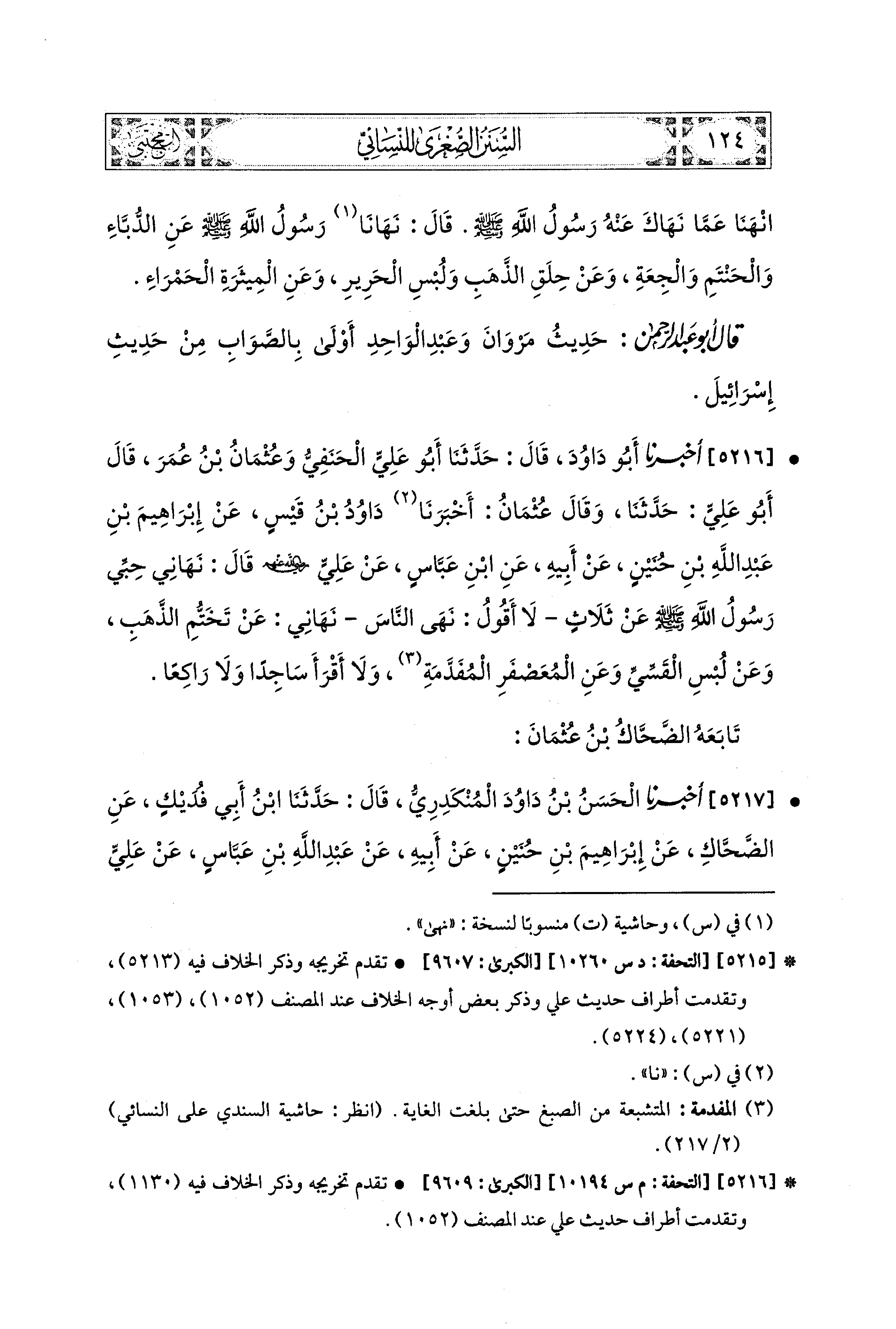 5216- أَخبَرَنا أَبو دَاوُدَ، قال: حَدَّثنا أَبو عَلِيٍّ الحَنَفِيُّ، وَعُثْمَانُ بنُ عُمَرَ، قَالَ أَبو عَلِيٍّ: حَدَّثَنَا، وَقَال عُثْمَانُ: أَخبرنا دَاوُدُ بنُ قَيْسٍ، عَن إِبراهِيمَ بْنِ عَبدِ اللهِ بْنِ حُنَيْنٍ، عَن أَبيهِ، عَنِ ابنِ عَبَّاسٍ، عَن عَلِيٍّ, رضي الله عنهم قَالَ: نَهَانِي حِبِّي رَسُولُ اللهِ صَلى الله عَليه وسَلم عَن ثَلاَثٍ:- لاَ أَقُولُ نَهَى النَّاسَ- نَهَانِي عَن تَخَتُّمِ الذَّهَبِ، وَعَن لُبْسِ القَسِّيِّ، وَعَنِ المُعَصْفَرِ المُفَدَّمَةِ، وَلاَ أَقْرَأُ سَاجِدًا، وَلاَ رَاكِعًا.