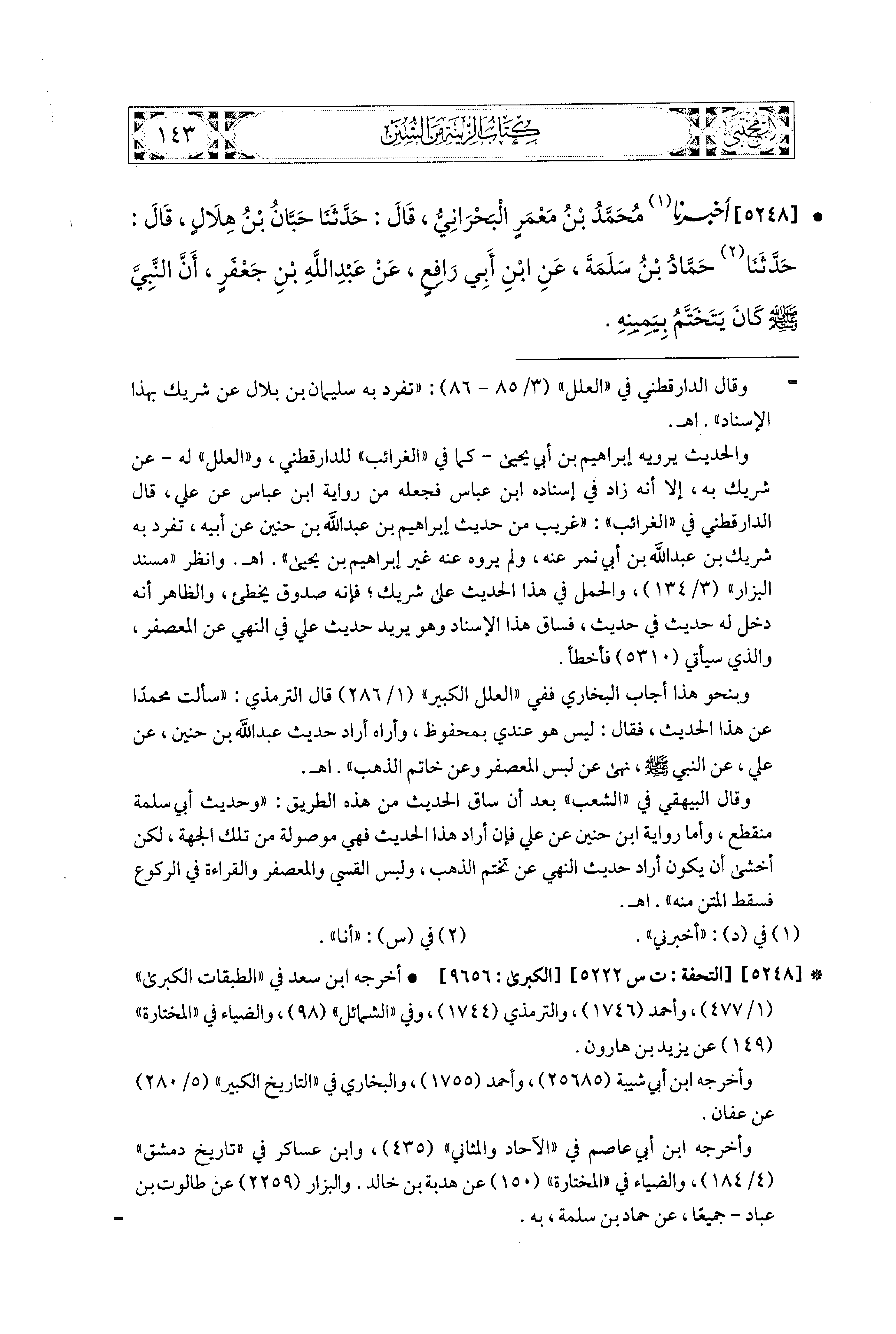 5248- أَخبَرَنا مُحَمد بنُ مَعْمَرٍ البَحْرَانِيُّ، قال: حَدَّثنا حَبَّانُ بنُ هِلاَلٍ، قال: حَدَّثنا حَمَّادُ بنُ سَلَمَةَ، عَنِ ابنِ أَبي رَافِعٍ، عَن عَبد اللهِ بن جَعْفَرٍ، أَنَّ النَّبيَّ صَلى الله عَليه وسَلم كَانَ يَتَخَتَّمُ بِيَمِينِهِ.