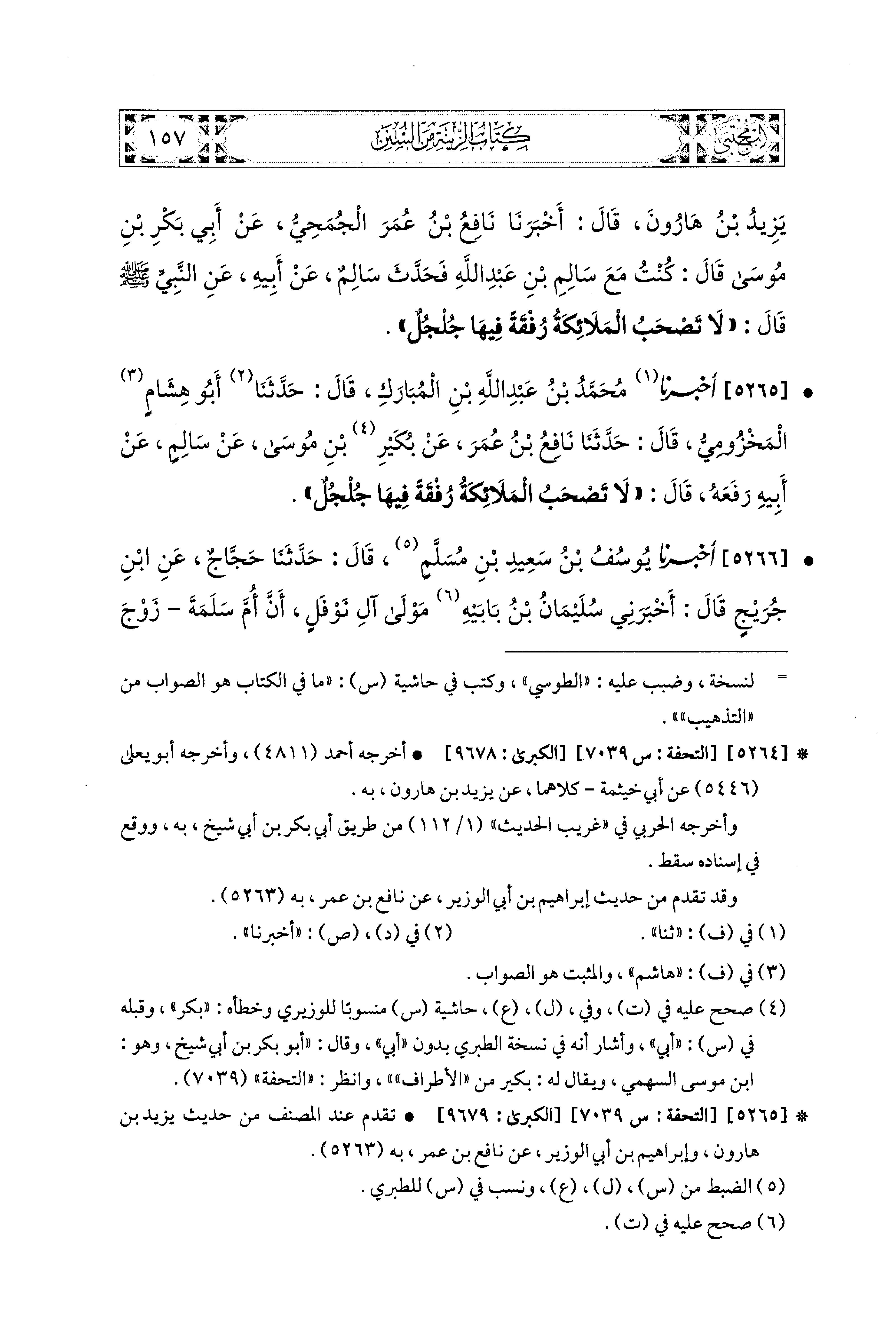5265- أَخبَرَنا مُحَمد بنُ عَبدِ اللهِ بْنِ المُبَارَكِ، قال: حَدَّثنا أَبو هِشَامٍ المَخْزُومِيُّ، قال: حَدَّثنا نَافِعُ بنُ عُمَرَ، عَن بُكَيْرِ بْنِ مُوسَى، عَن سَالِمٍ، عَن أَبيهِ، رَفَعَهُ قَالَ: لاَ تَصْحَبُ المَلاَئِكَةُ رُفْقَةً فِيهَا جُلْجُلٌ.