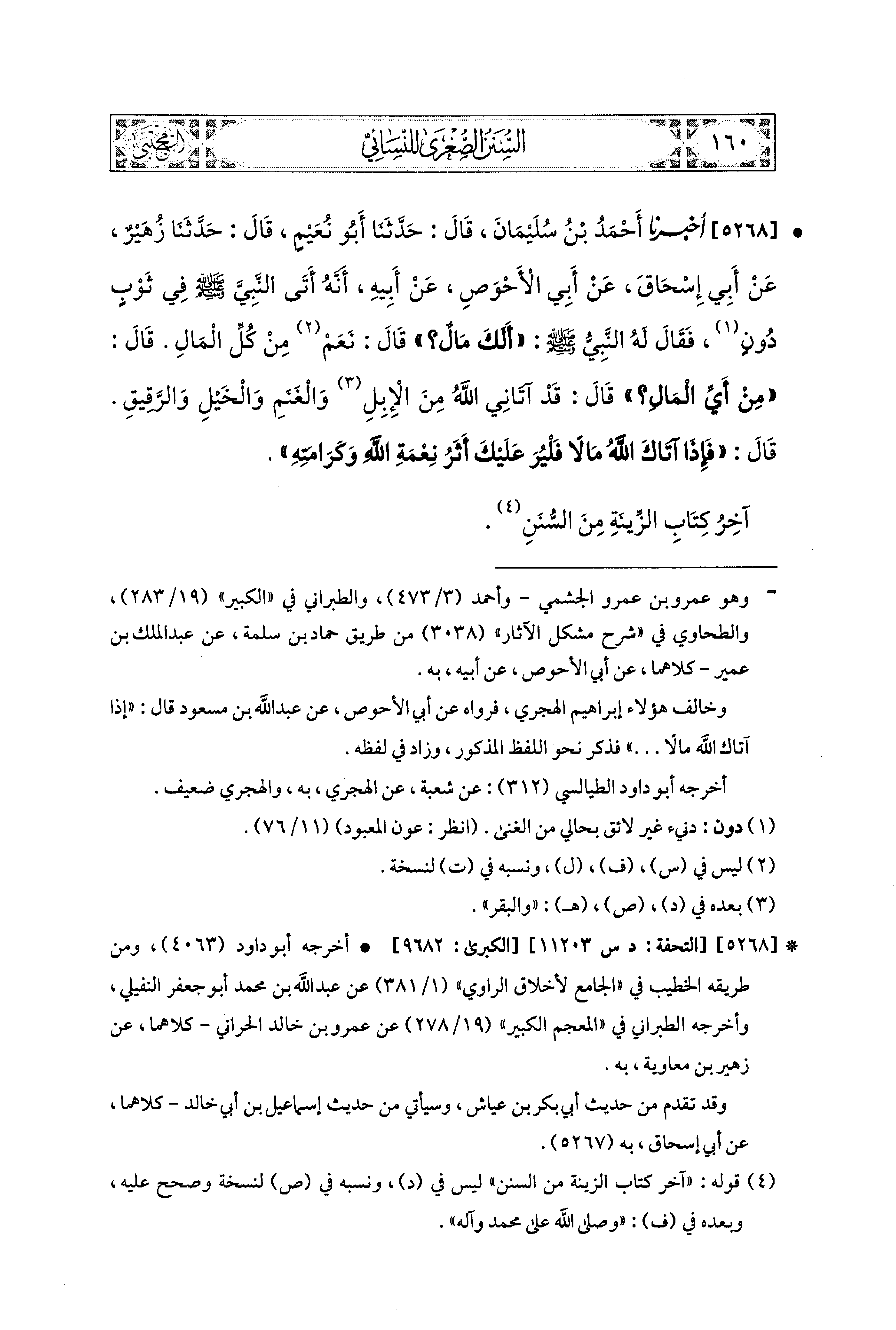 5268 - أَخبَرَنا أَحْمَدُ بنُ سُلَيمَانَ، قال: حَدَّثنا أَبو نُعَيْمٍ، قال: حَدَّثنا زُهَيْرٌ، عَن أَبي إِسحَاقَ، عَن أَبي الأَحْوَصِ، عَن أَبيهِ، أَنَّهُ أَتَى النَّبيَّ صَلى الله عَليه وسَلم فِي ثَوْبٍ دُونٍ، فَقَالَ لَهُ النَّبيُّ صَلى الله عَليه وسَلم: أَلَكَ مَالٌ؟ قَالَ: نَعَمْ، مِنْ كُلِّ المَالِ، قَالَ: مِنْ أَيِّ المَالِ؟ قَالَ: قَدْ آتَانِي اللهُ مِنَ الإِبِلِ، وَالغَنَمِ، وَالخَيْلِ، وَالرَّقِيقِ، قَالَ: فَإِذَا آتَاكَ اللهُ مَالاً، فَلْيُرَ عَلَيْكَ أَثَرُ نِعْمَةِ اللهِ وَكَرَامَتِهِ.